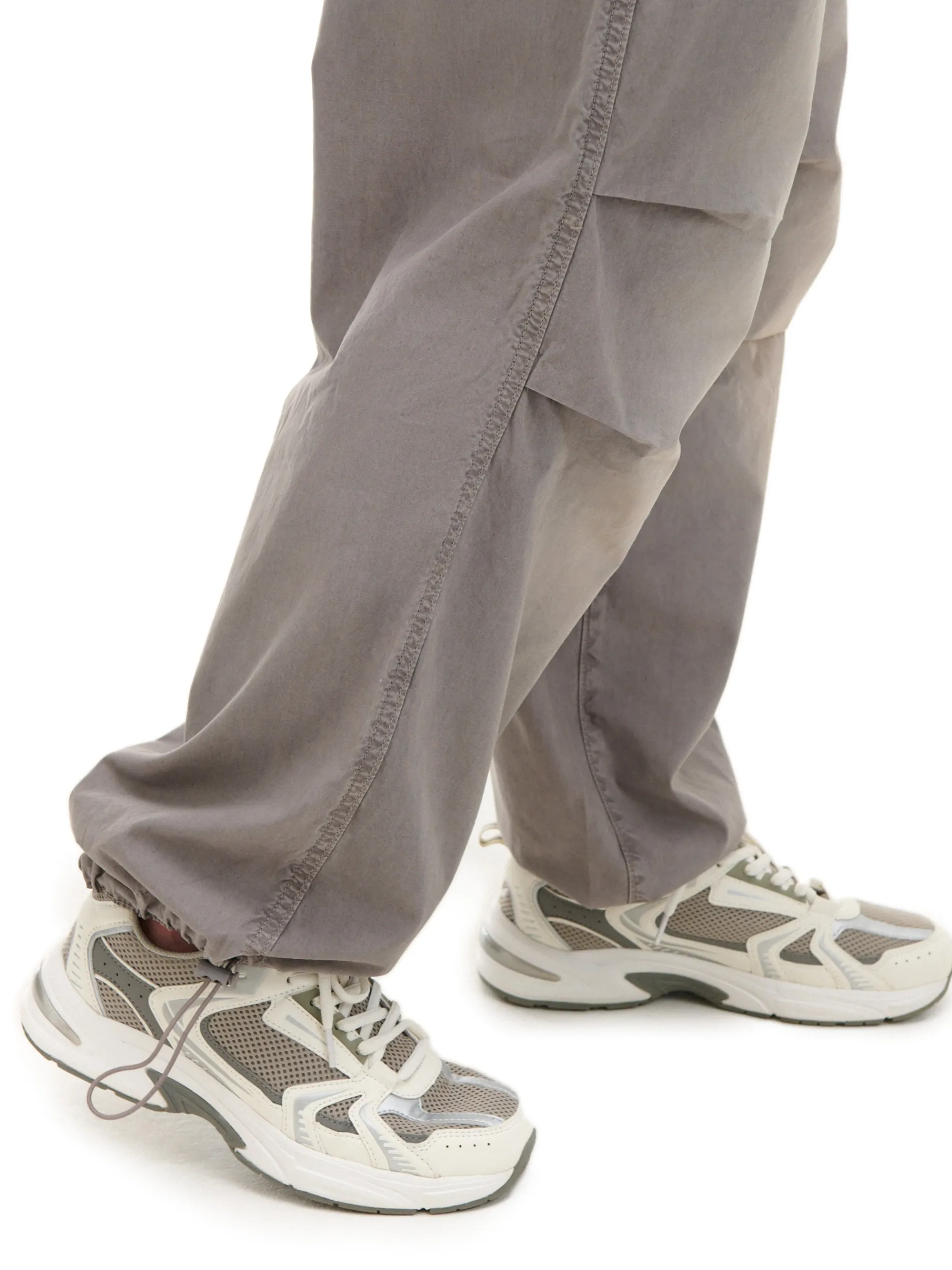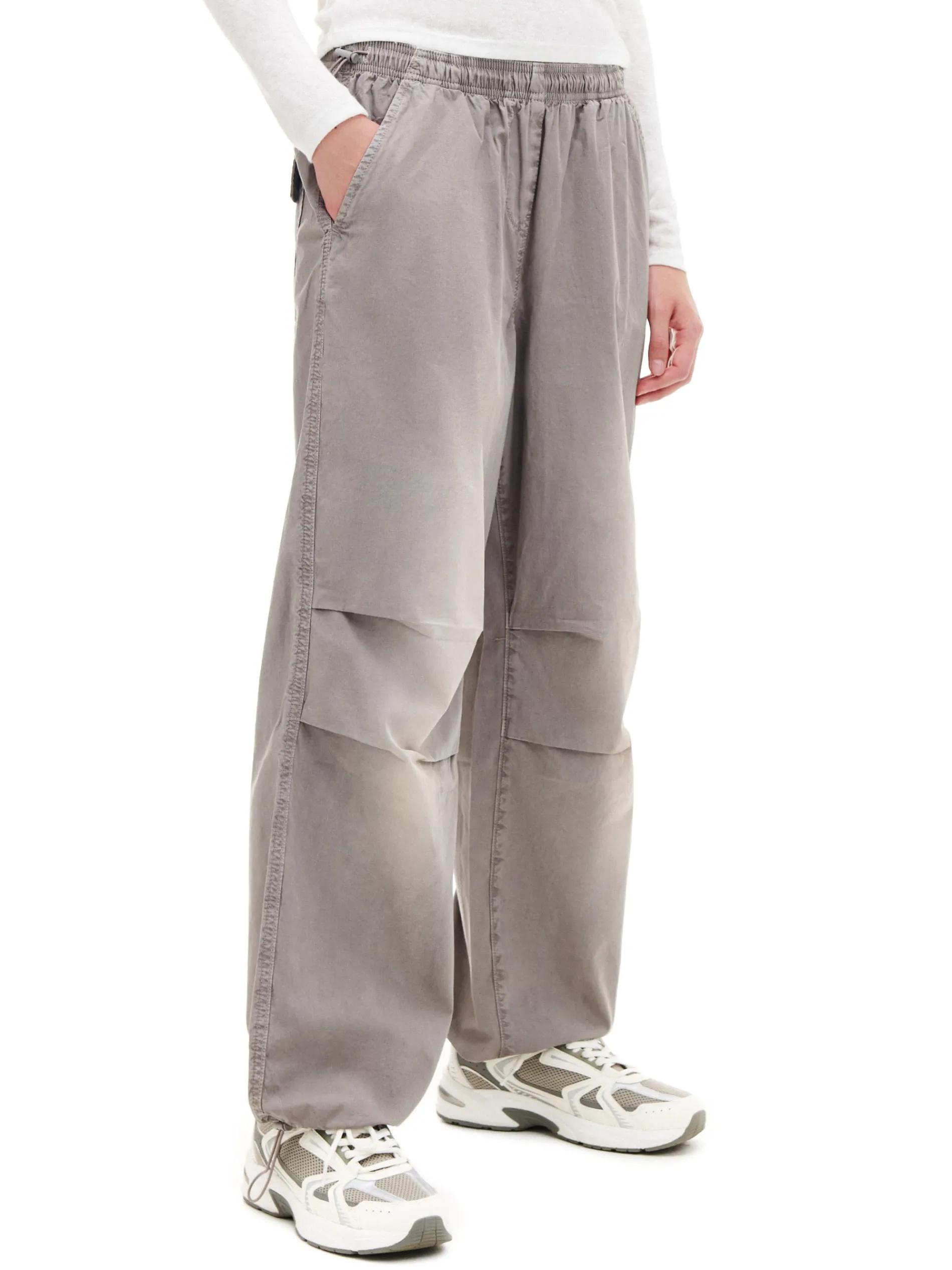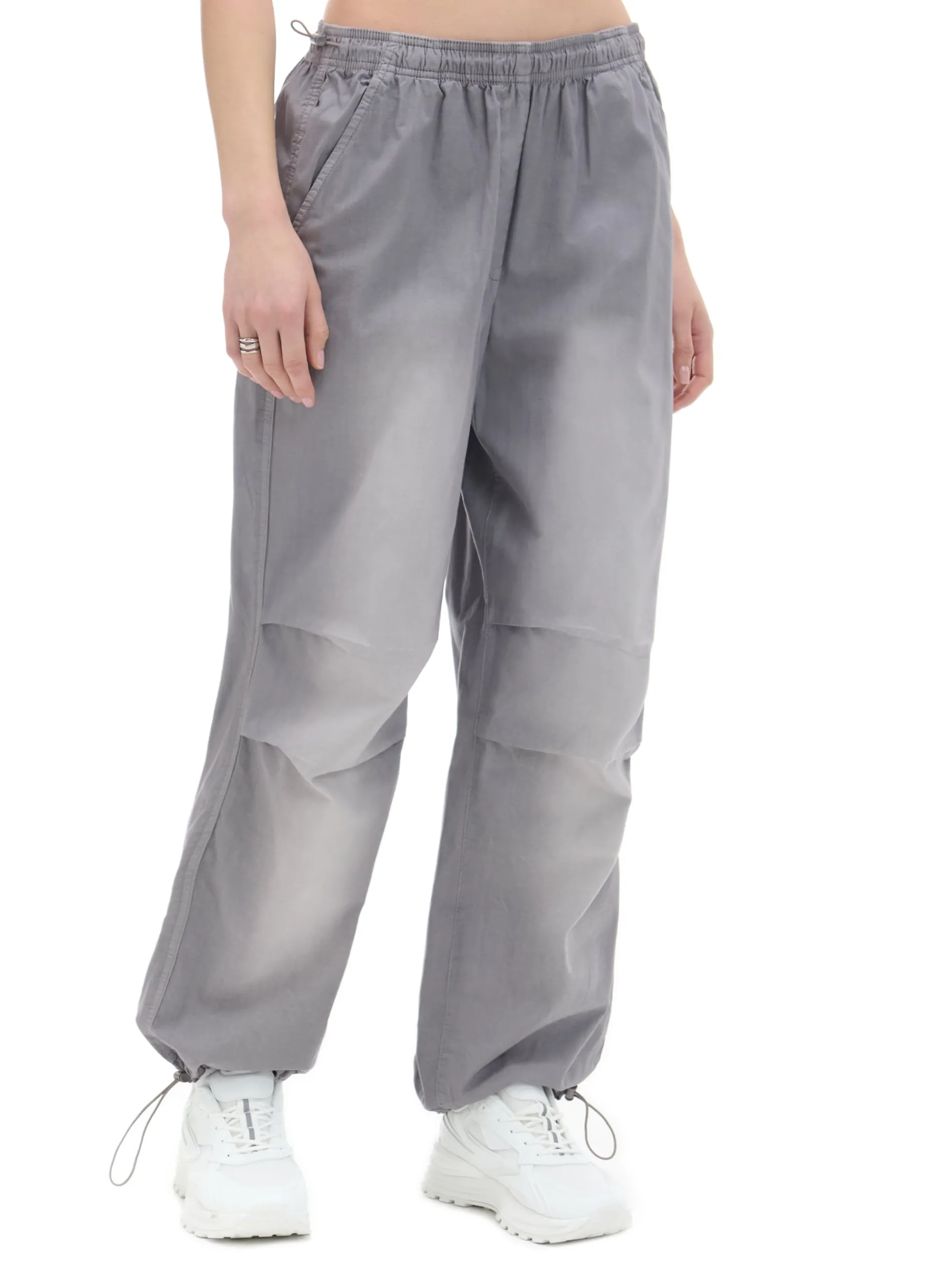 Spodnie damskie w stylu parachute, nazywane też spadochronowymi. Uszyte z bawełnianej tkaniny. luźny fason w pasie elastyczna gumka ze stoperami do regulacji 4 kieszenie swobodne nogawki z regulacją u dołu dostępne inne warianty kolorystyczne Wzrost modelki: 177 cm