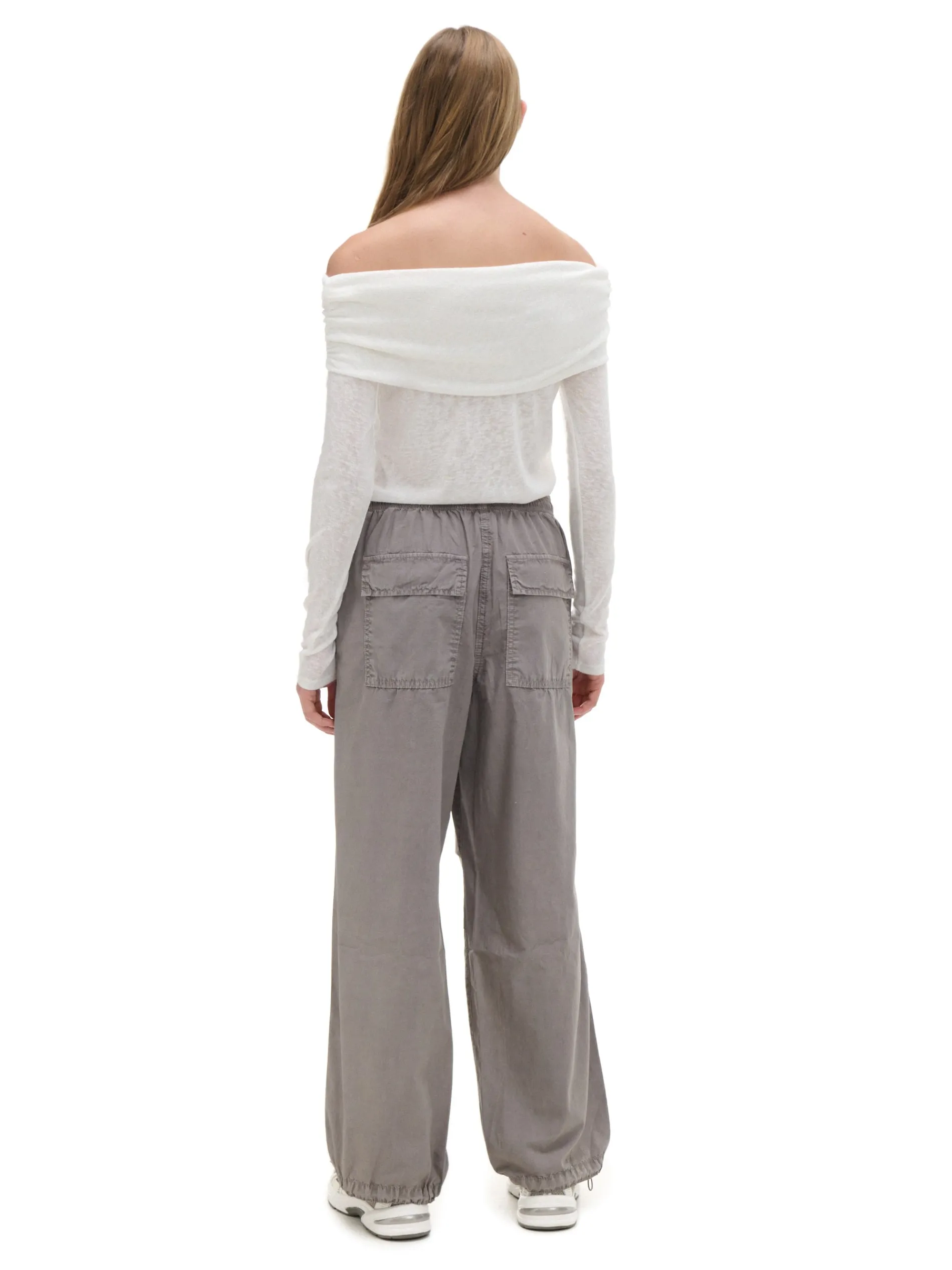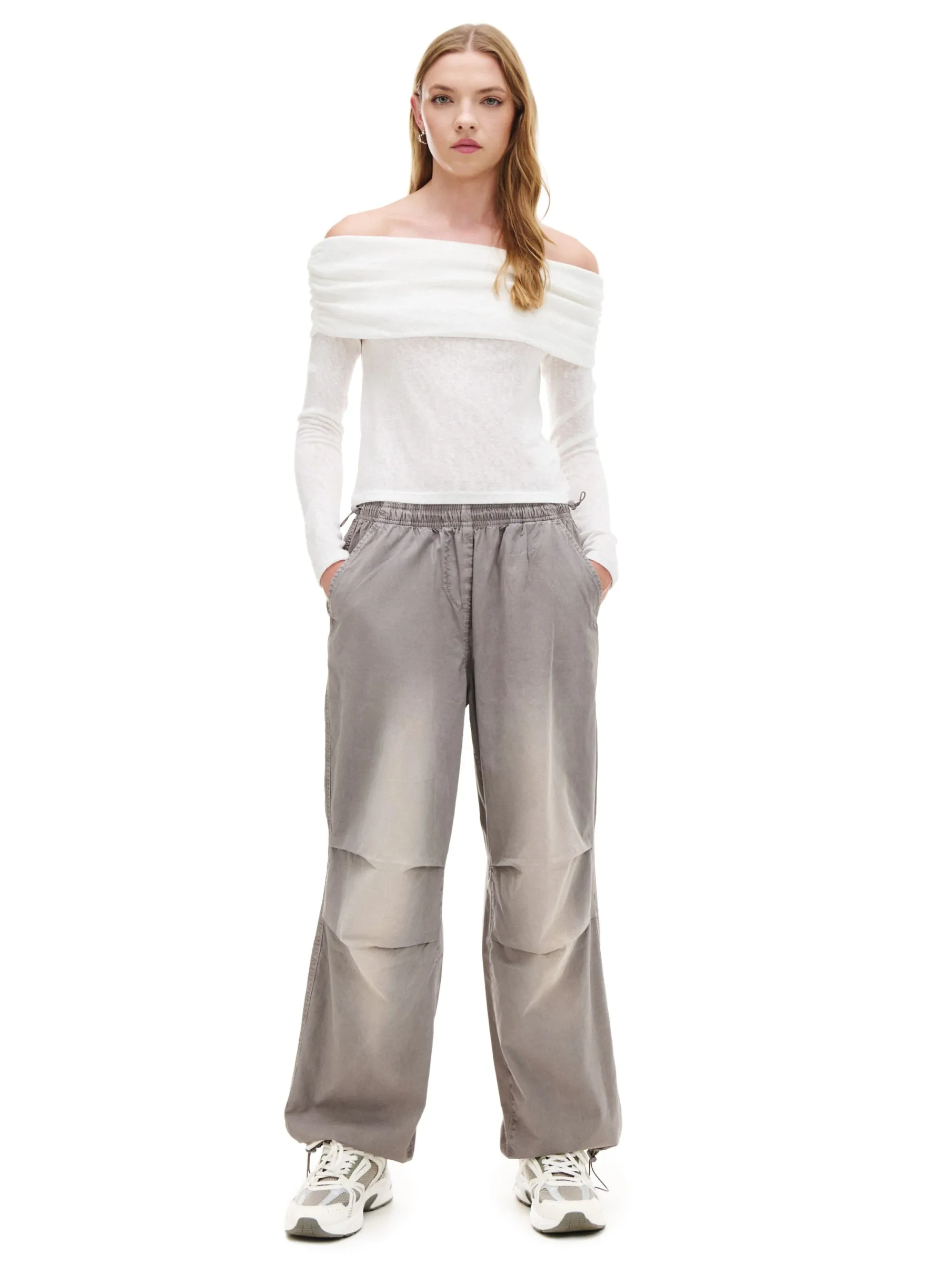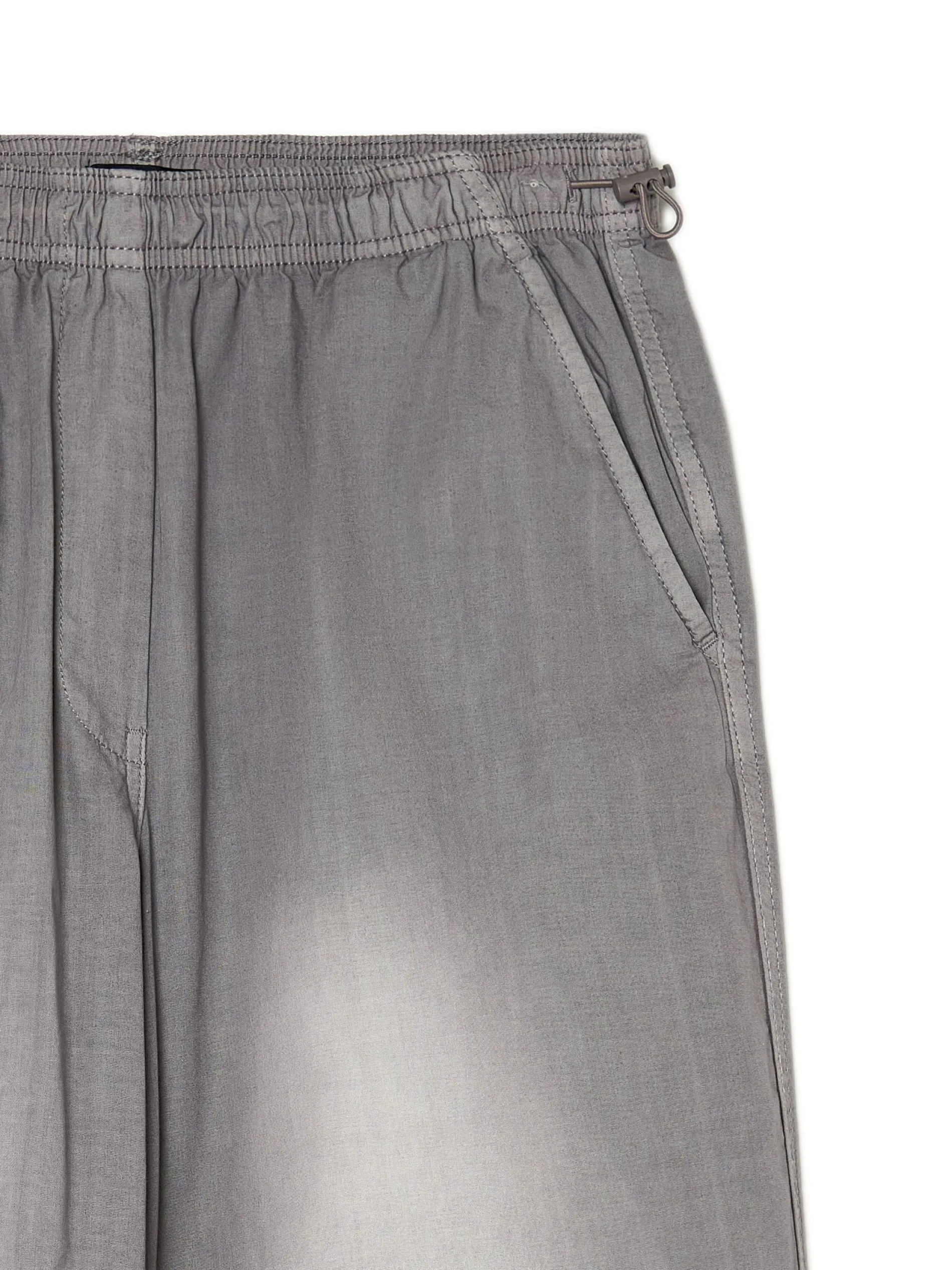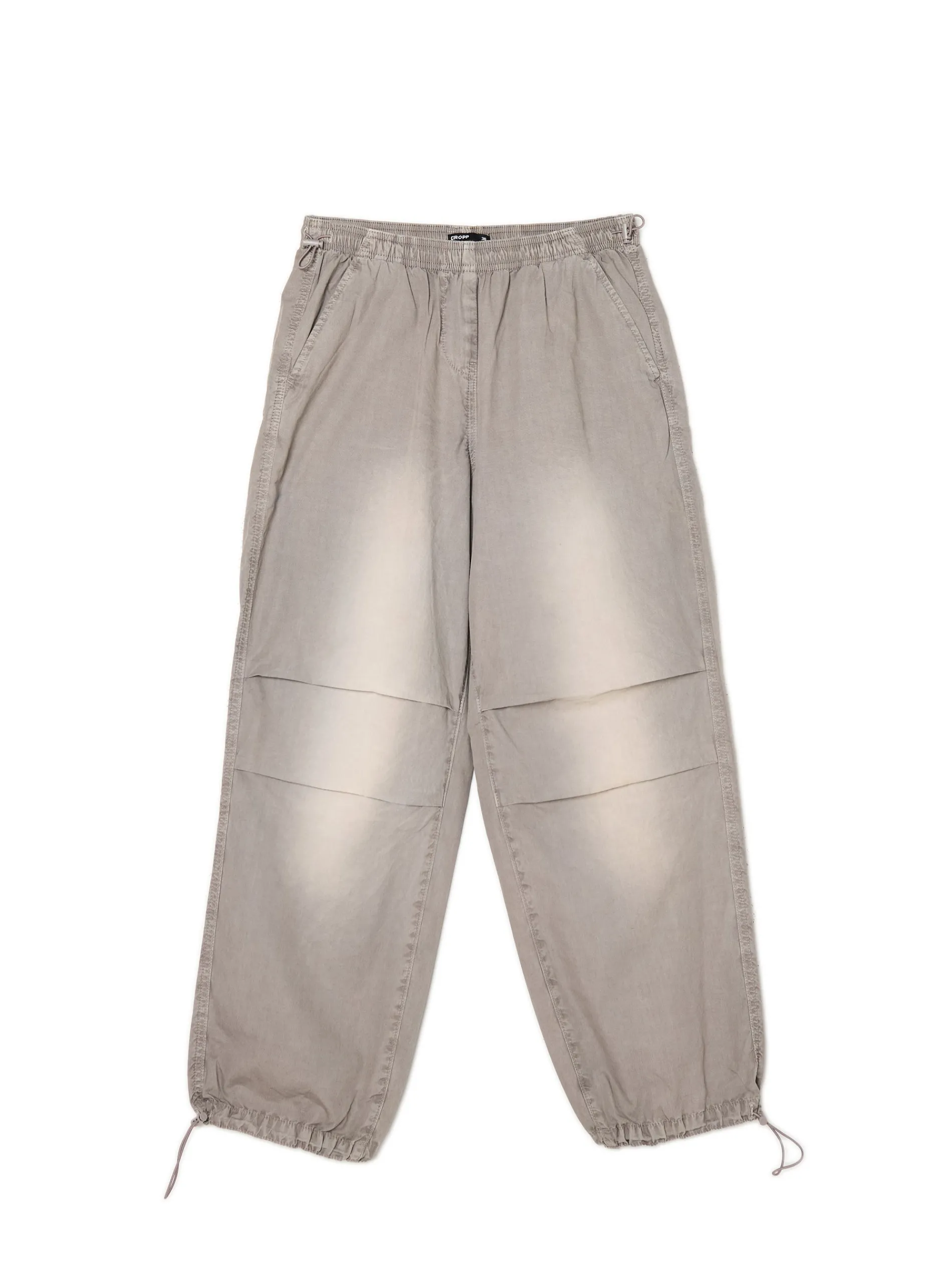 Spodnie damskie w stylu parachute, nazywane też spadochronowymi. Uszyte z bawełnianej tkaniny. luźny fason w pasie elastyczna gumka ze stoperami do regulacji 4 kieszenie swobodne nogawki z regulacją u dołu dostępne inne warianty kolorystyczne Wzrost modelki: 177 cm