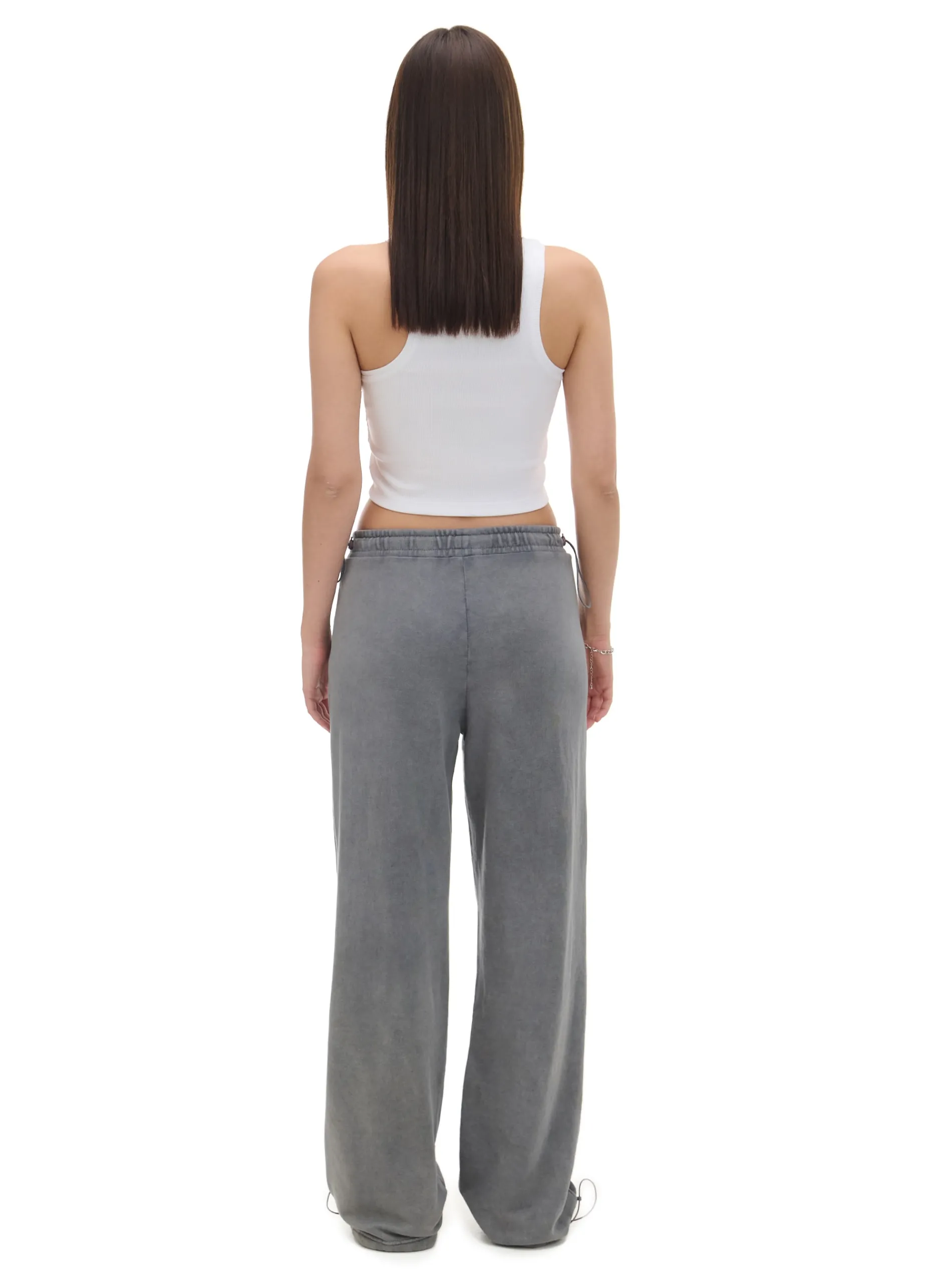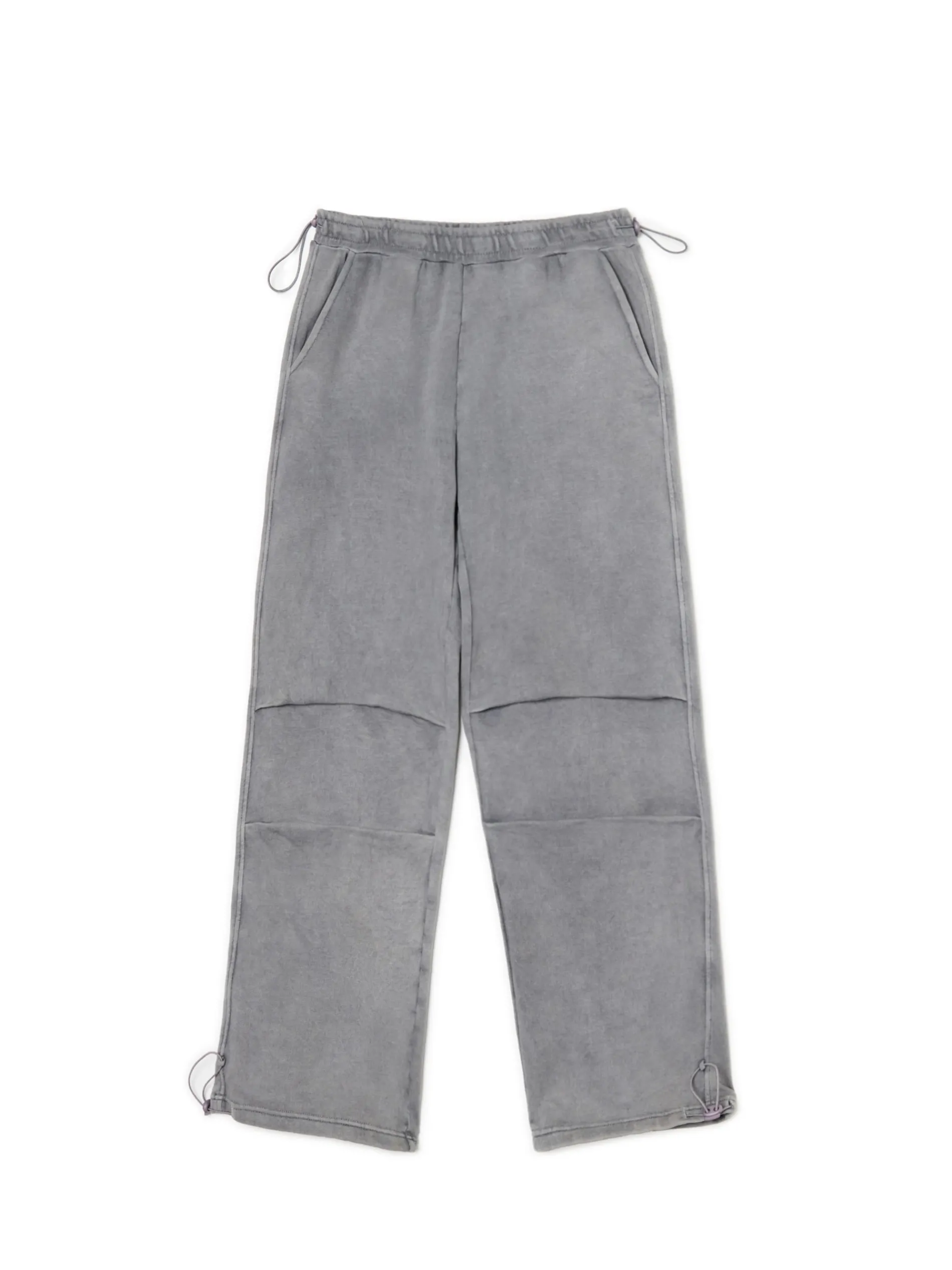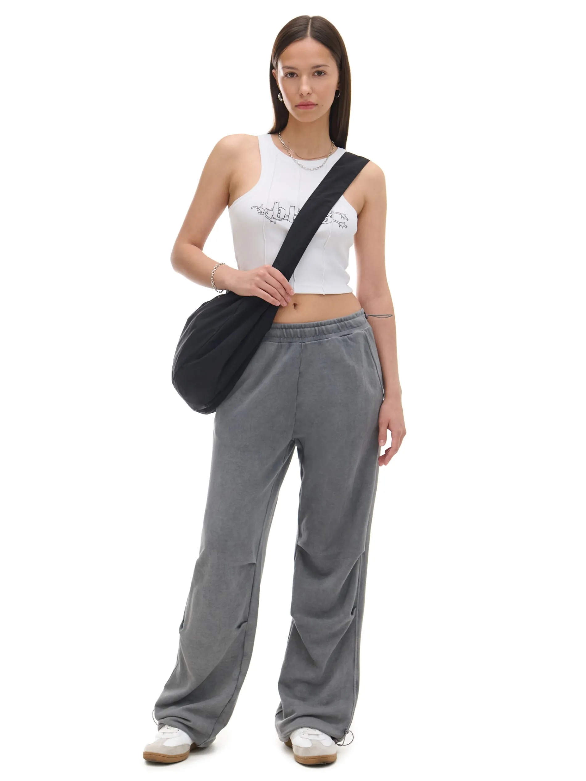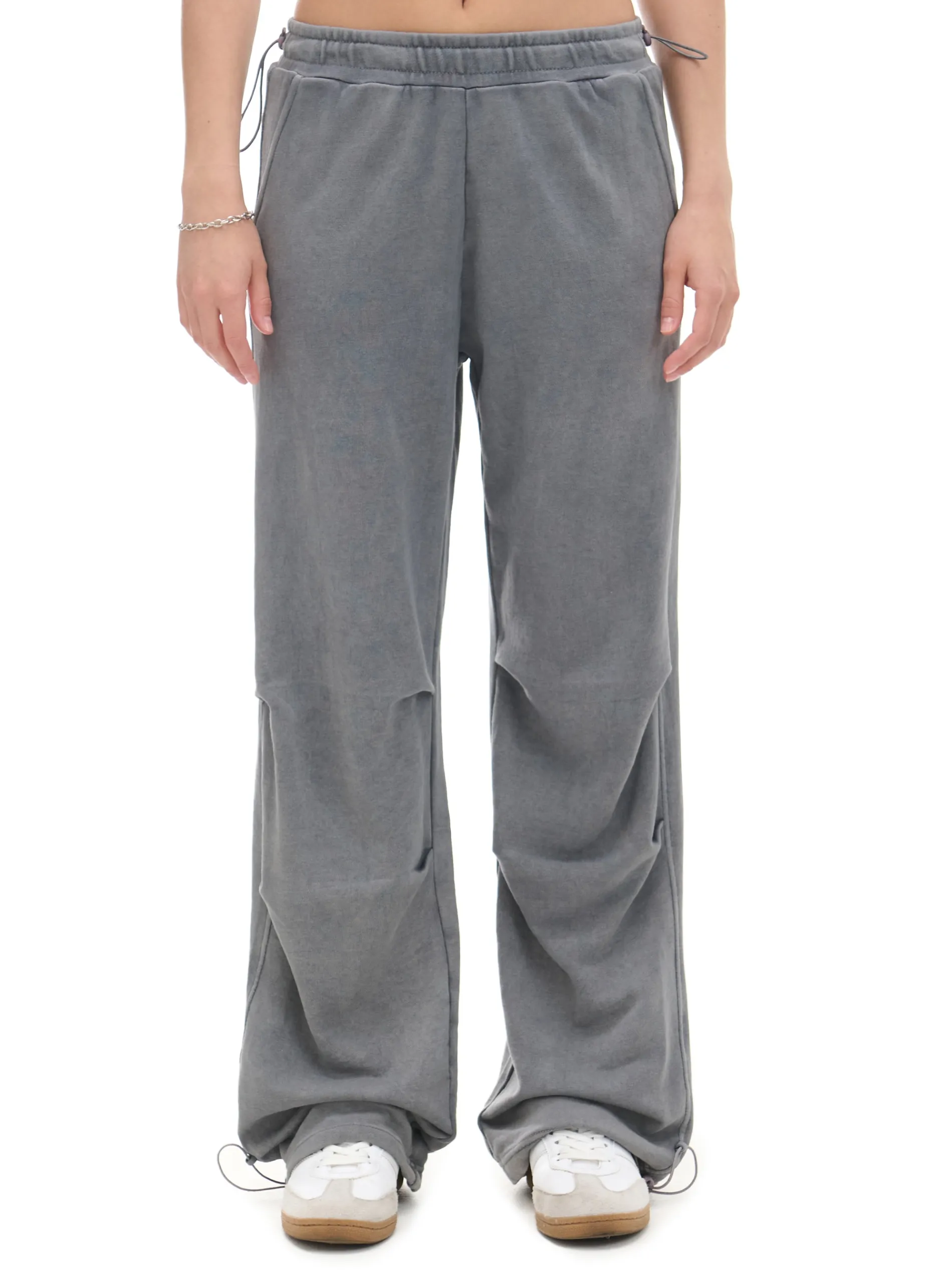 Damskie spodnie typu parachute uszyte z trwałej dzianiny z dodatkiem bawełny. Item wyposażony w elastyczne gumy w pasie i przy nogawkach, regulowane za pomocą stoperów. Dobierz do nich ulubione topy! dzianinowy materiał z bawełną długie, swobodne nogawki wykończone ściągaczem regulacja dołu i pasa za pomocą sznurka ze stoperem elastyczna gumka w pasie otwarte kieszenie z przodu ozdobne zakładki
