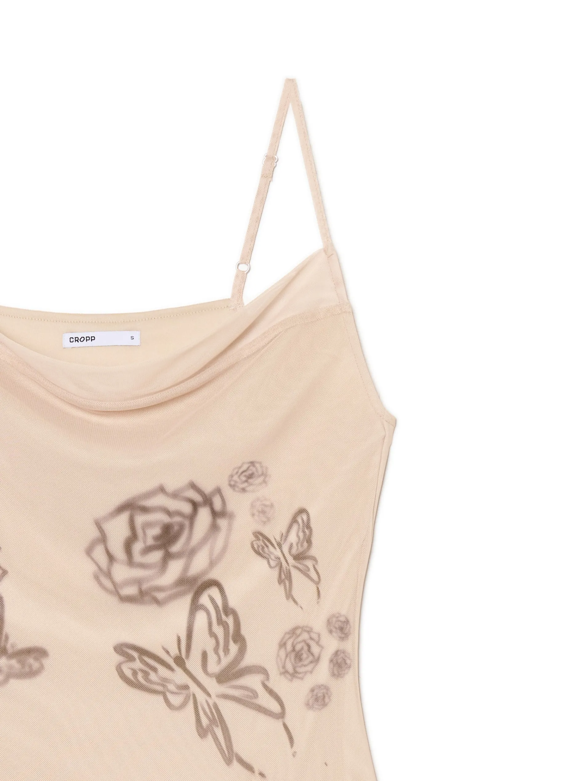 Lekka, krótka sukienka, uszyta z beżowej dzianiny z dodatkiem elastycznych włókien. krój litery A długość mini bardzo cienkie, regulowane ramiączka dekolt typu woda nadruk z motywem róż na wysokości biustu i talii gładka podszewka ozdobnie wykończony dolny brzeg