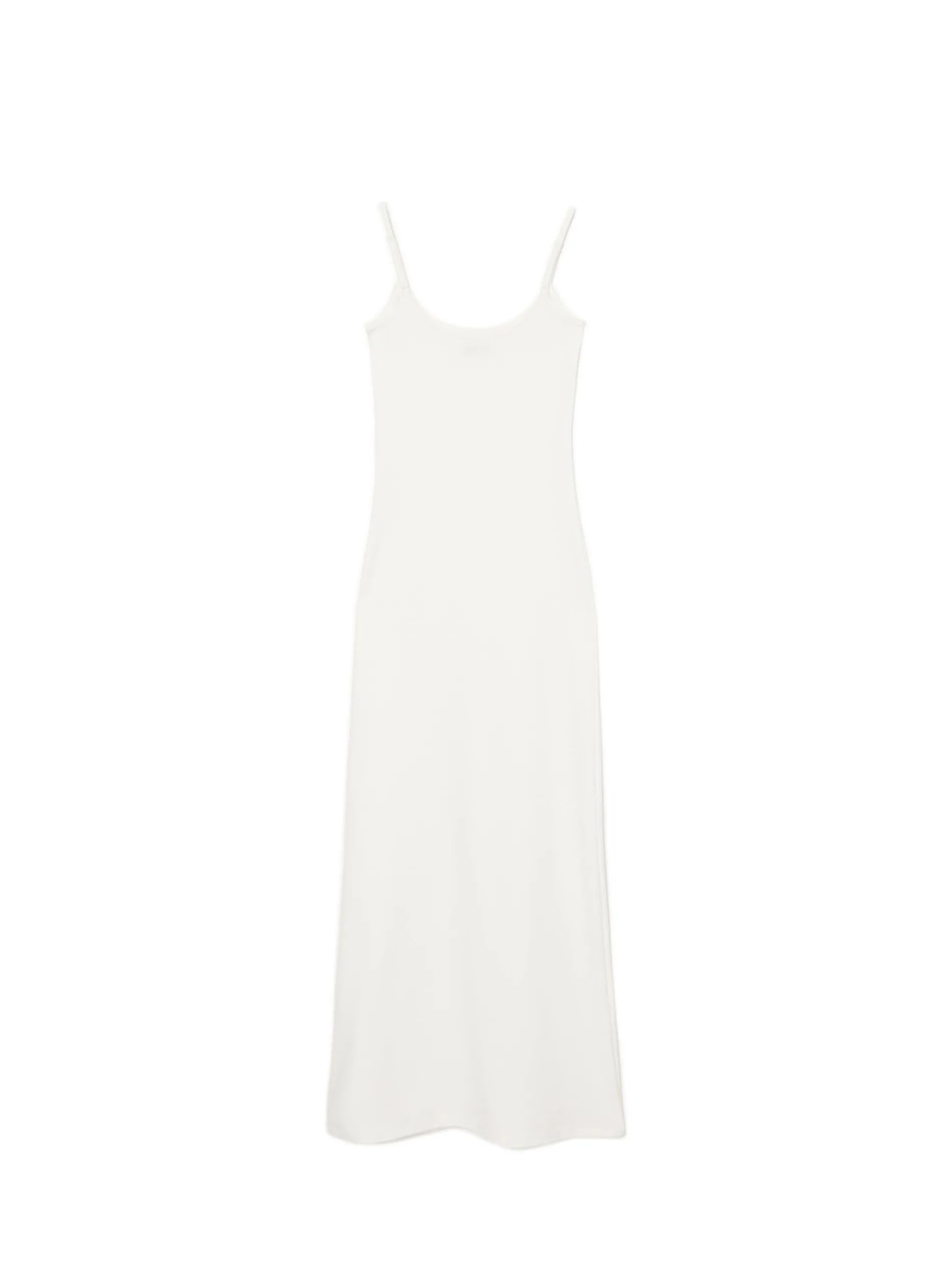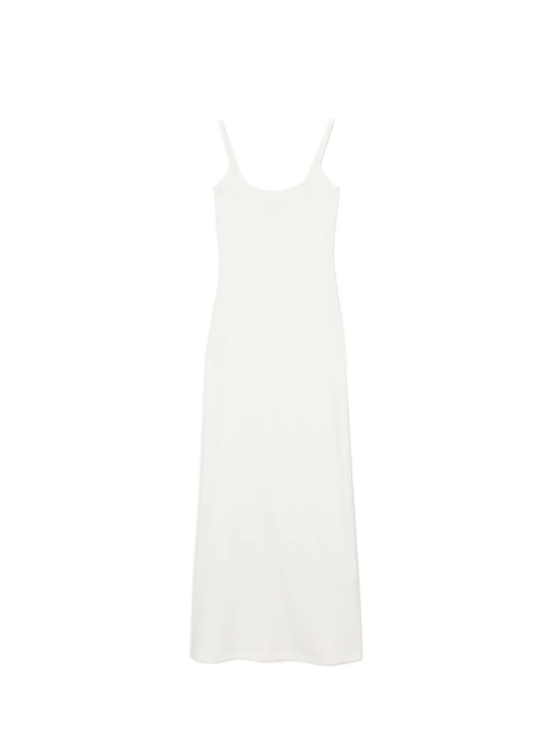Długa sukienka, uszyta z białej dzianiny. dzianina z domieszką elastycznych włókien długość maxi dopasowany krój podkreślający sylwetkę okrągły dekolt wąskie ramiączka z regulacją długości