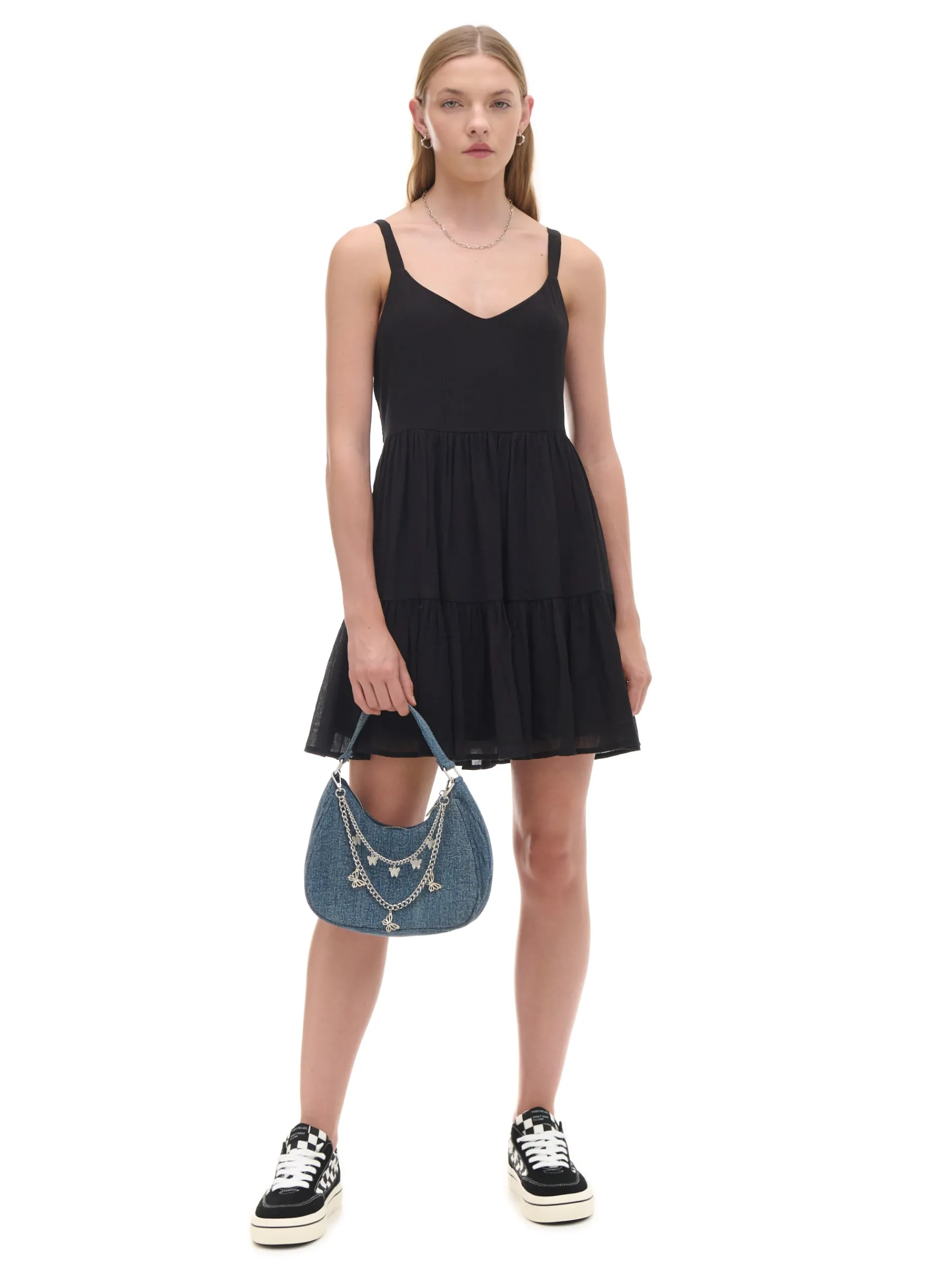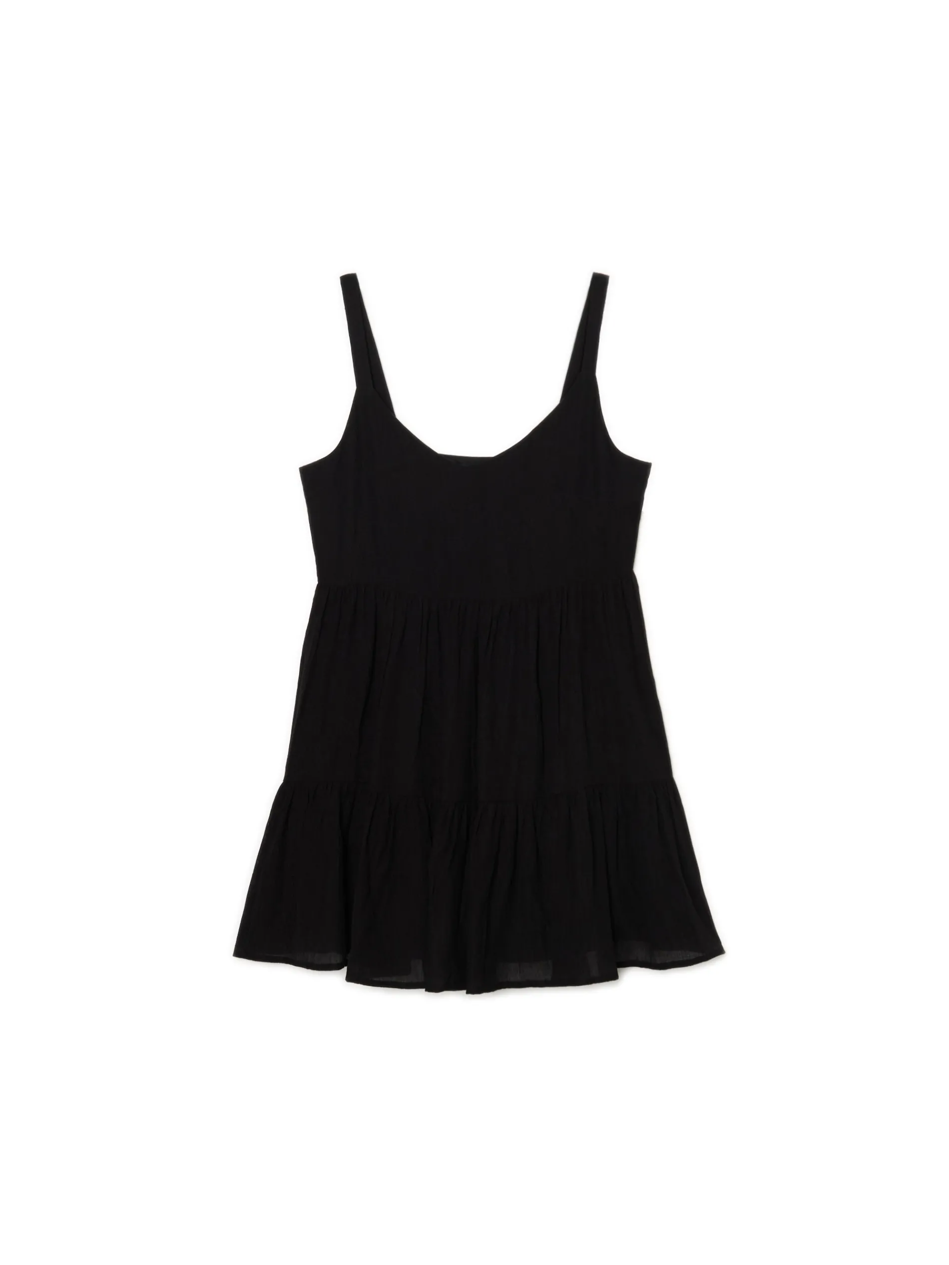 Krótka sukienka, uszyta z lekkiej tkaniny o bardzo wysokiej zawartości wiskozy. Idealna, by poczuć w niej summertime sadness. luźny, letni krój modna długość mini głęboki dekolt w kształcie litery V odcięcie pod biustem z elastyczną gumką cienkie ramiączka spódnica wykończona falbaną