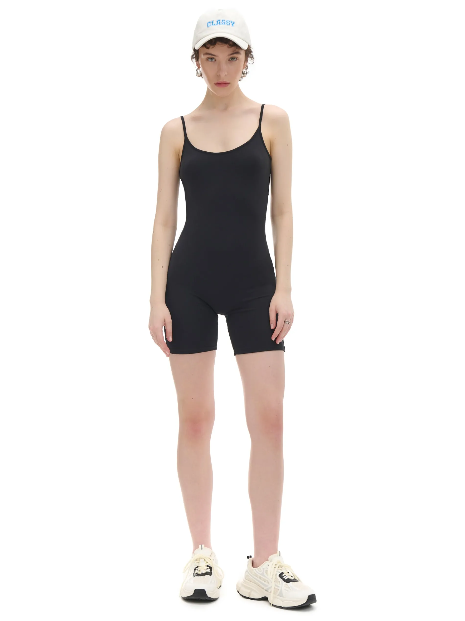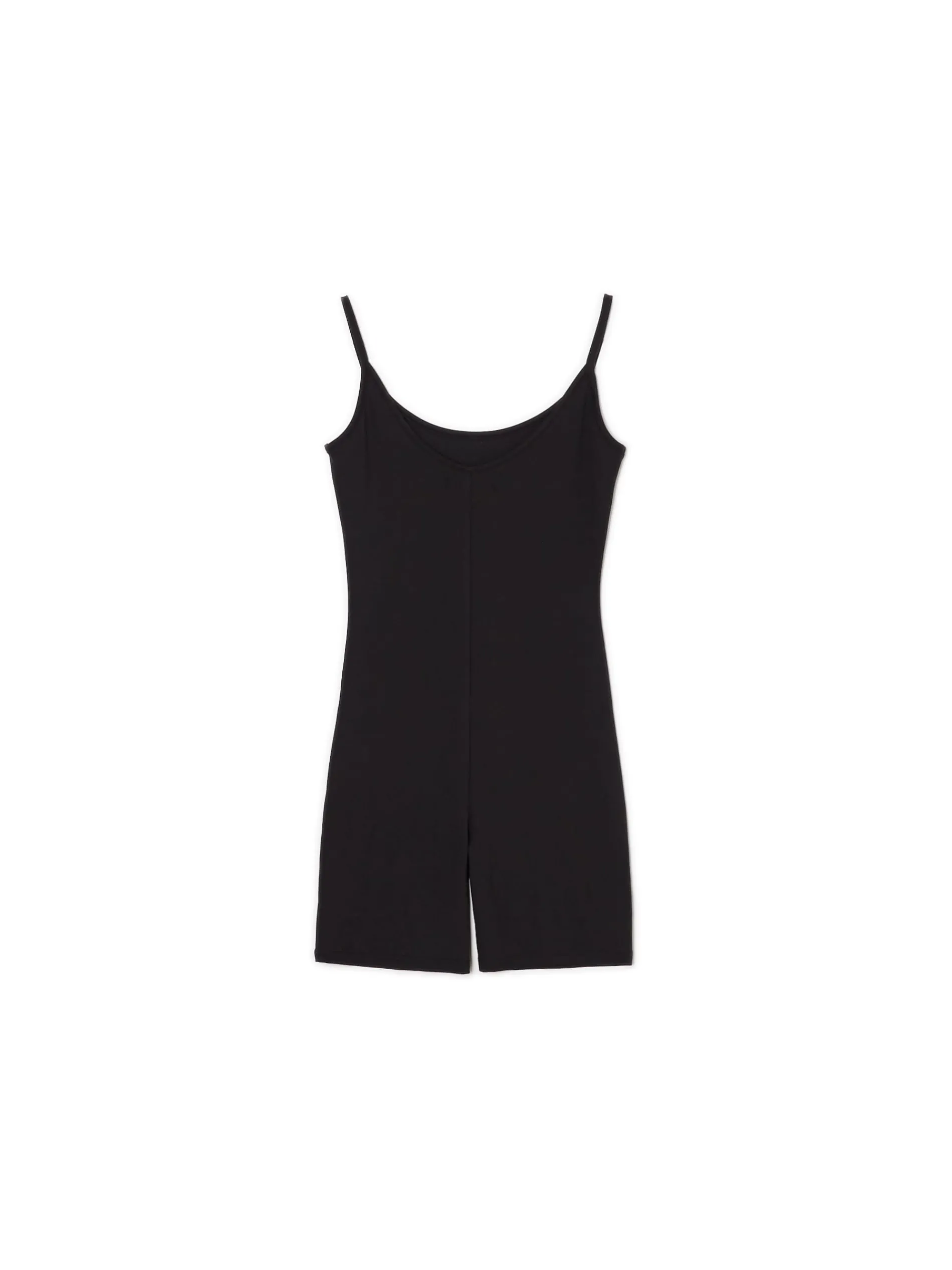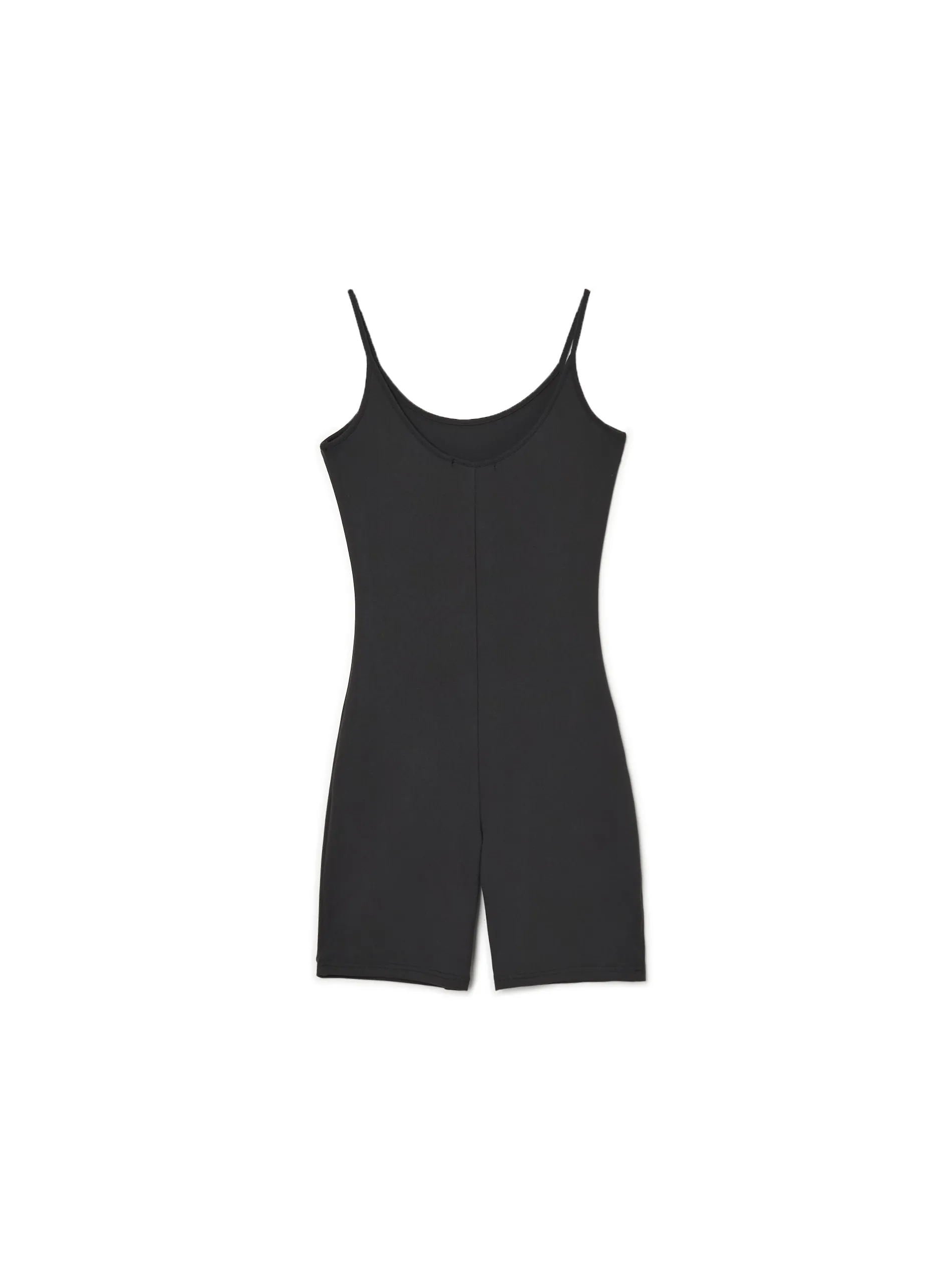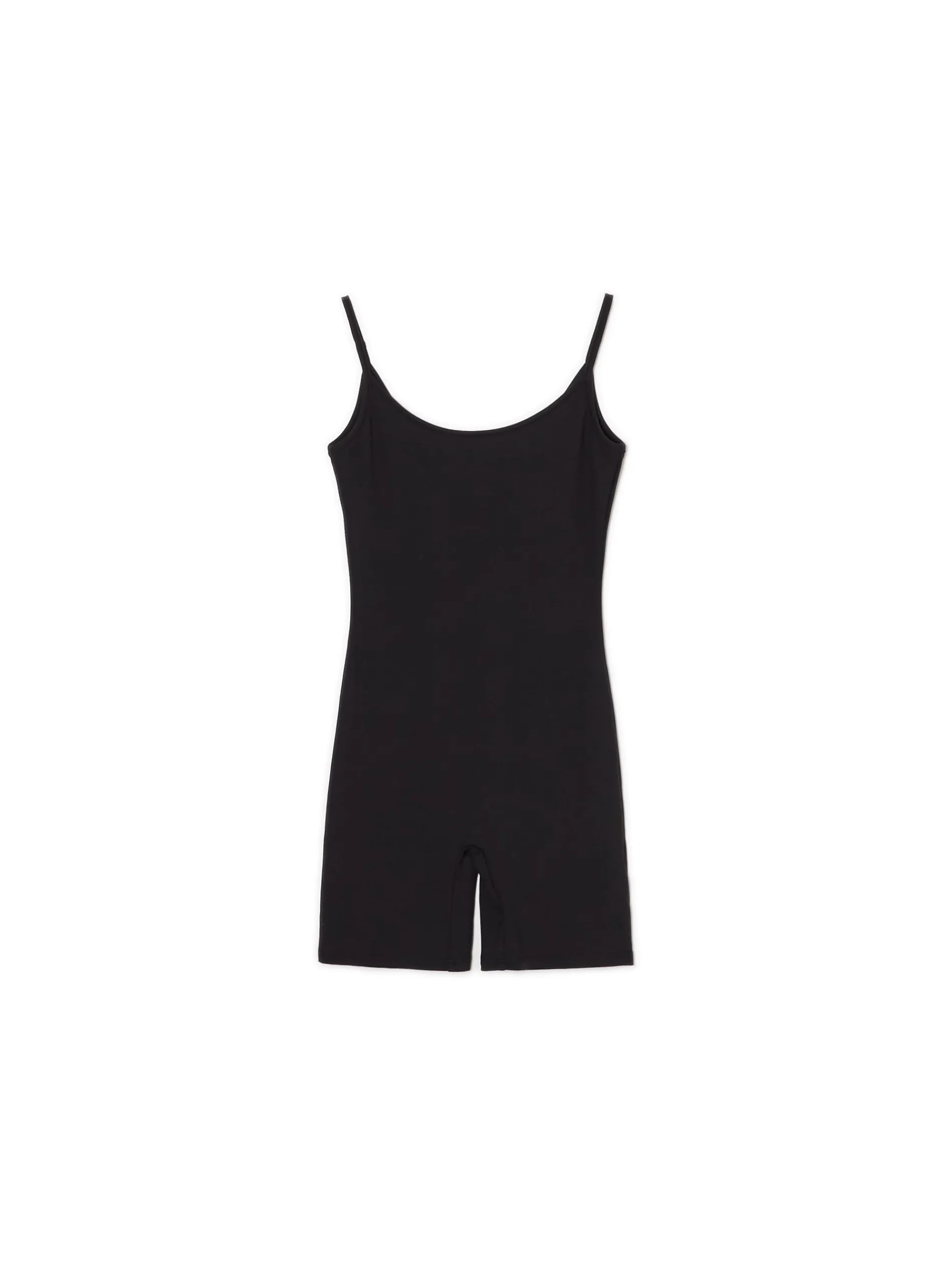 Damski kombinezon, uszyty z dzianiny z domieszką włókien elastycznych. mocno dopasowany krój okrągły dekolt cienkie ramiączka krótkie, dopasowane nogawki Wzrost modelki: 176 cm