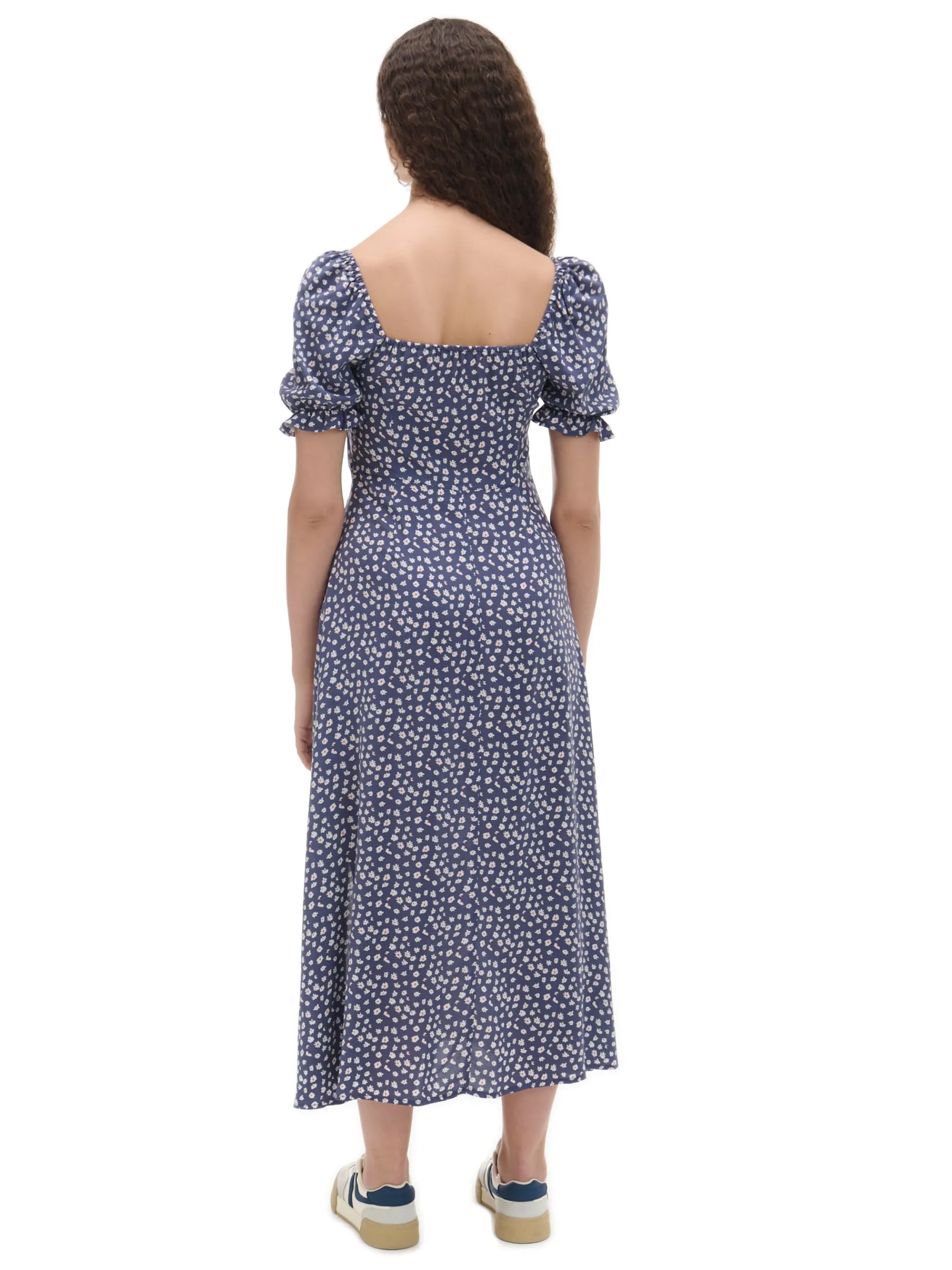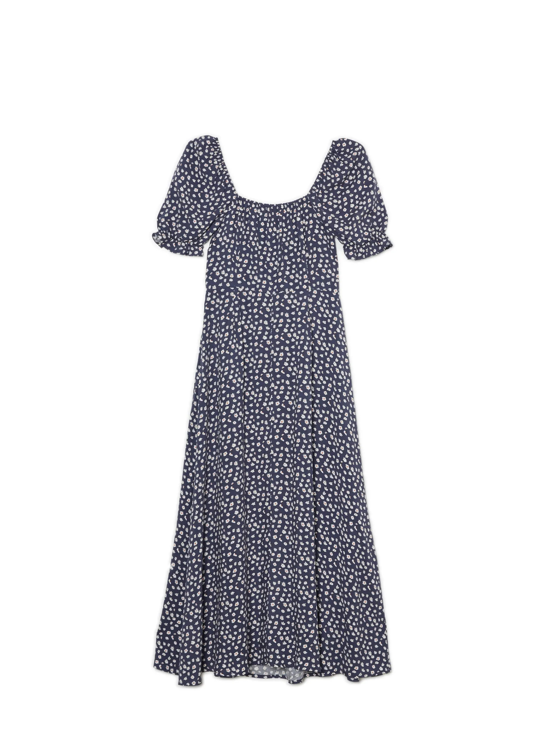 Delikatna damska granatowa sukienka z kwiatowym wzorem, idealna na letnie dni. 100% wiskozy długość midi rozcięcie z boku dekoracyjne marszczenie pod biustem krótkie, bufiaste rękawy zakończone gumką Wzrost modelki: 170 cm