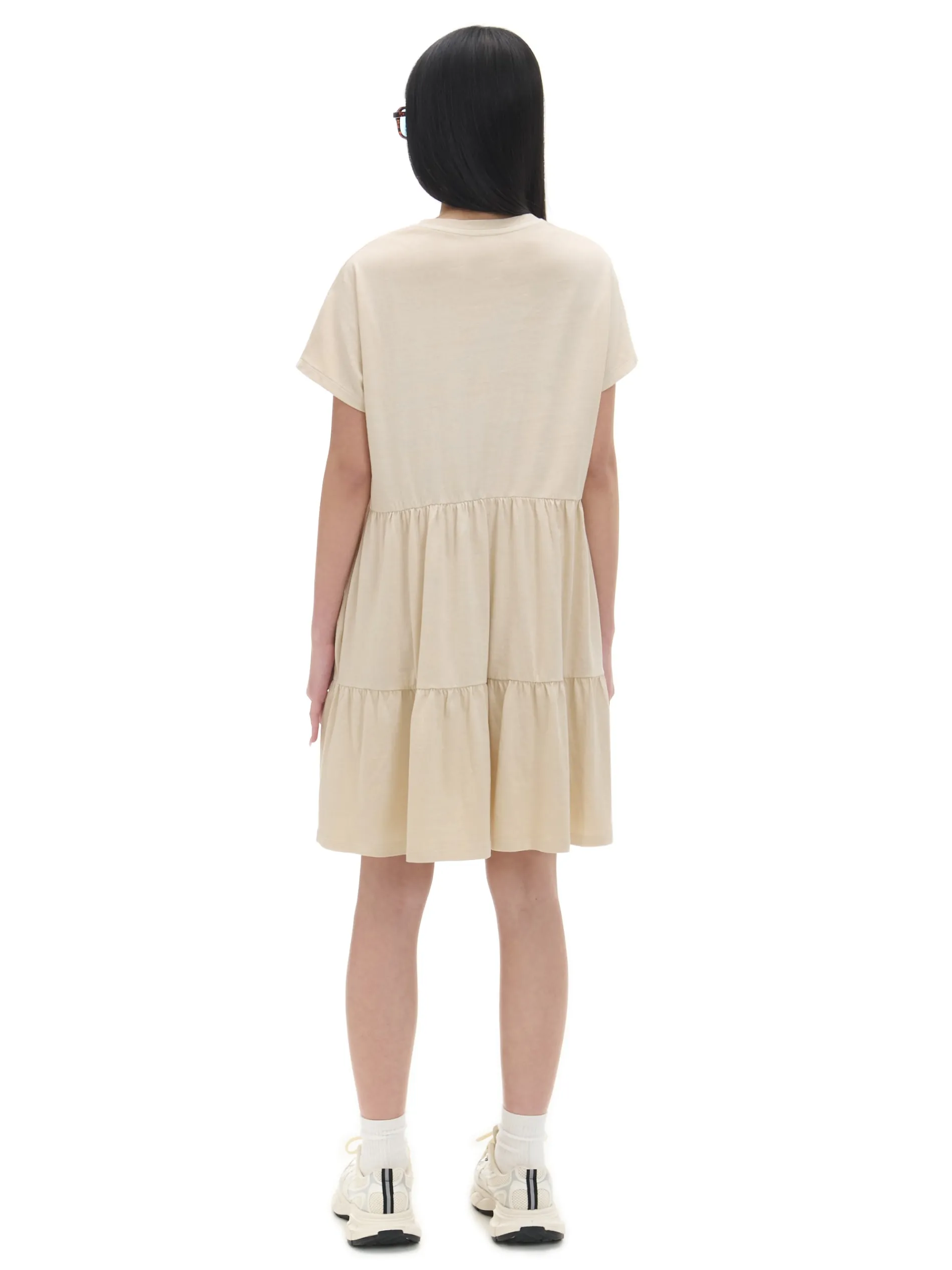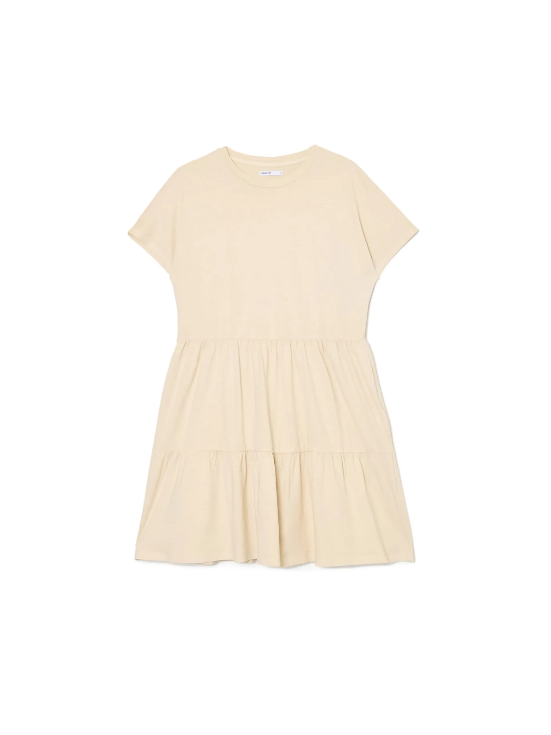 Bawełniana sukienka mini w jasnym odcieniu z ozdobnymi falbanami i marszczeniami. Fituje z każdym rodzajem obuwia! 100% bawełny długość mini proste, krótkie rękawy ozdobne falbany i marszczenia Wzrost modelki: 168 cm