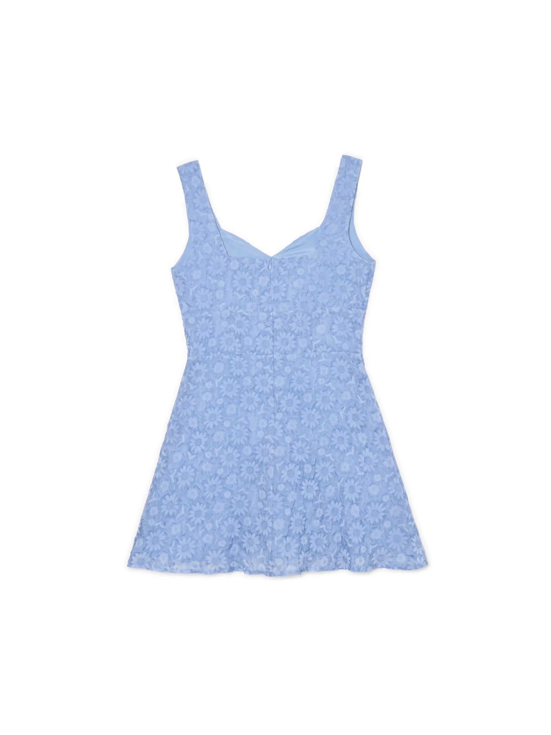 Damska sukienka w niebieskim odcieniu, uszyta z lekkiego materiału z delikatnym wzorem w kwiaty na całym materiale. Idealna na letnie spontany! lekki materiał długość mini rozszerzany dół zapięcie na kryty zamek z tyłu szersze ramiączka głęboki dekolt w kształcie litery V zaszewki modelujące biust i talię dekoracyjne marszczenie pod biustem sznurowanie i ozdobne przeszycia kwiatowy wzór