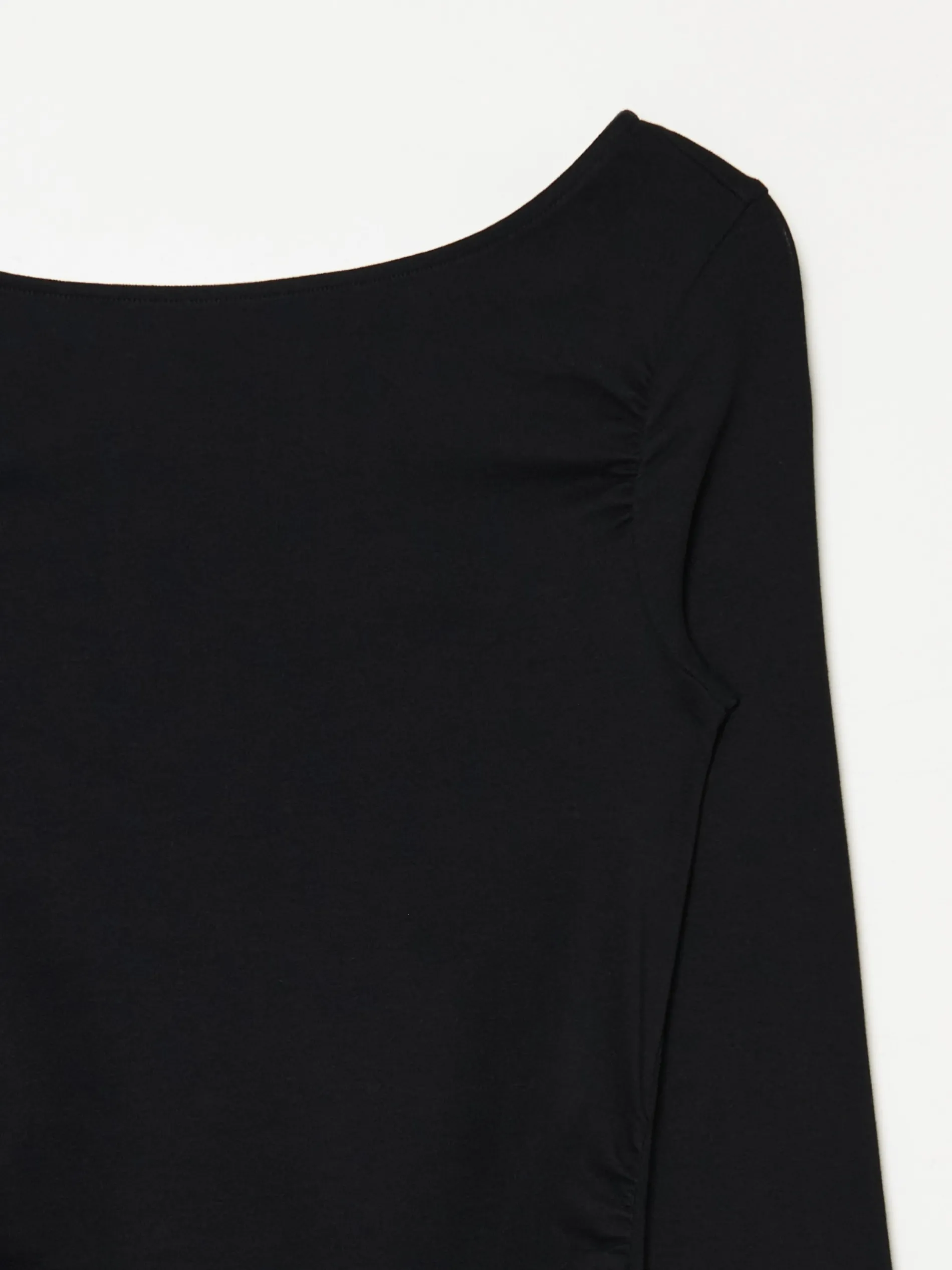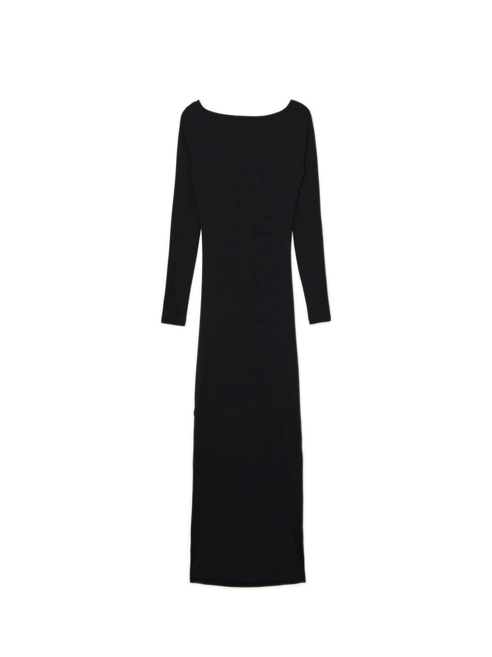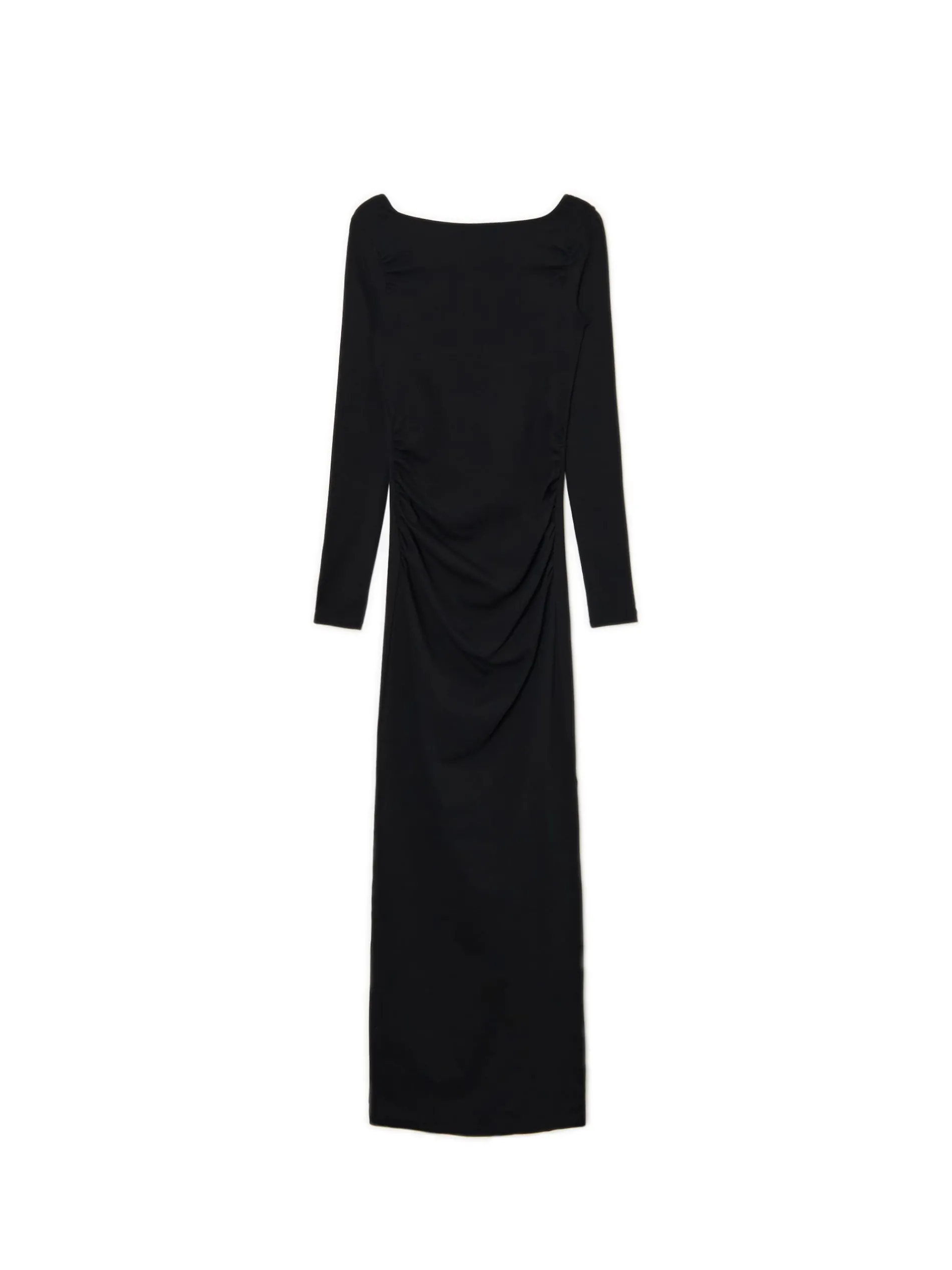 Damska sukienka idealna do pracy, na miasto czy domówkę. Długi, dopasowany krój oraz rękawy podkreślą Twoją unikatową sylwetkę. A ten klasyczny, czarny kolor fituje z nawet najbardziej zaskakującą biżuterią. bawełna z dodatkiem elastycznych włókien długość maxi dopasowany krój podkreślający sylwetkę dekolt w łódkę długie, dopasowane rękawy ozdobne marszczenia rozcięcie z boku