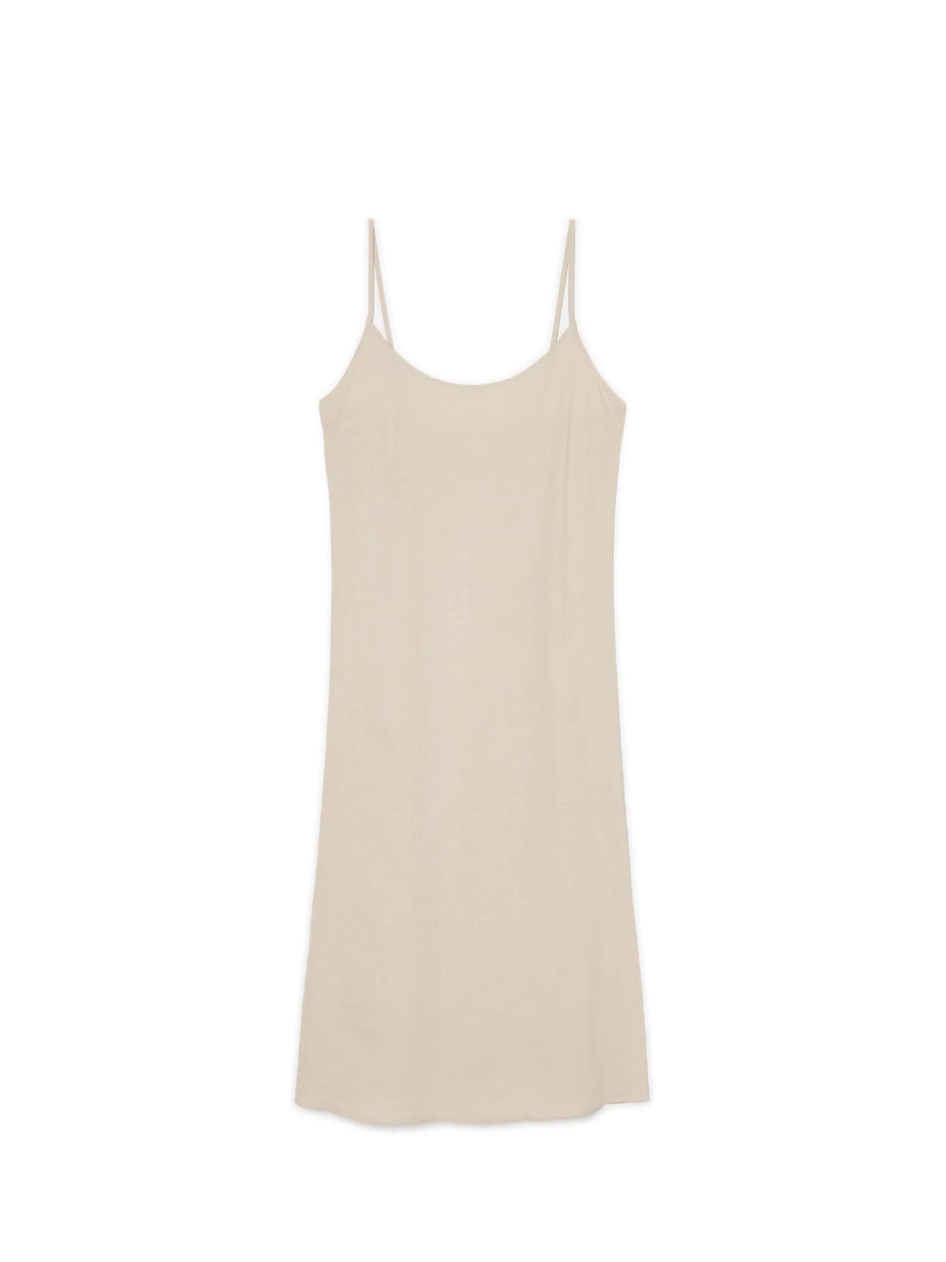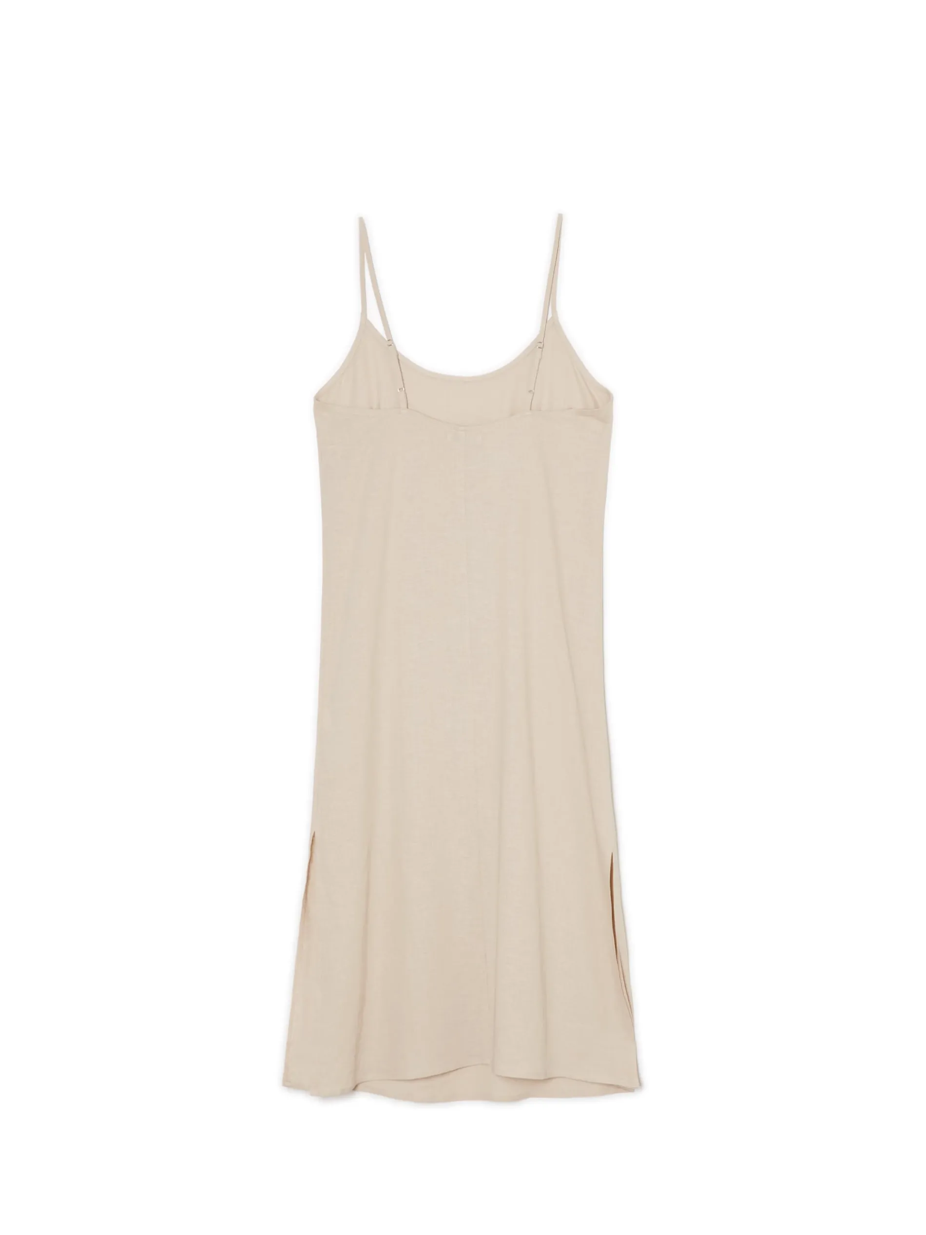 Zwiewna damska sukienka midi w kremowym odcieniu uszyta z mieszanki wiskozy i lnu. Regulowane cienkie ramiączka, rozcięcia po bokach i luźny krój stawiają ją na topce letnich stylizacji. lekki materiał z wiskozą długość midi swobodny, luźny krój wąskie ramiączka z regulacją długości delikatne rozcięcia po bokach Wzrost modelki: 176 cm