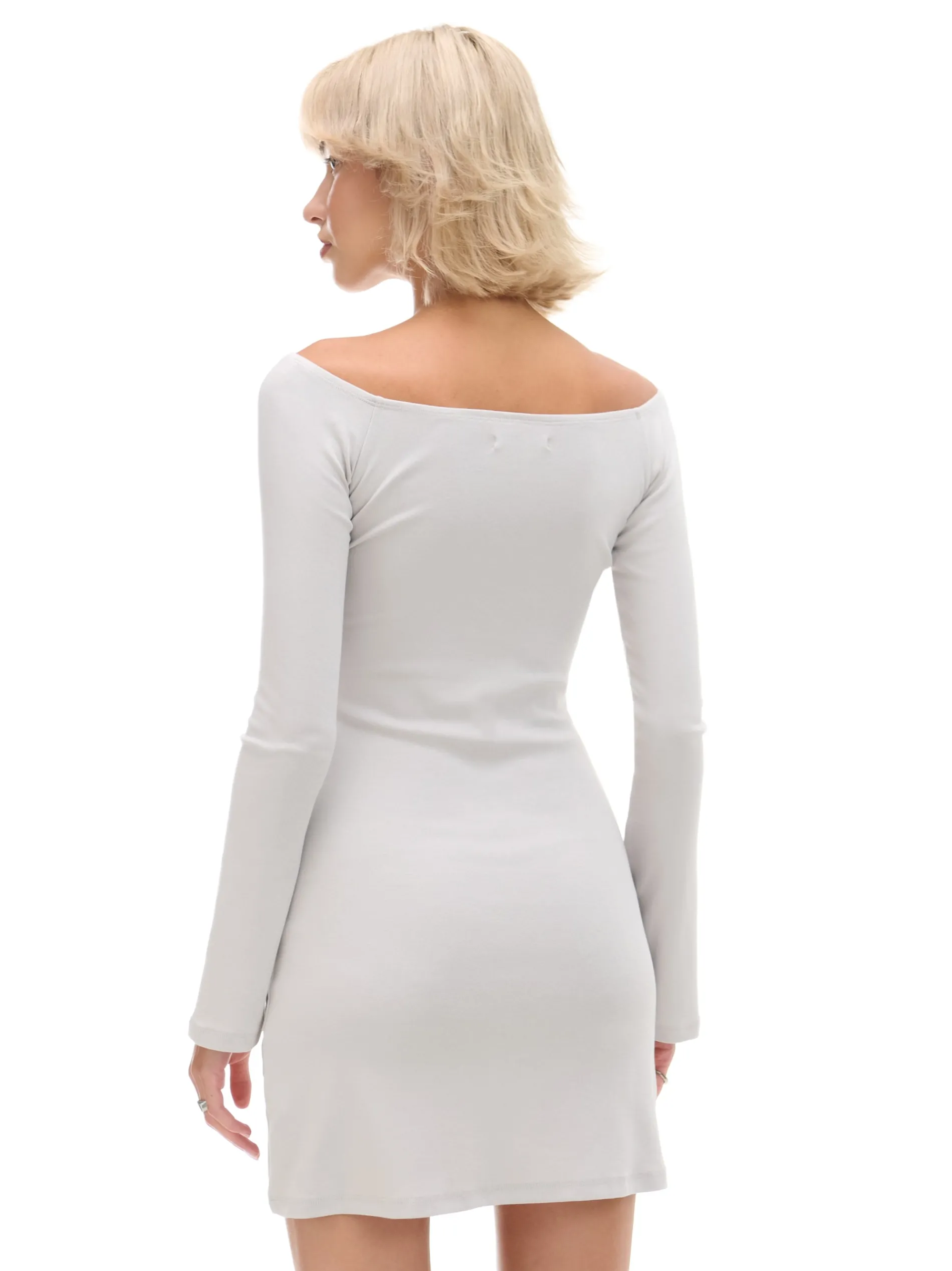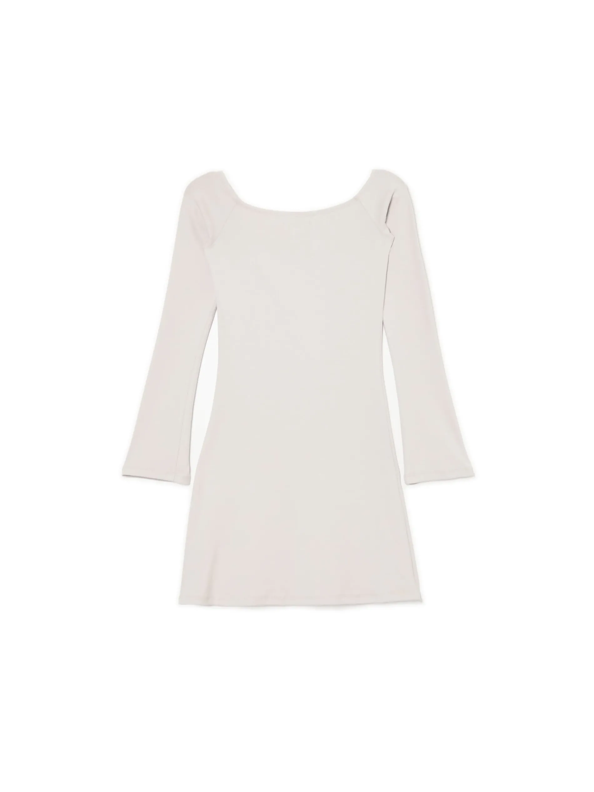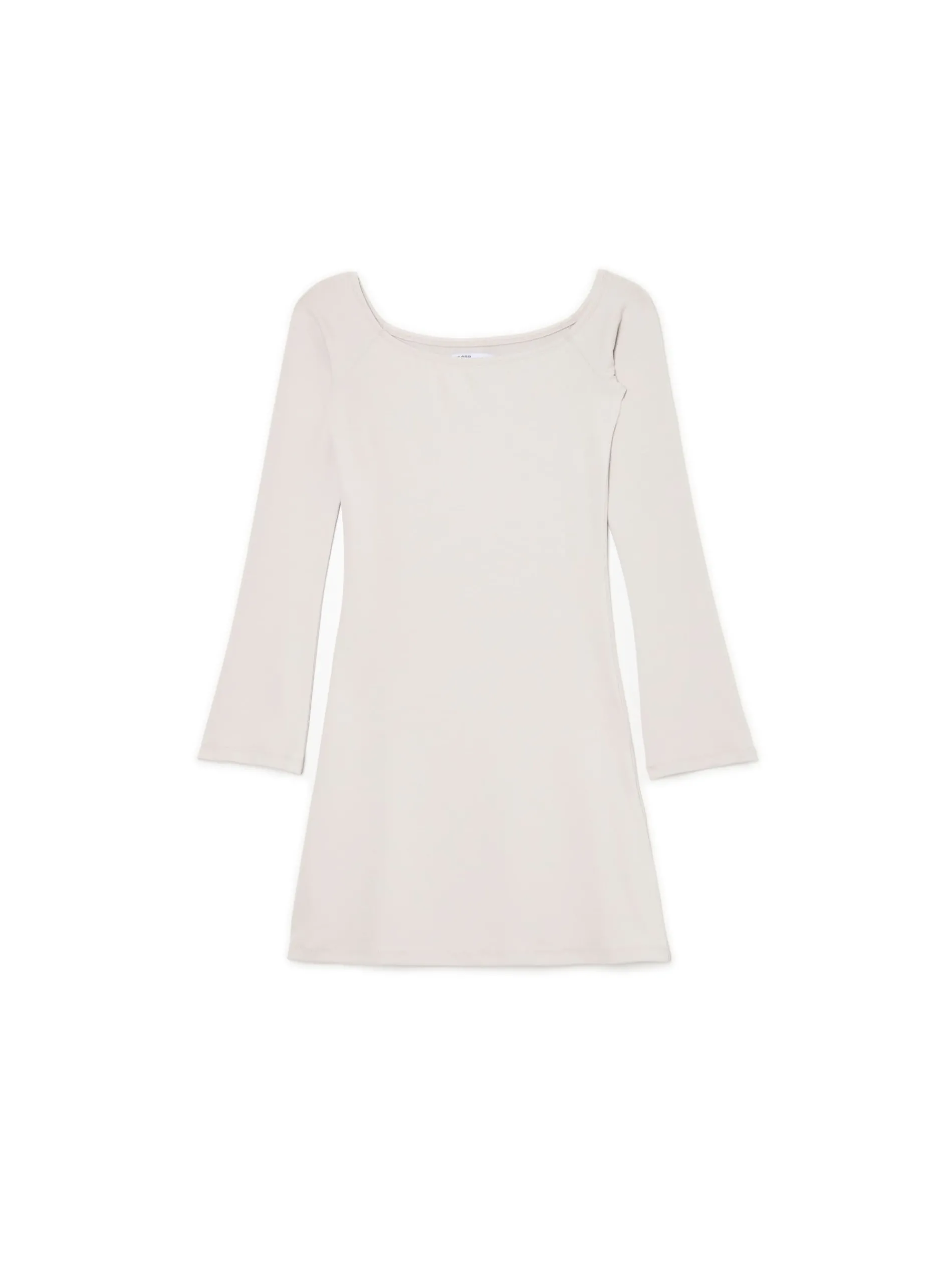 Damska sukienka o długości mini, uszyta z dzianinowego materiału z bawełną. Ozdobą są długie rękawy rozszerzane ku dołowi, nadające lekkości całej stylizacji. bawełna z dodatkiem elastycznych włókien delikatne taliowanie dekolt w łódkę wykończony gumką lekko rozszerzane rękawy opadające ramiona Wzrost modelki: 177 cm