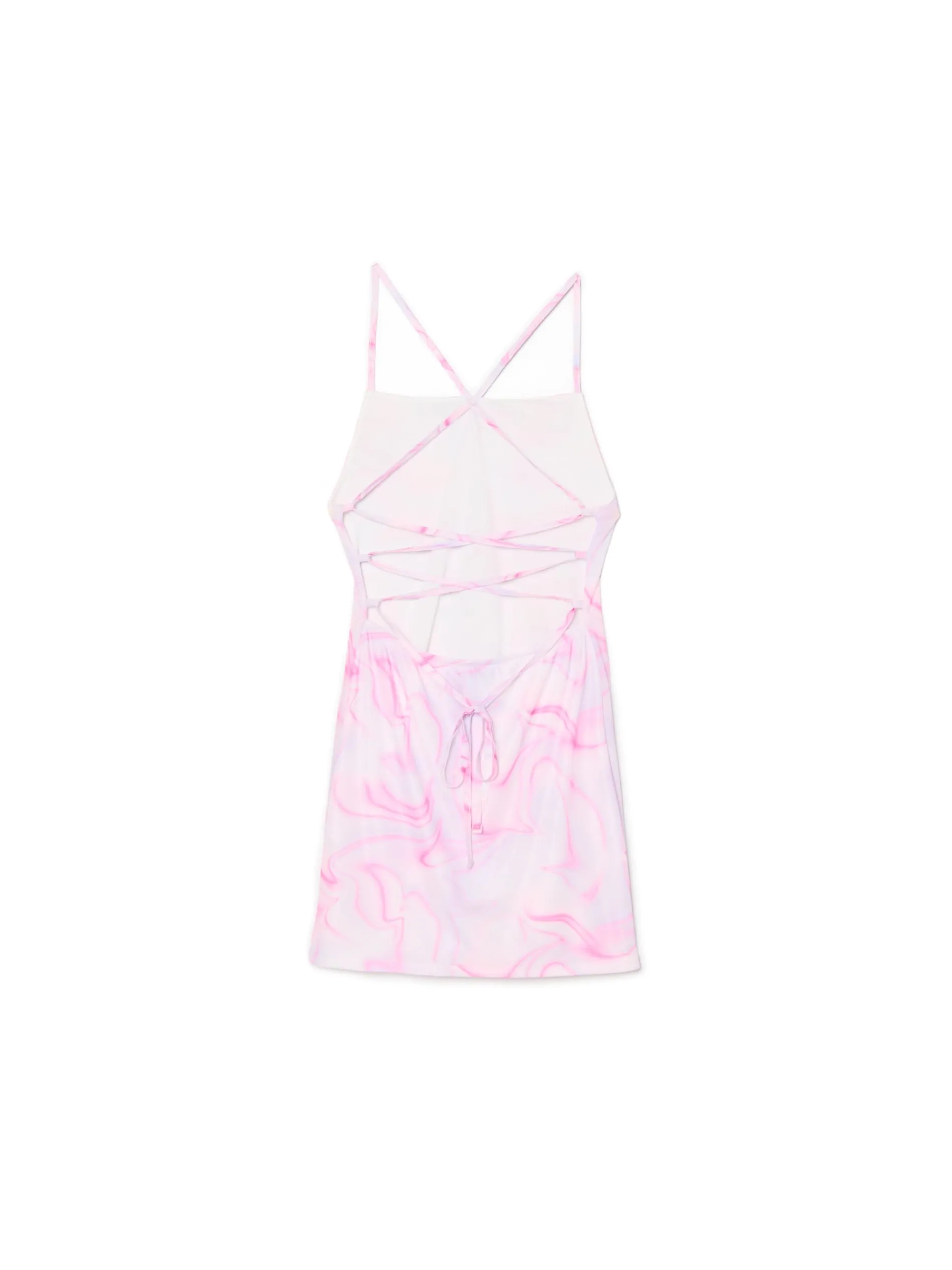 Wzorzysta sukienka mini na ramiączkach. Z tyłu ciekawe wiązanie i elastyczna gumka, która dopasuje ten model do Twojej talii. dzianina z domieszką elastycznych włókien dopasowany krój podkreślający sylwetkę kwadratowy dekolt elastyczna talia z wiązaniem cienkie, krzyżujące się na plecach ramiączka Wzrost modelki: 172 cm