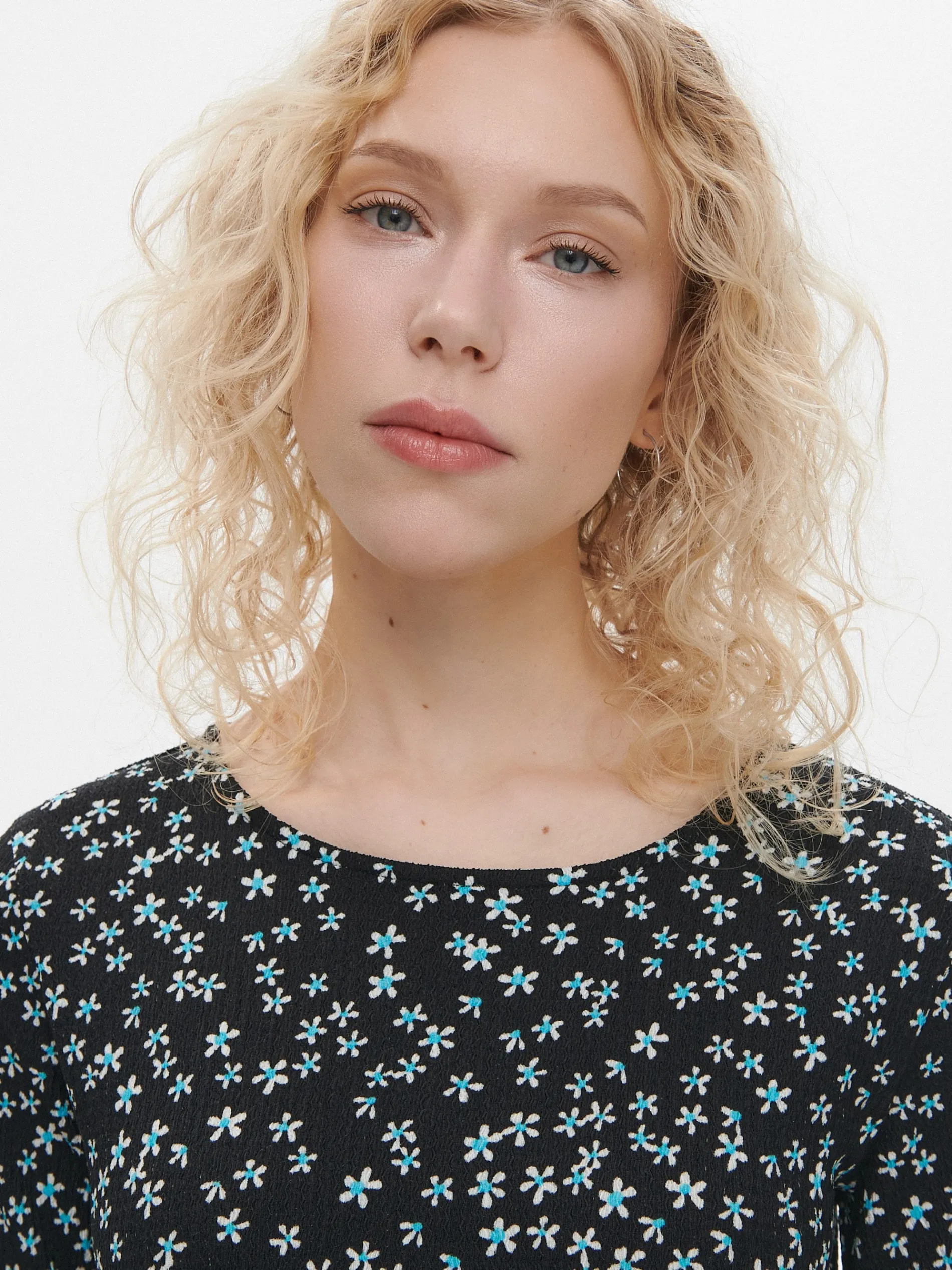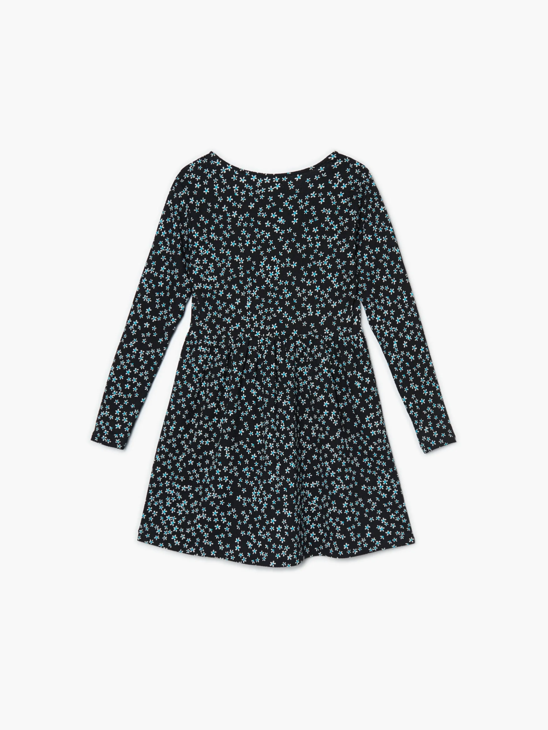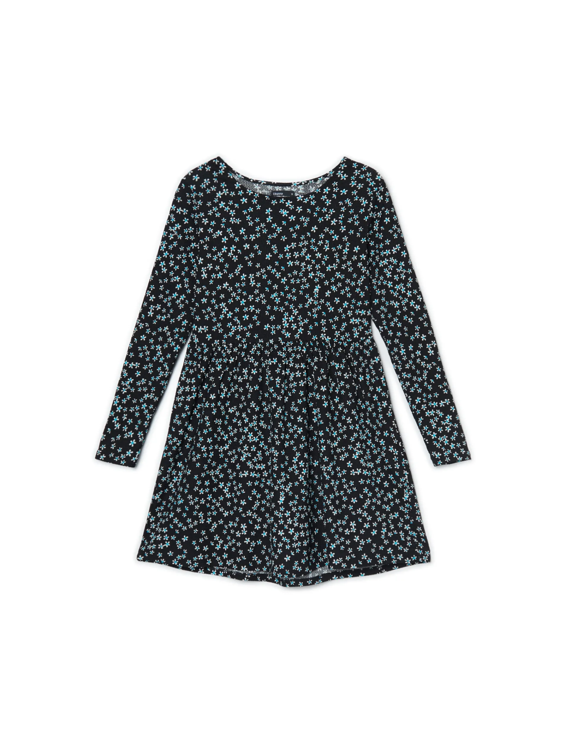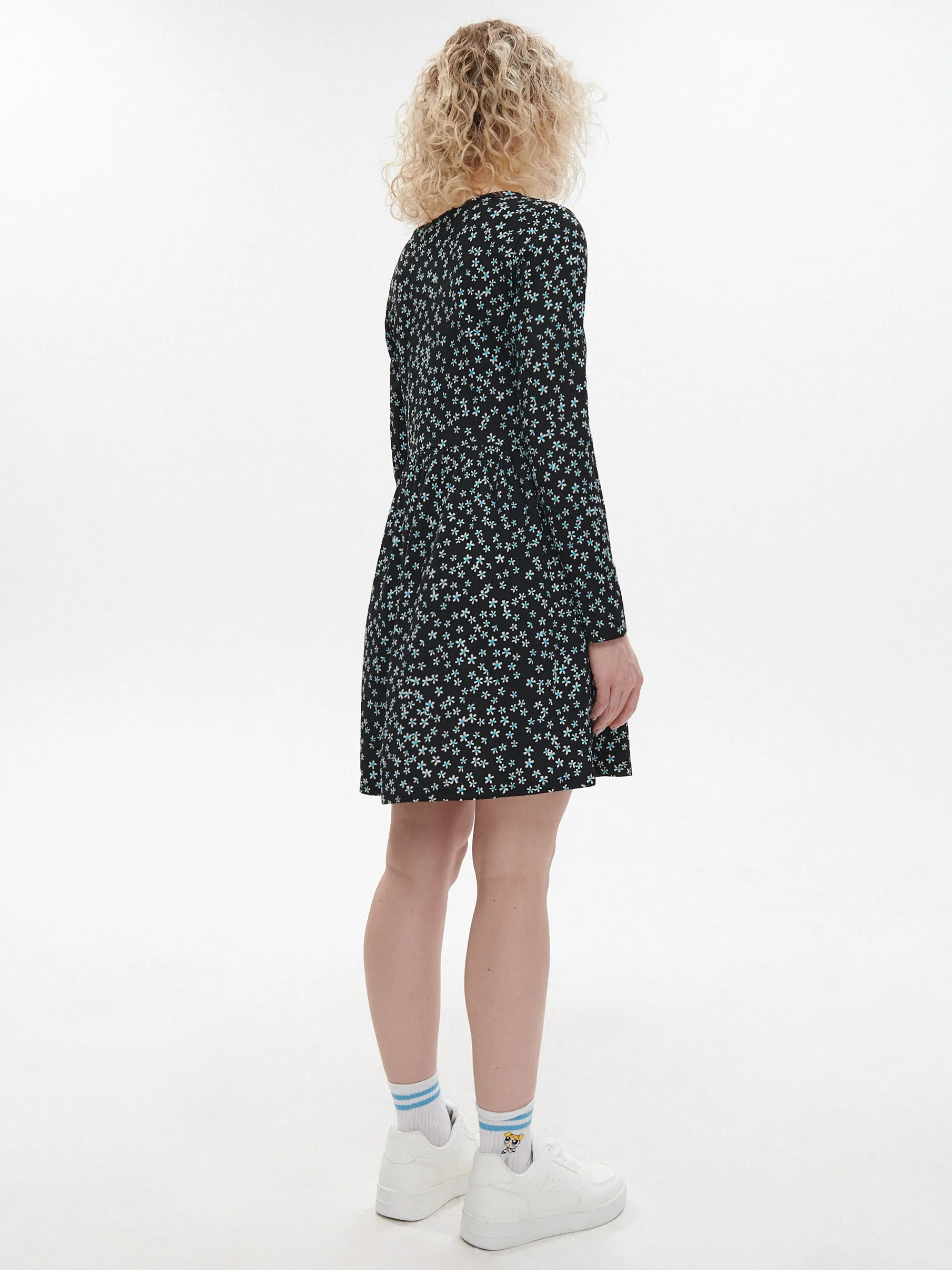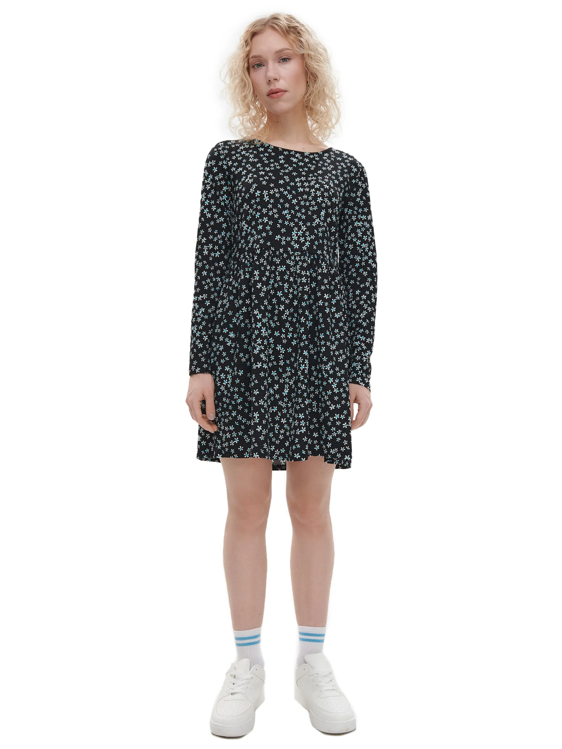 Krótka sukienka damska o lekko rozszerzanym kroju. uszyta z dzianiny zawierającej dodatek elastycznych włókien zabudowany dekolt odcięcie w pasie, wzór w kwiaty all over dostępna w innej wersji kolorystycznej
