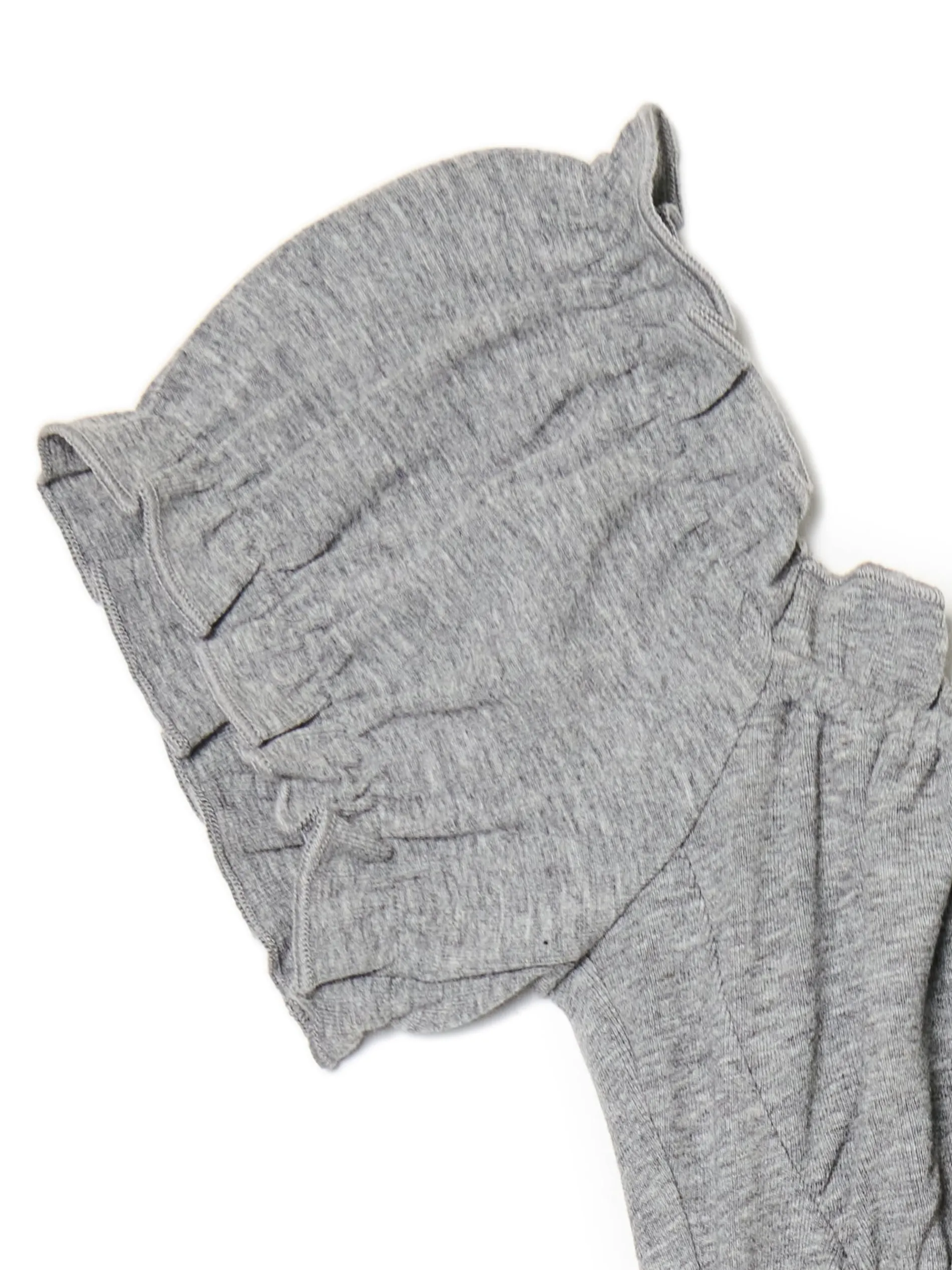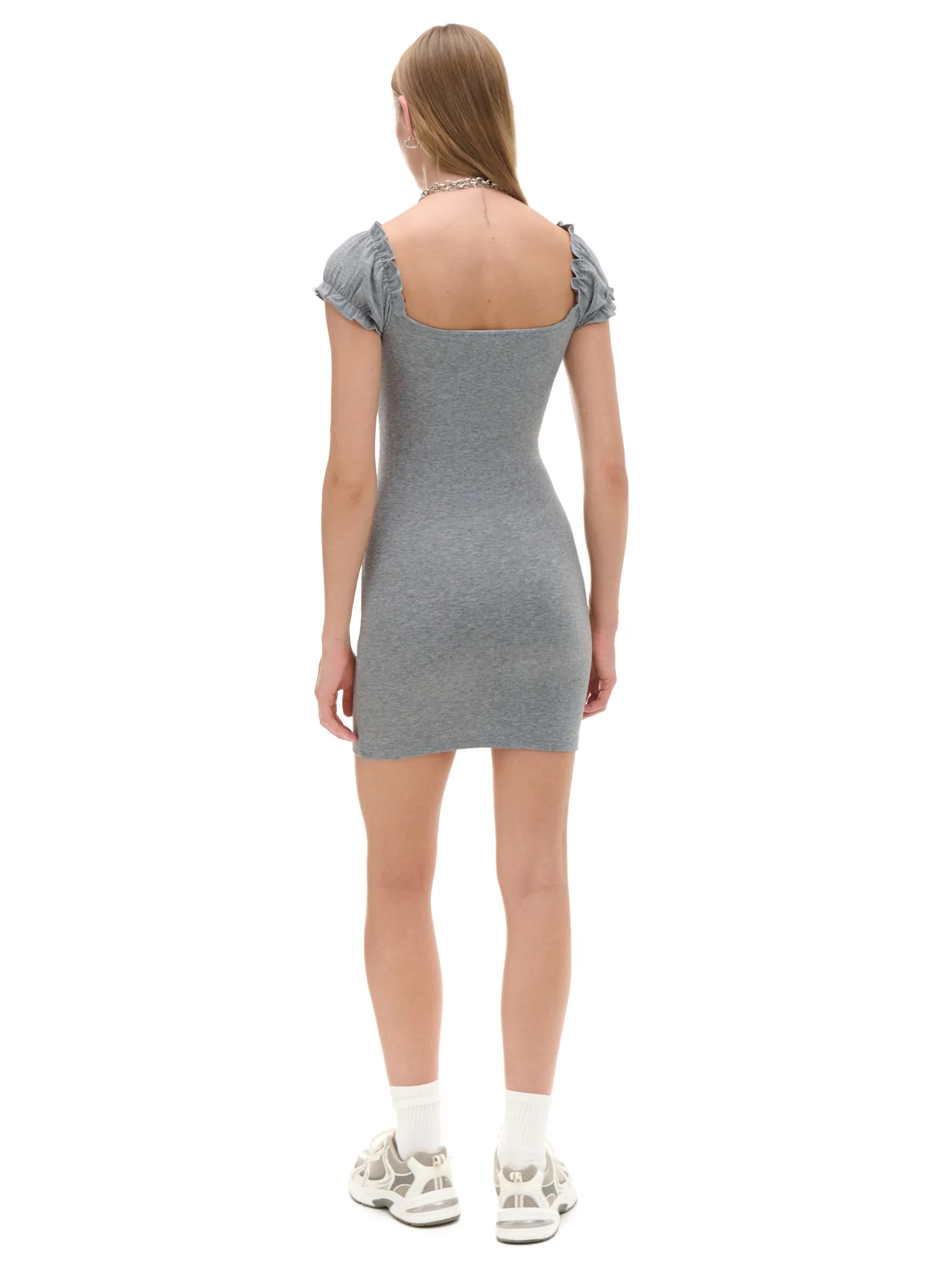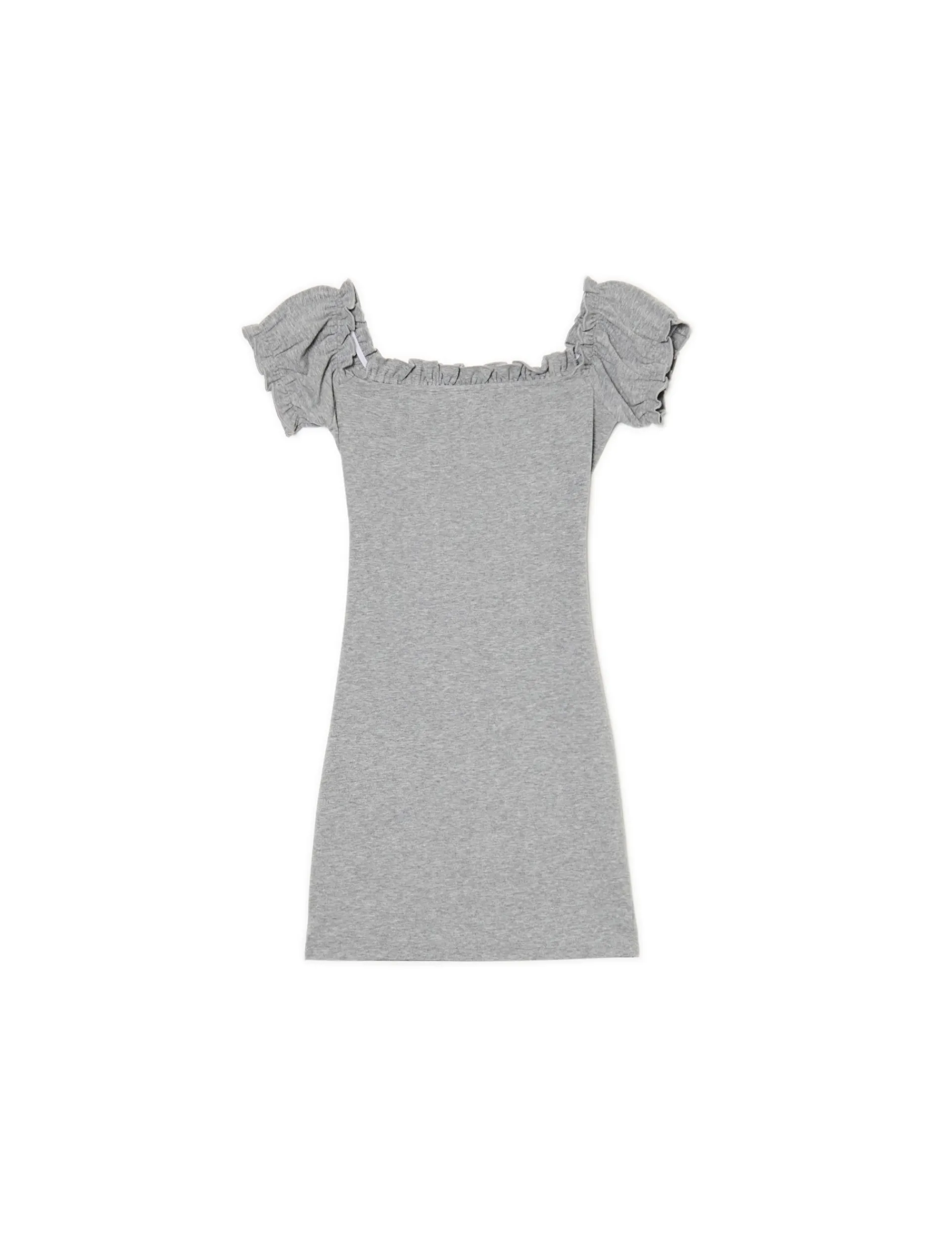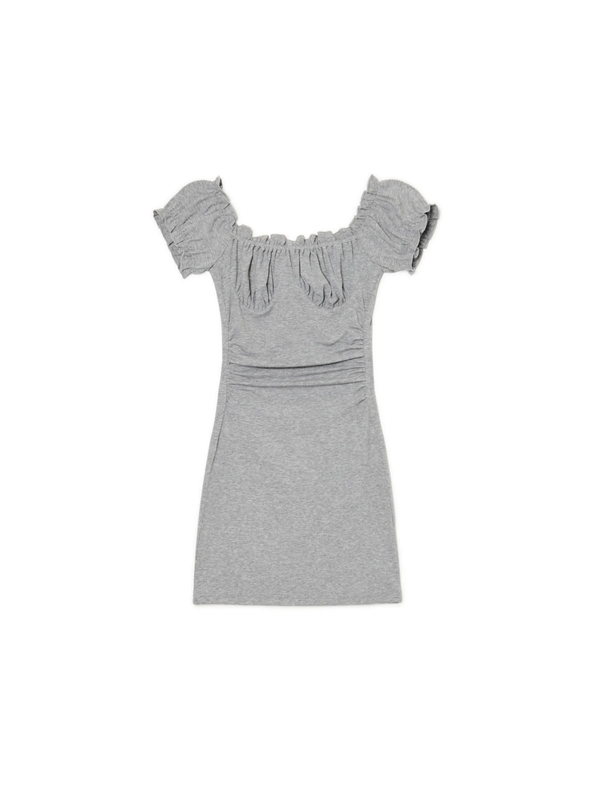 Krótka szara sukienka, uszyta z elastycznej dzianiny zawierającej wiskozę. Genialna na letnie randki i nie tylko! długość mini dopasowany, podkreślający sylwetkę krój podkreślona linia biustu z marszczeniami rękawy i dekolt wykończone krótką falbanką, w brzegu elastyczna gumka w tali symetryczne marszczenia