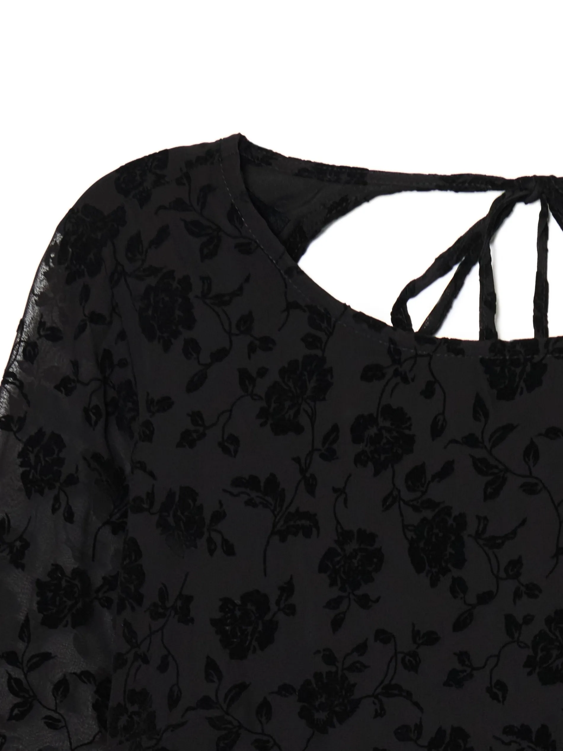 Wzorzysta sukienka o długości mini wykonana z prześwitującego szyfonu z kwiatowym wzorem. Idealna na spontaniczne wyjścia z przyjaciółmi! uszyta z szyfonowej tkaniny w kwiatowy wzór długość mini wewnątrz gładka podszewka zapięcie na kryty zamek z tyłu ozdobne wiązanie na plecach półokrągły dekolt z lamówką efektowne, odkryte plecy lekko rozszerzane rękawy kwiatowy wzór Wzrost modelki: 172 cm