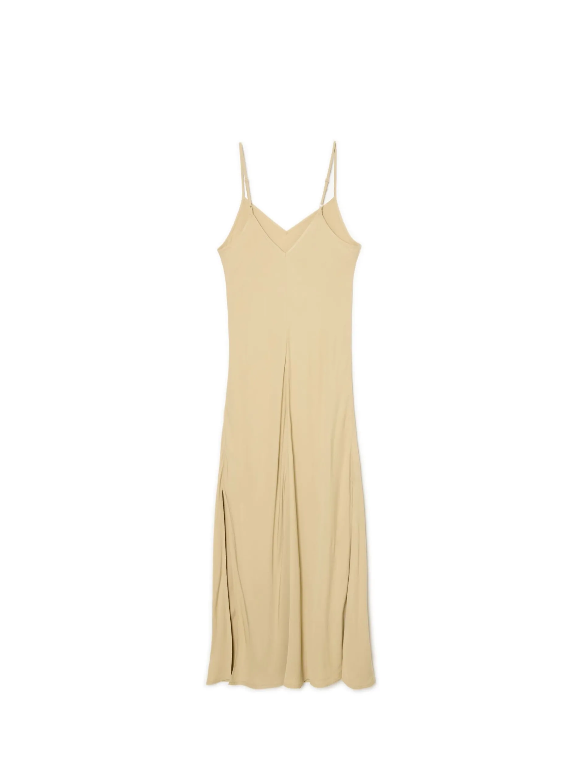 Damska sukienka maxi o dopasowanym kroju uszyta z lekkiej tkaniny. Dobierz do tego modelu swoje ulubione dodatki i na miasto! cienkie ramiączka dekolt w kształcie litery V ozdobne rozcięcia po bokach