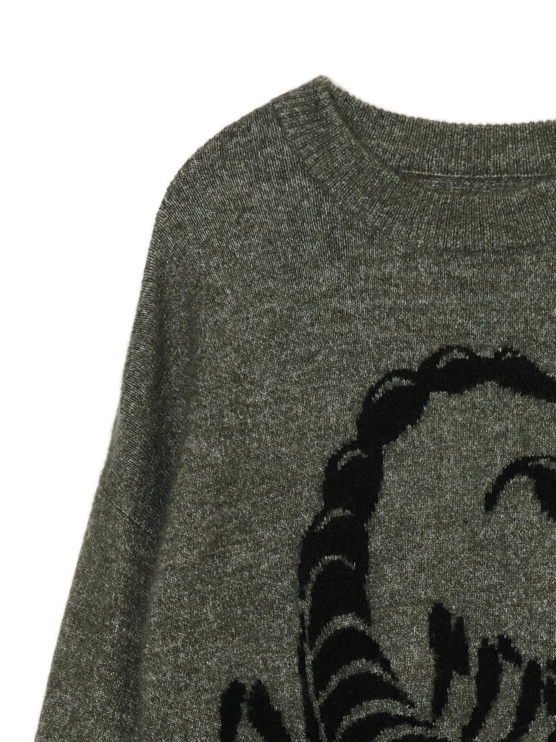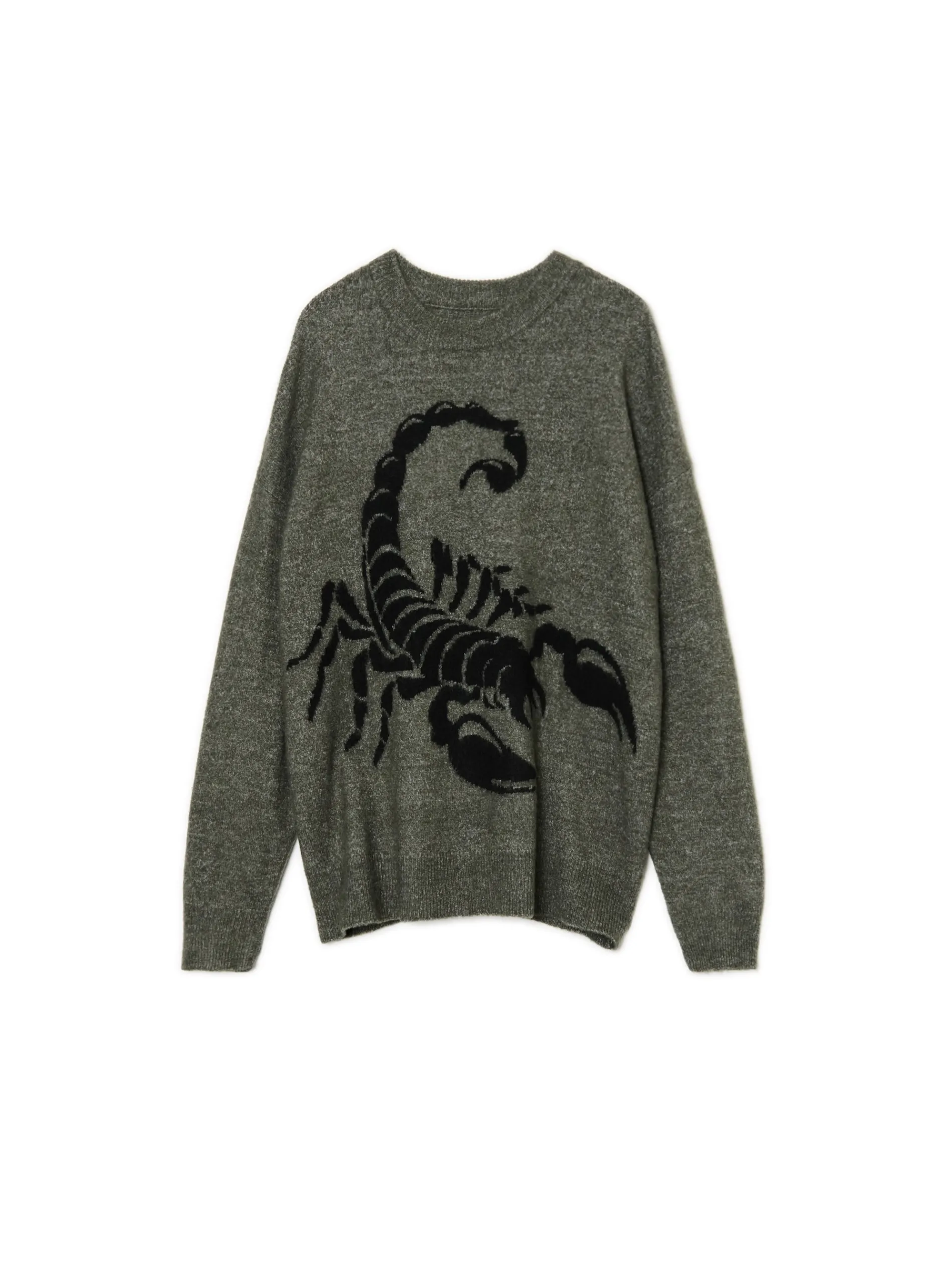 Dzianinowy sweter damski uszyty z ponadczasowej, żakardowej dzianiny z nadrukiem ogromnego skorpiona. Tylko dla odważnej! uszyty z melanżowej dzianiny krój oversize okrągły dekolt z lamówką długie, swobodne rękawy dół i rękawy wykończone prążkowanym ściągaczem nadruk z motywem Halloween Wzrost modelki: 172 cm