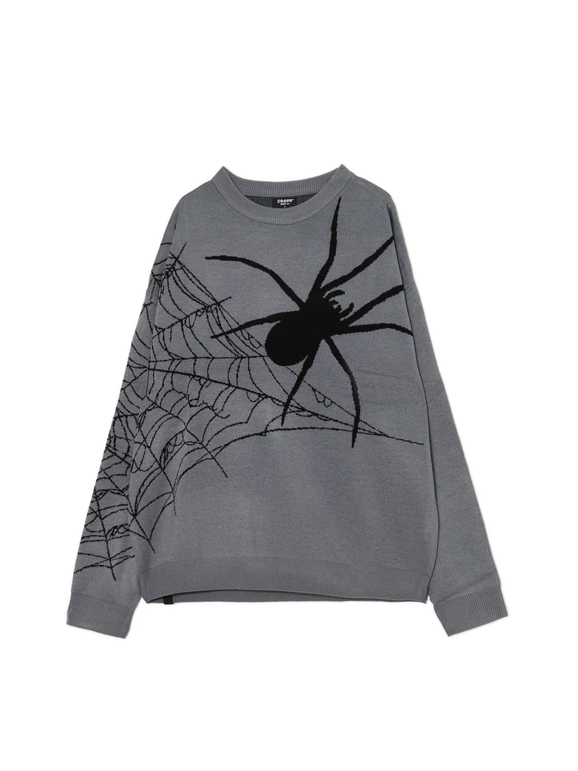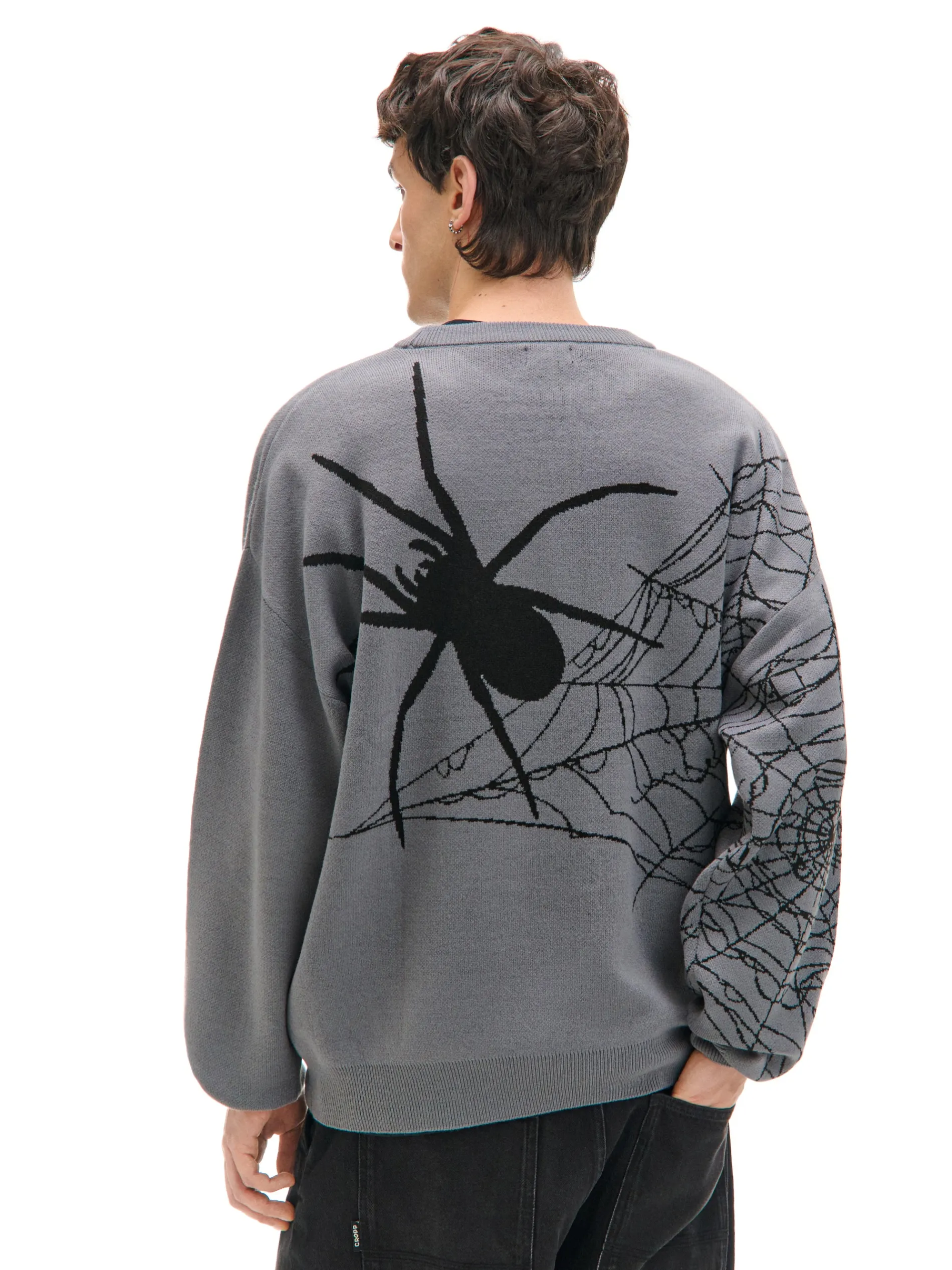 Szary męski sweter, uszyty z miękkiej żakardowej dzianiny. Idealny na casualowe Halloween! luźny krój boxy dolny brzeg i długie rękawy zakończone ściągaczem nadruk z motywem Halloween