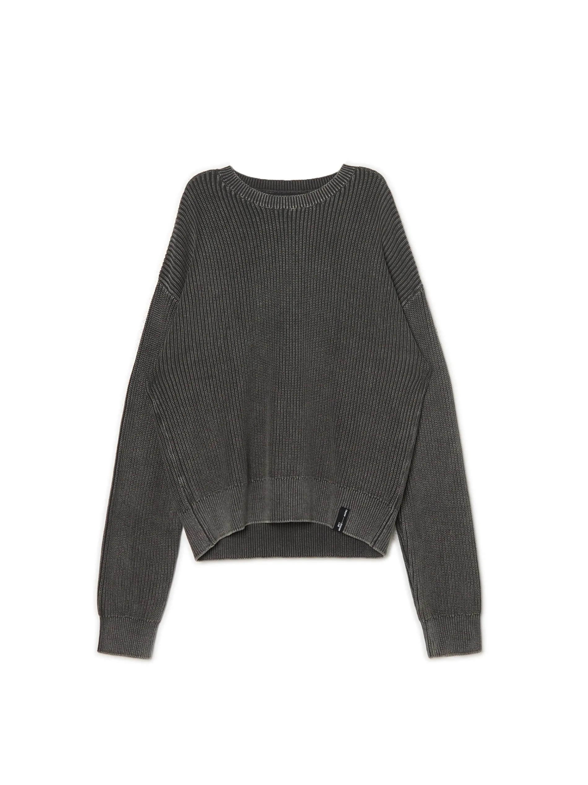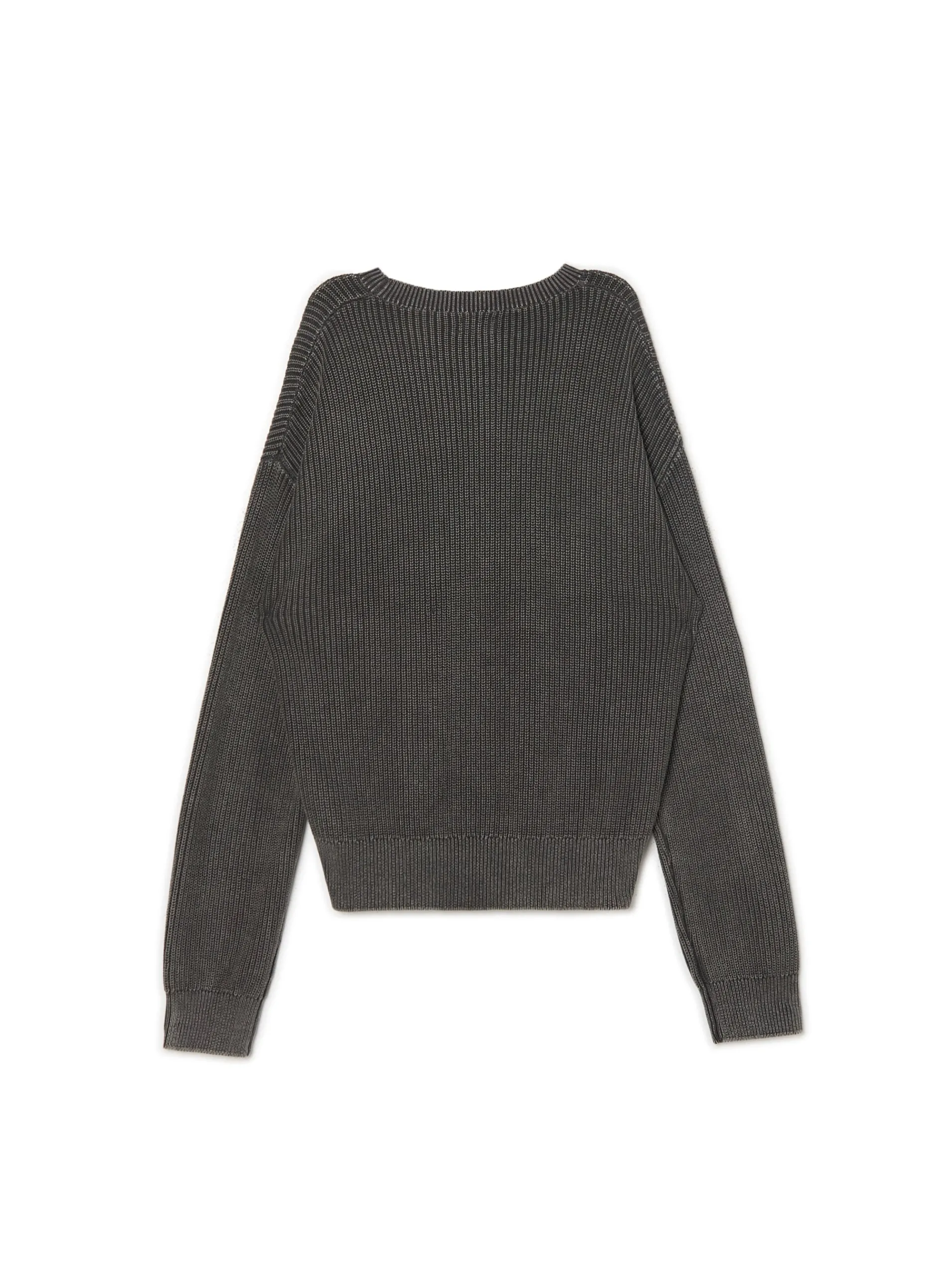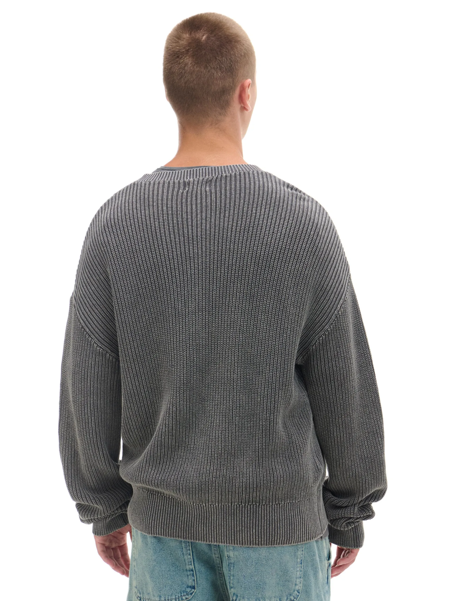 Sweter męski uszyty z prążkowanej, bawełnianej dzianiny z efektem sprania. Służy jako casual lub dodatek do białej koszuli. 100% bawełny prążkowany materiał obszerny krój boxy okrągły dekolt z lamówką długie, swobodne rękawy dół i rękawy wykończone prążkowanym ściągaczem silikonowe taśmy wszyte wewnątrz na wysokości ramion efekt sprania na całości Wzrost modela: 185 cm