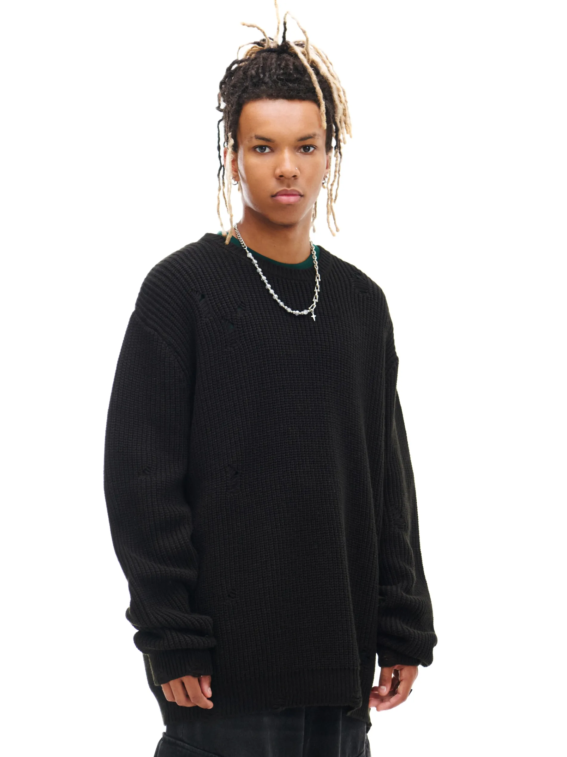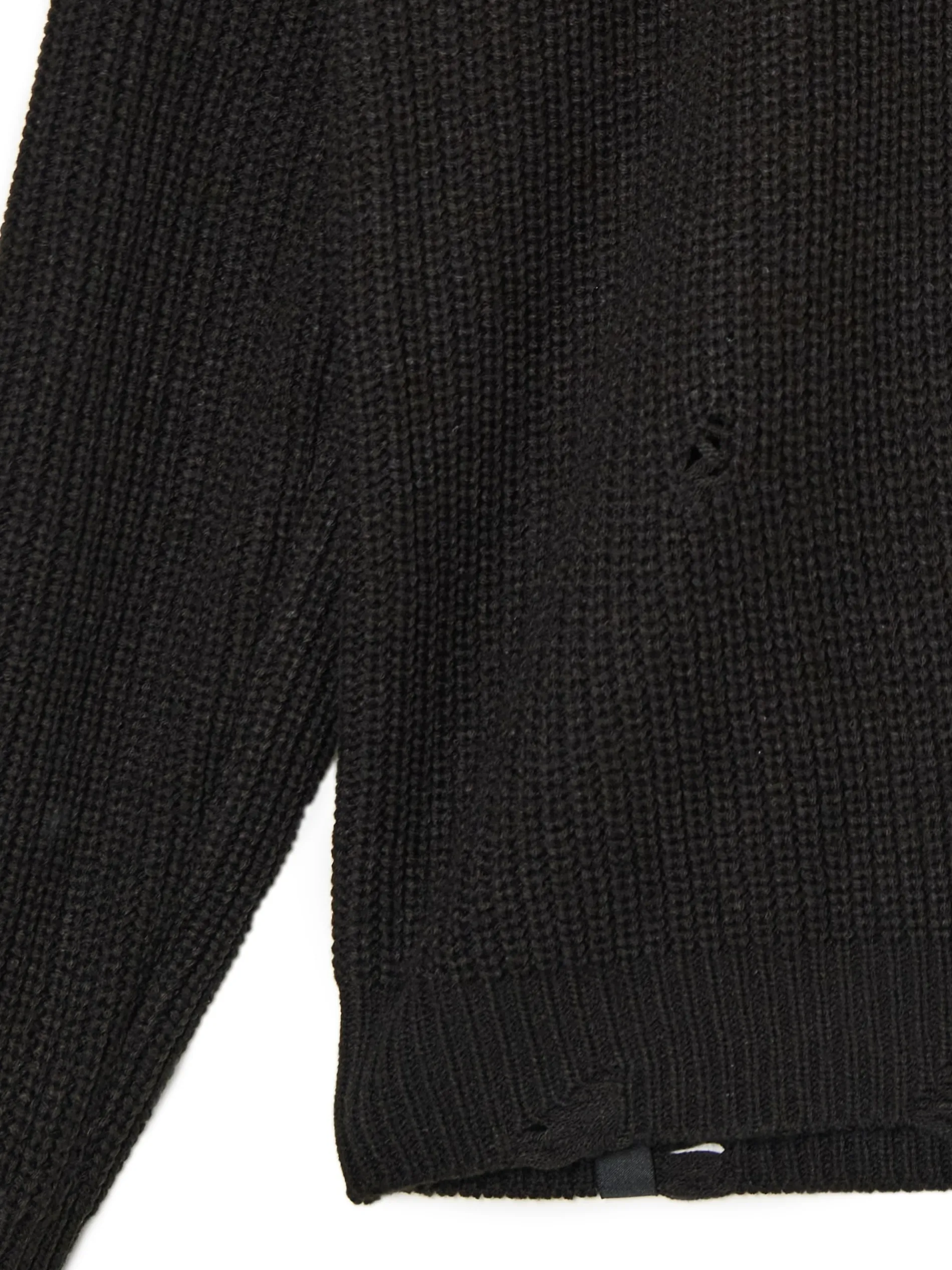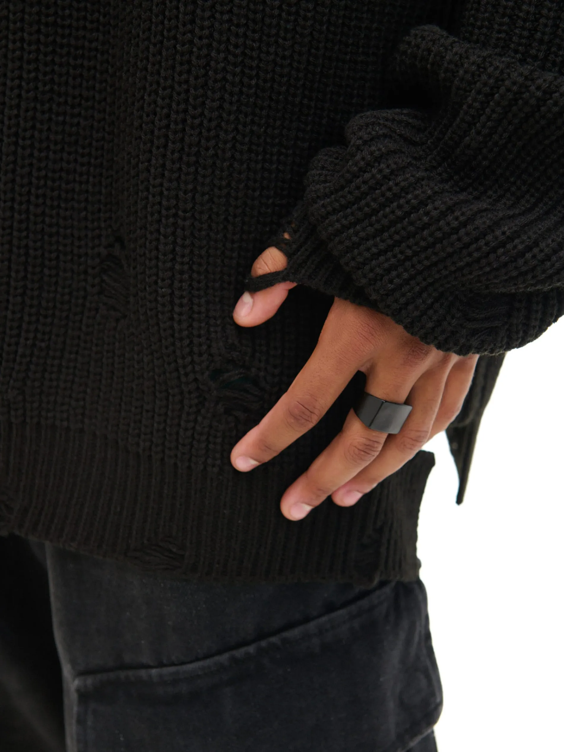 Czarny męski sweter o kroju comfort, uszyty z dzianiny o ryżowym splocie. Na całej powierzchni widoczne postrzępienia w streetowym stylu. Sportowo-casualowy look na chłodne, jesienne dni. swobodny, luźny krój okrągły dekolt z lamówką długie, szerokie rękawy delikatnie obniżona linia ramion dół i rękawy wykończone prążkowanym ściągaczem gładkie wykończenie brzegów delikatne postrzępienia i przetarcia