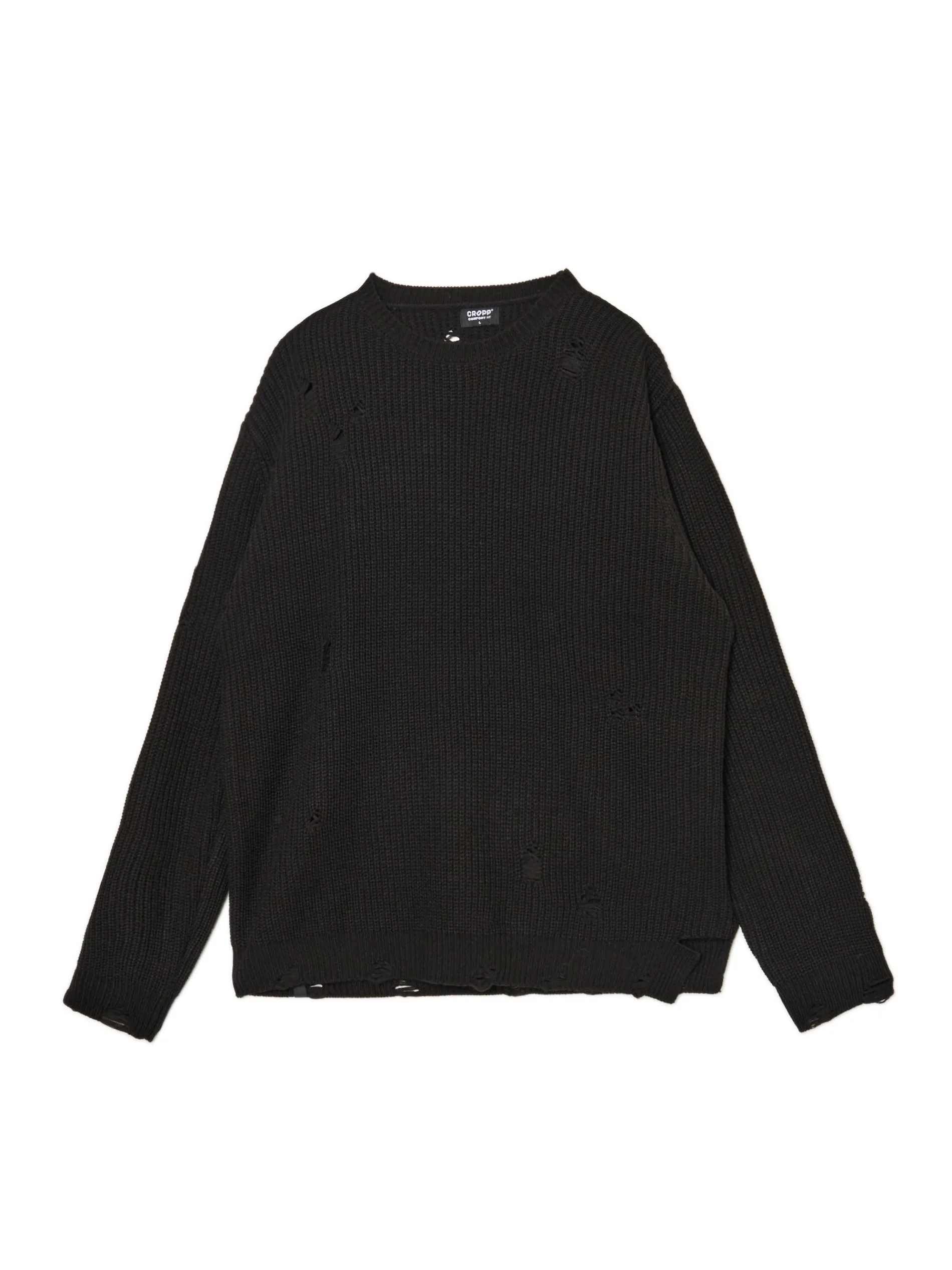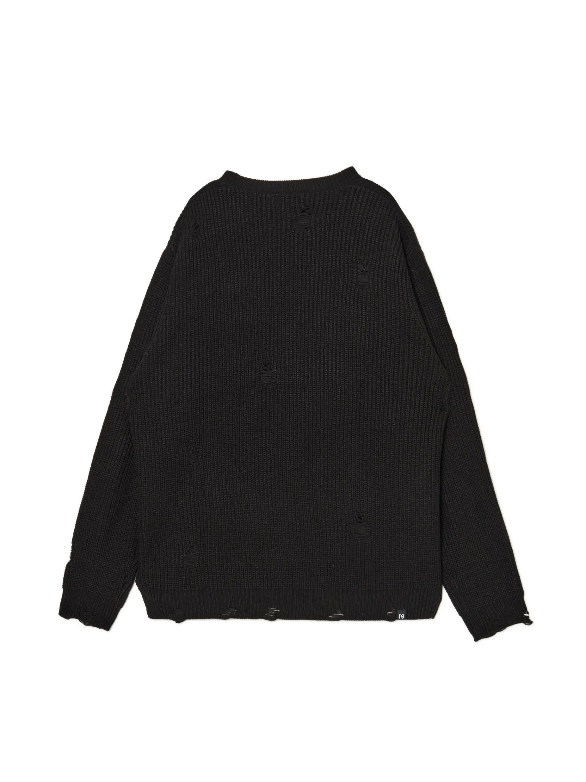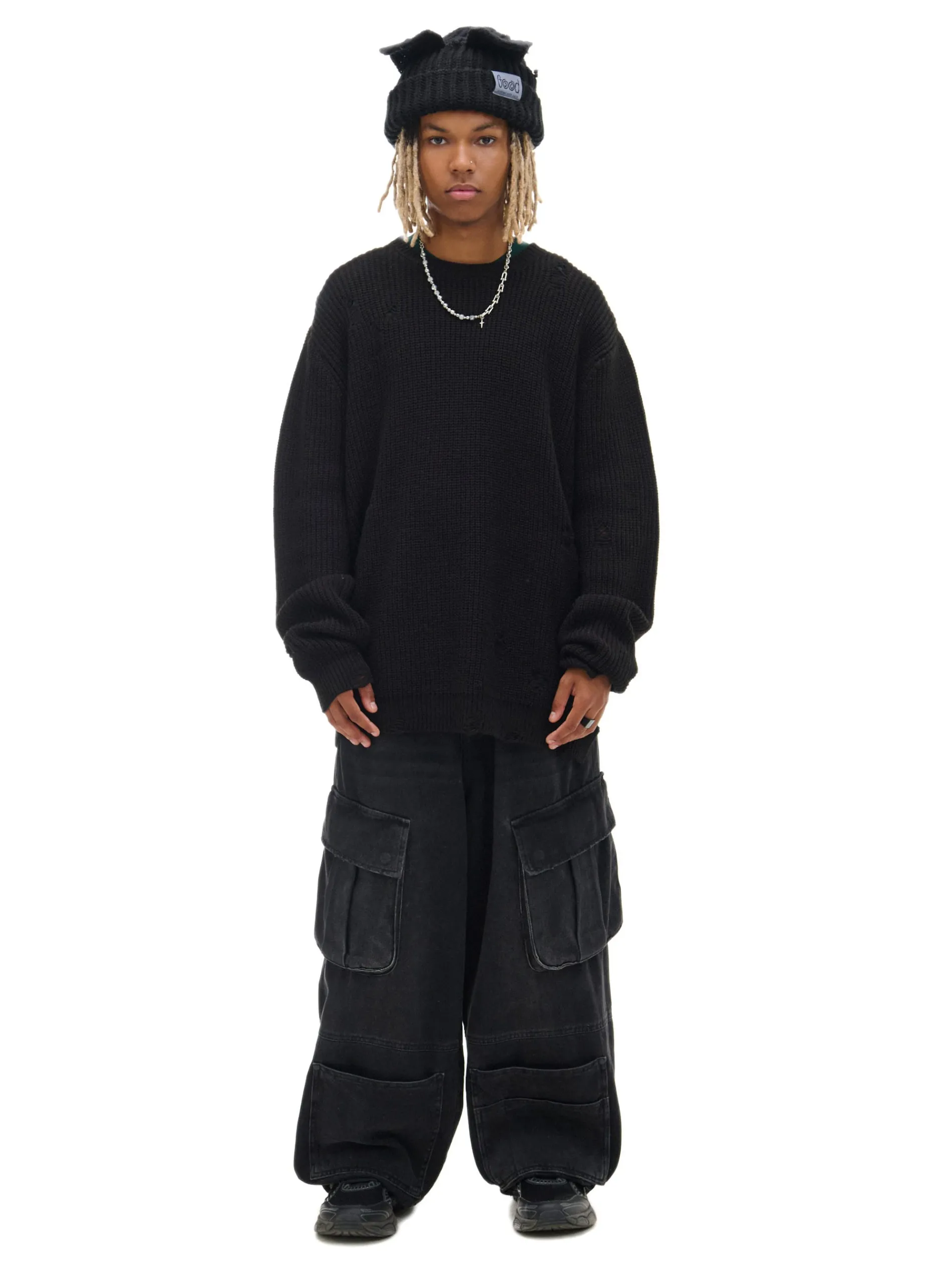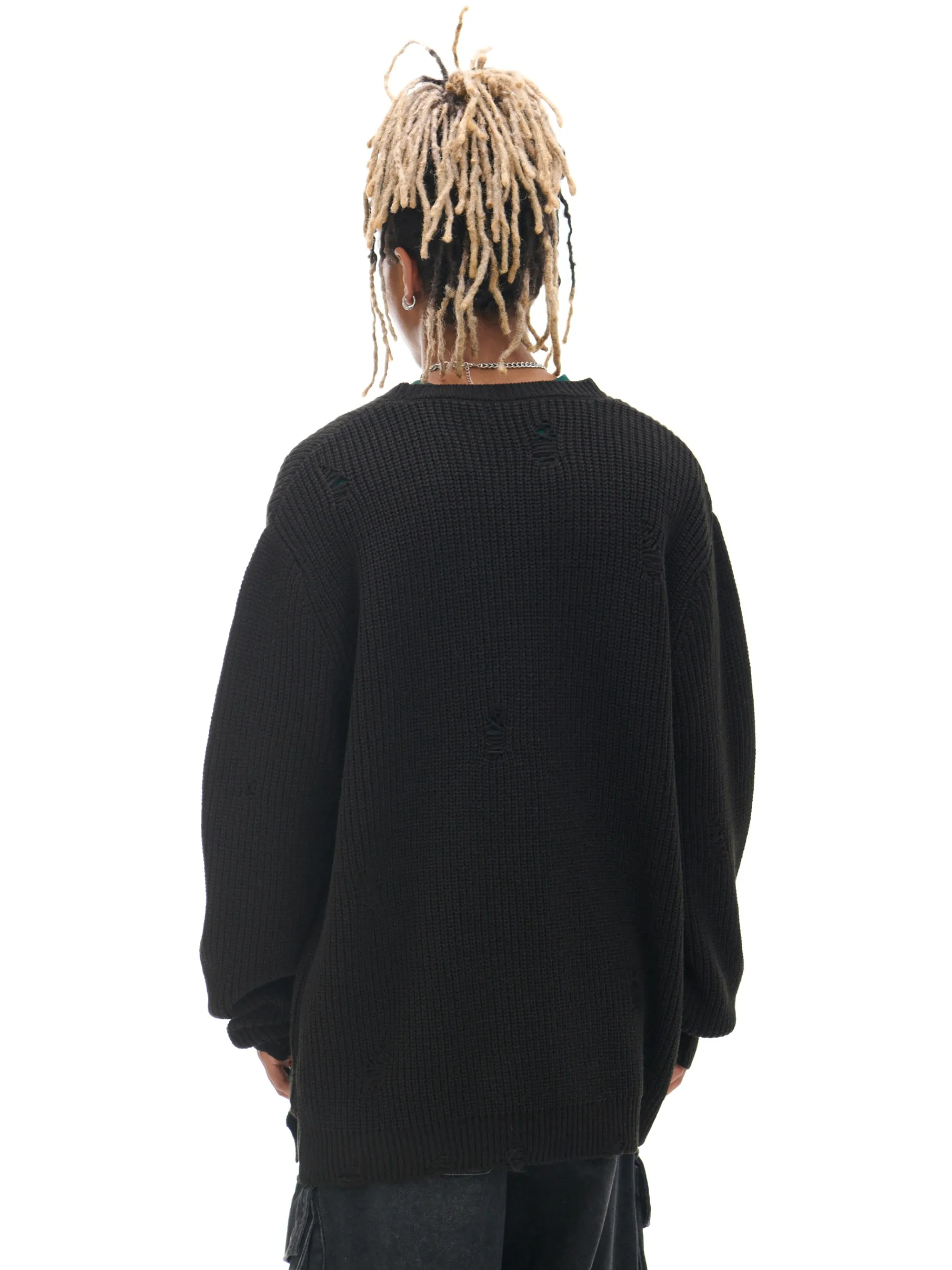 Czarny męski sweter o kroju comfort, uszyty z dzianiny o ryżowym splocie. Na całej powierzchni widoczne postrzępienia w streetowym stylu. Sportowo-casualowy look na chłodne, jesienne dni. swobodny, luźny krój okrągły dekolt z lamówką długie, szerokie rękawy delikatnie obniżona linia ramion dół i rękawy wykończone prążkowanym ściągaczem gładkie wykończenie brzegów delikatne postrzępienia i przetarcia