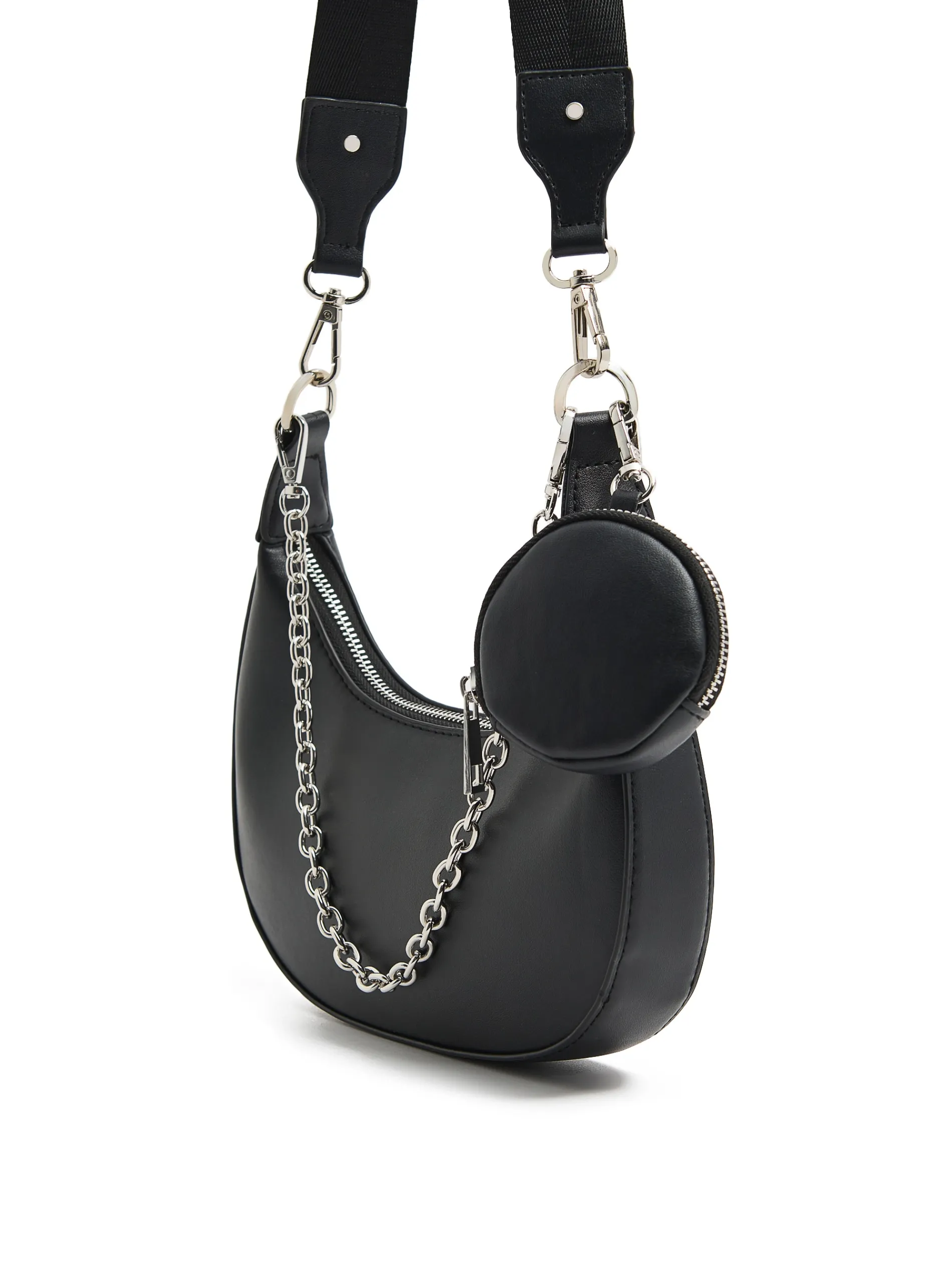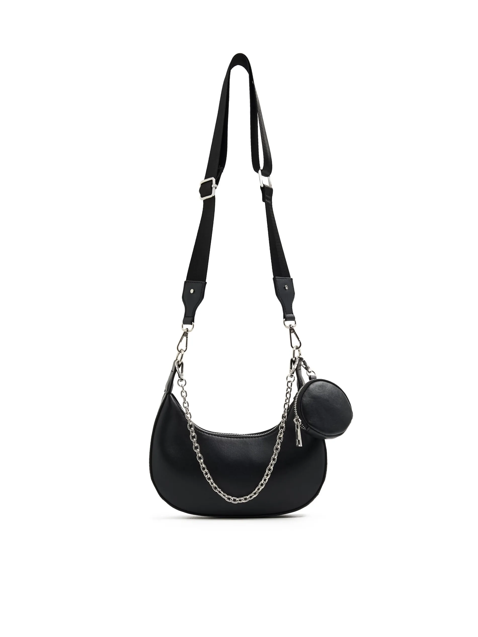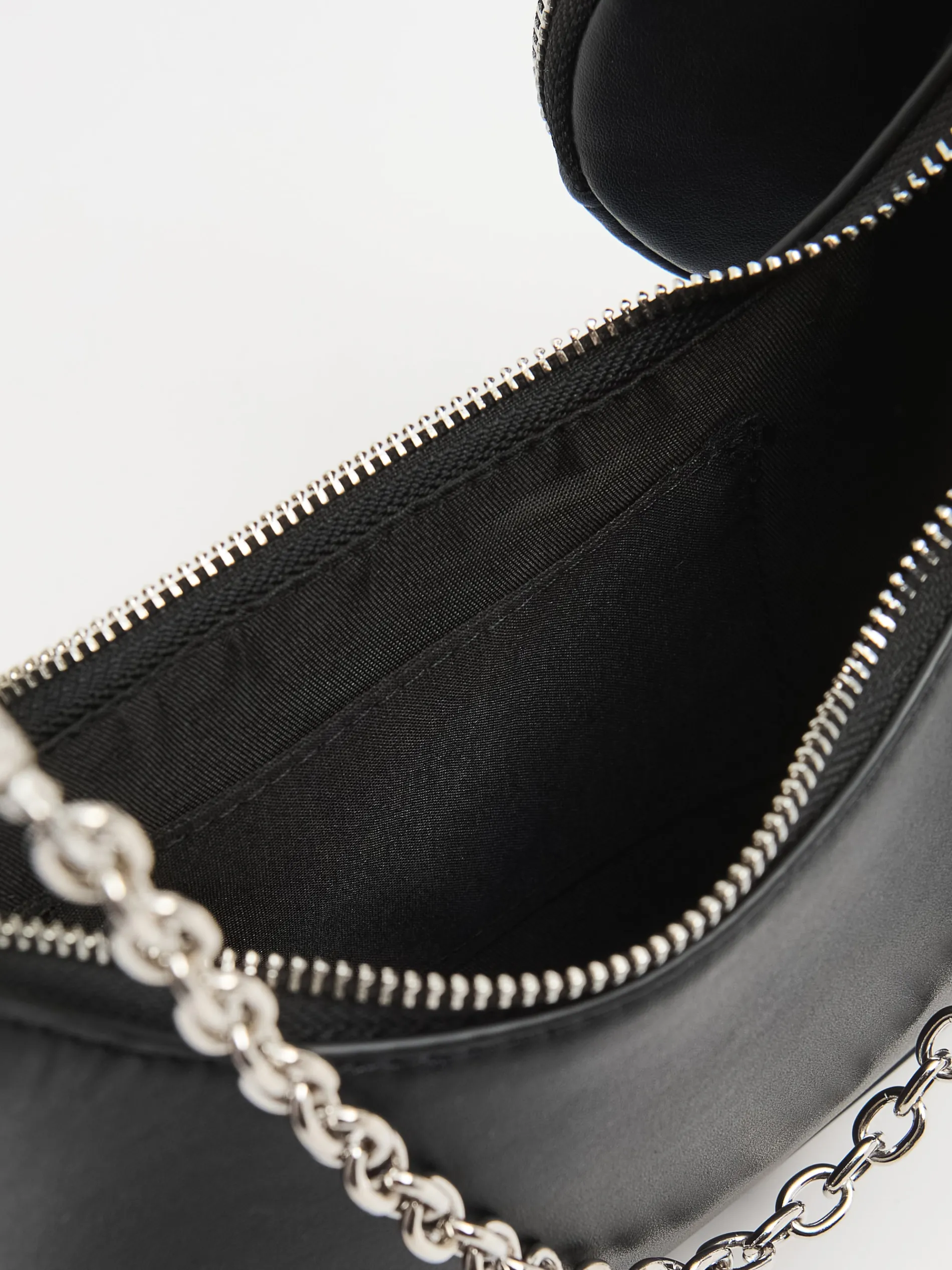 Damska mała torebka wykonana z czarnej imitacji skóry. Idealny dodatek do imprezowego outfitu! główna komora z zapięciem na zamek pasek z regulacją długości dodatkowy, dekoracyjny łańcuch metalowe detale karabińczyk do mocowania kluczy lub innych akcesoriów Wymiary produktu: 12 x 25 x 4 cm