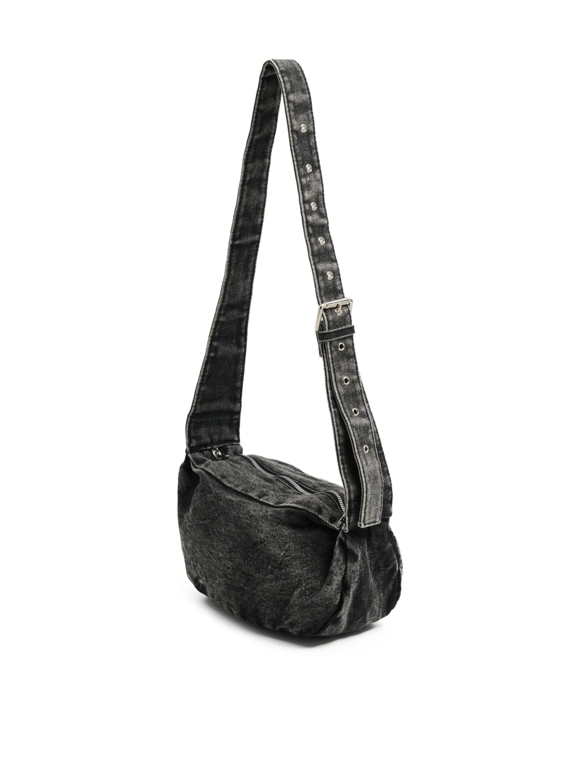 Damska mała torebka wykonana z denimu w szarym kolorze. Ten model wyróżnia wyjątkowy fason i efekt sprania na całej powierzchni. wykonana z łączonych materiałów pasek z regulacją długości główna komora z zapięciem na zamek wewnątrz mała kieszonka z zapięciem na zamek efekt sprania na całości