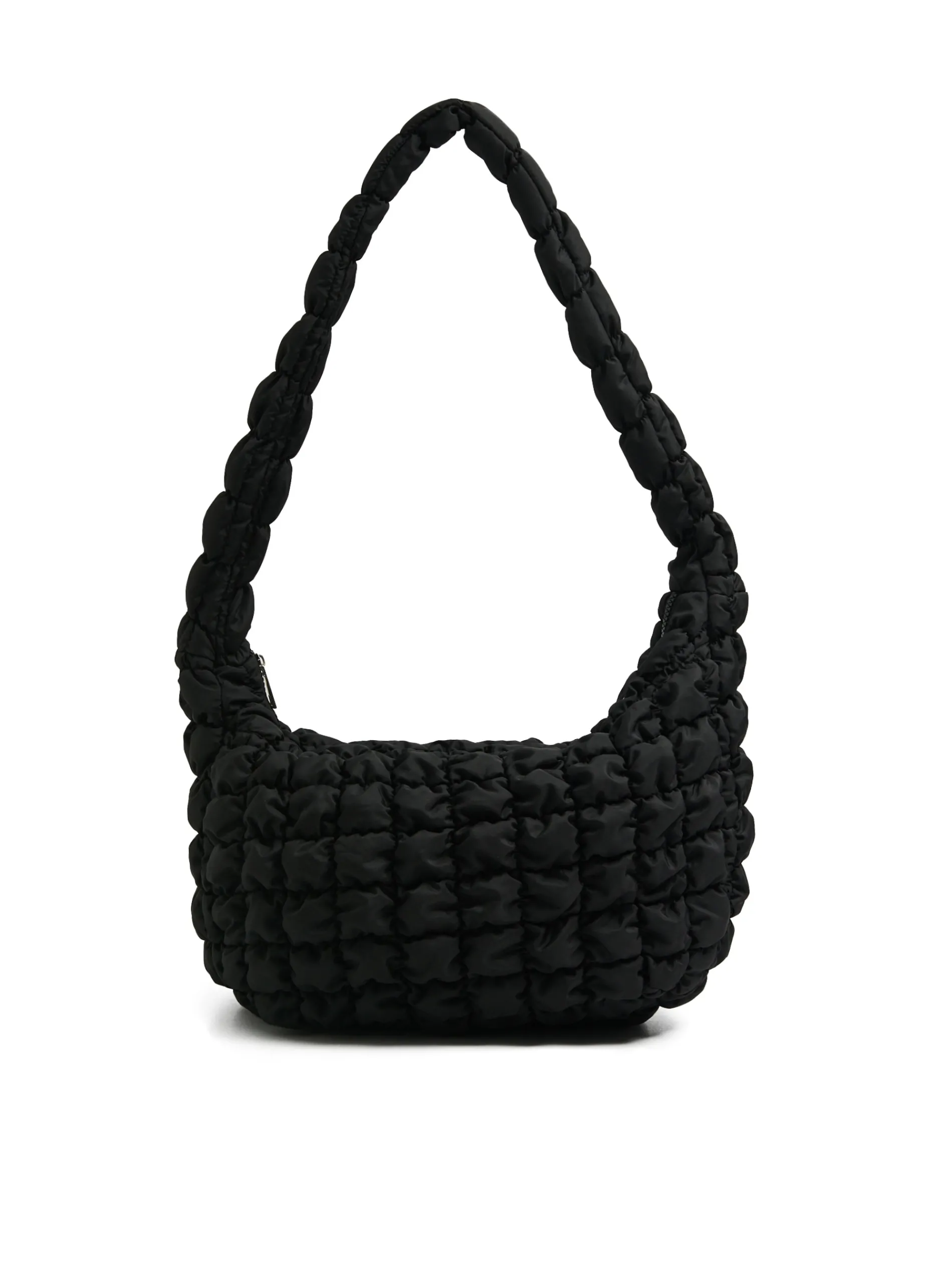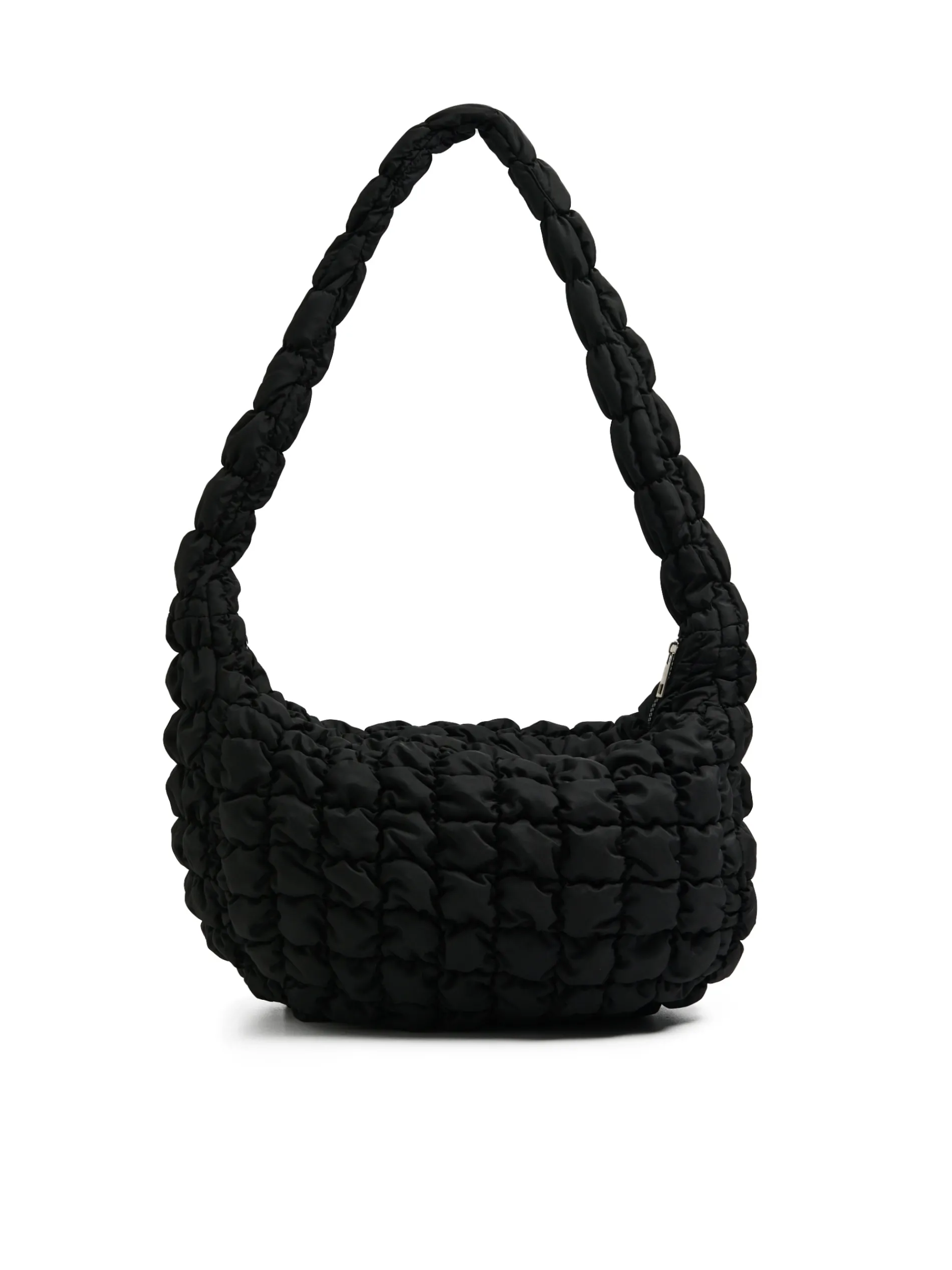 Damska torebka typu hobo uszyta z tkaniny o pikowanym wzorze. Pojemna, główna komora, wewnątrz dodatkowa kieszeń z zapięciem na zamek pikowanie na całości torebka o fasonie hobo długi pasek na ramię główna komora z zapięciem na zamek dodatkowa kieszeń z zapięciem na zamek Wymiary torebki: 60cm x 40cm