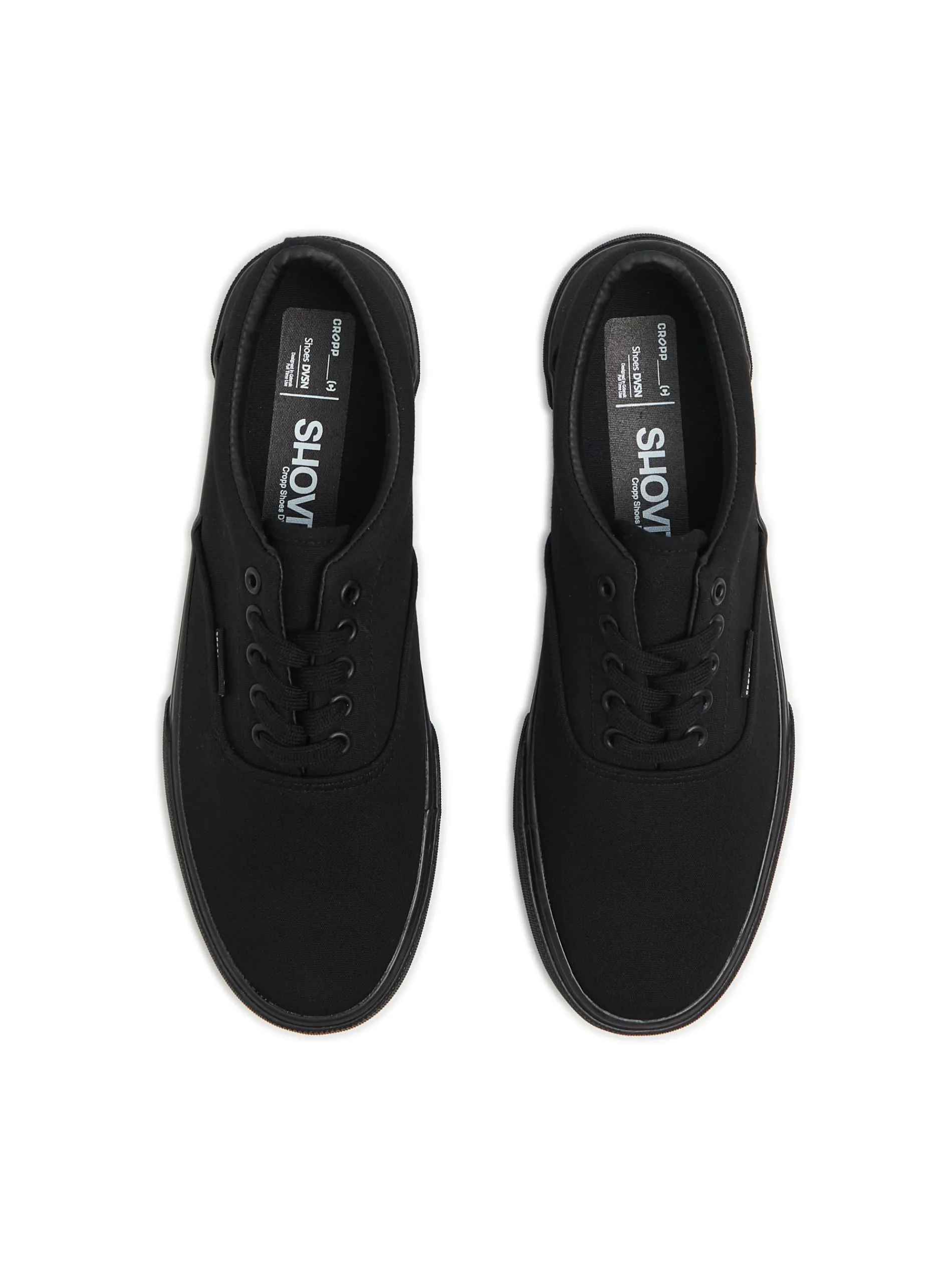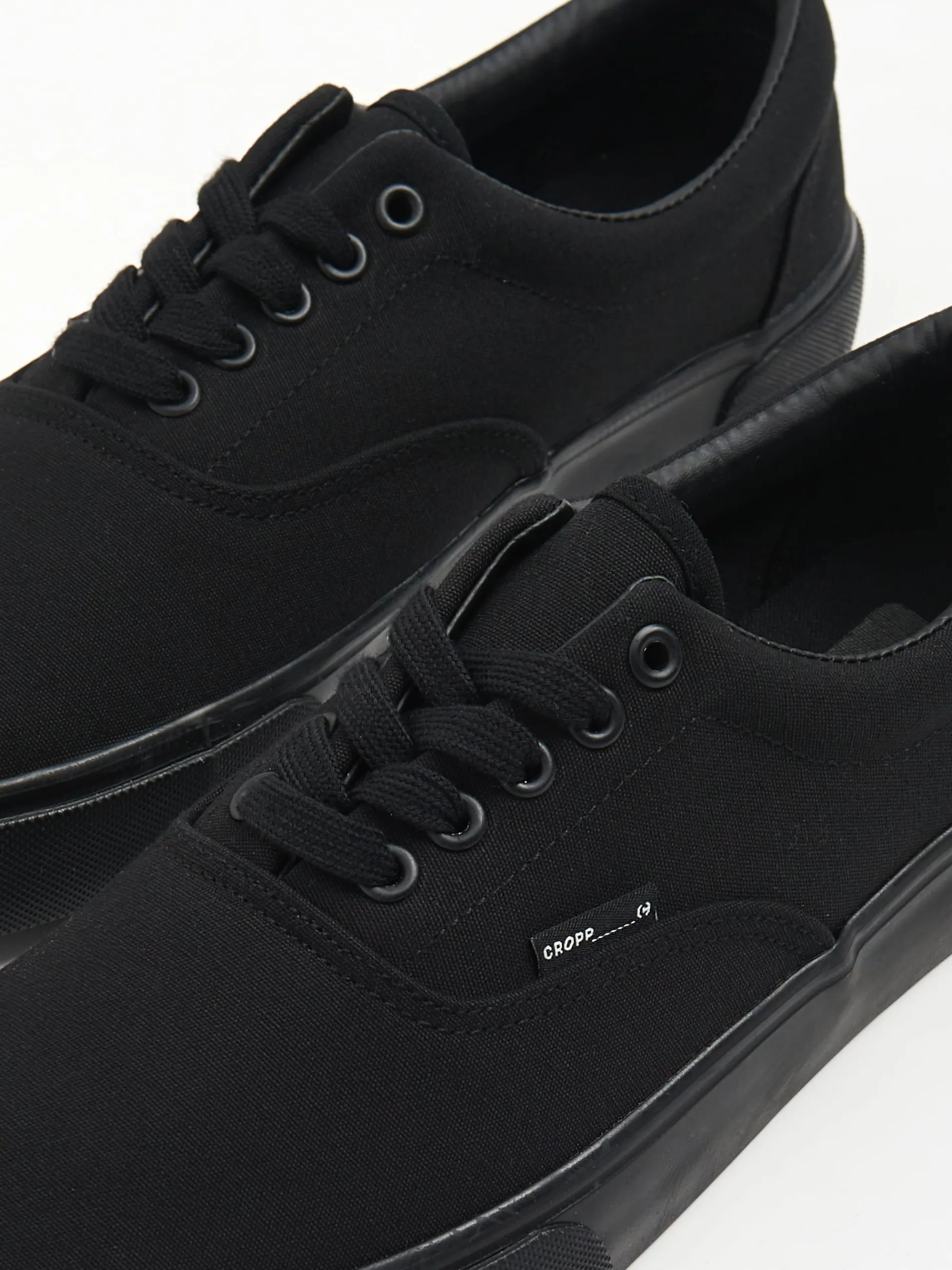 Męskie czarne trampki w stylu szkolnych tenisówek. Idealne do szkoły, na uczelnię lub do pracy. cholewka uszyta w 100% z bawełny szeroka czarna podeszwa wiązanie na czarne płaskie sznurowadła niewielka naszywka z napisem Cropp