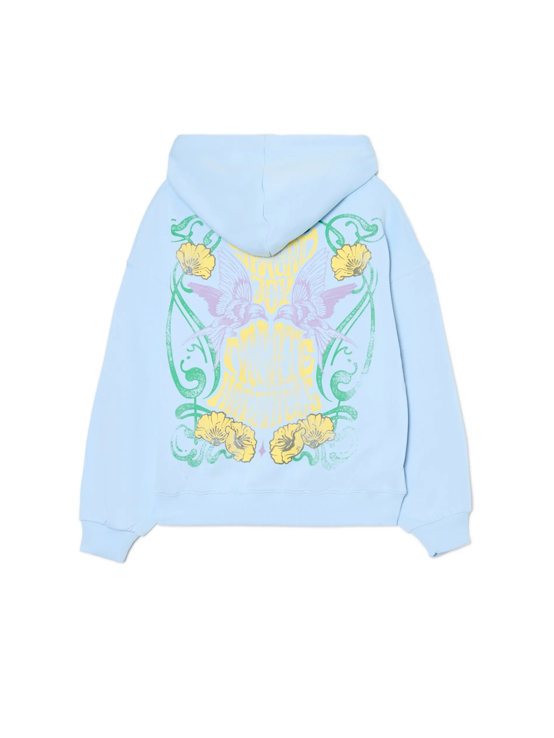 Rozpinana damska bluza z kapturem o kroju oversize uszyta z mieszanki dzianin. Po obu stronach kolorowy nadruk w motywem roślinnym i ptakami. Motywacyjna bluza na jesienne, chłodne dni. dzianinowy materiał z bawełną luźny krój oversize zapięcie na zamek na całej długości miękki kaptur z troczkami długie, swobodne rękawy dwie kieszenie po bokach dół i rękawy wykończone prążkowanym ściągaczem kolorowy nadruk z przodu i tyłu Ten produkt należy do kolekcji UNISEX – zalecamy wybranie mniejszego rozmiaru niż zazwyczaj, jeśli chcesz uniknąć efektu oversize.