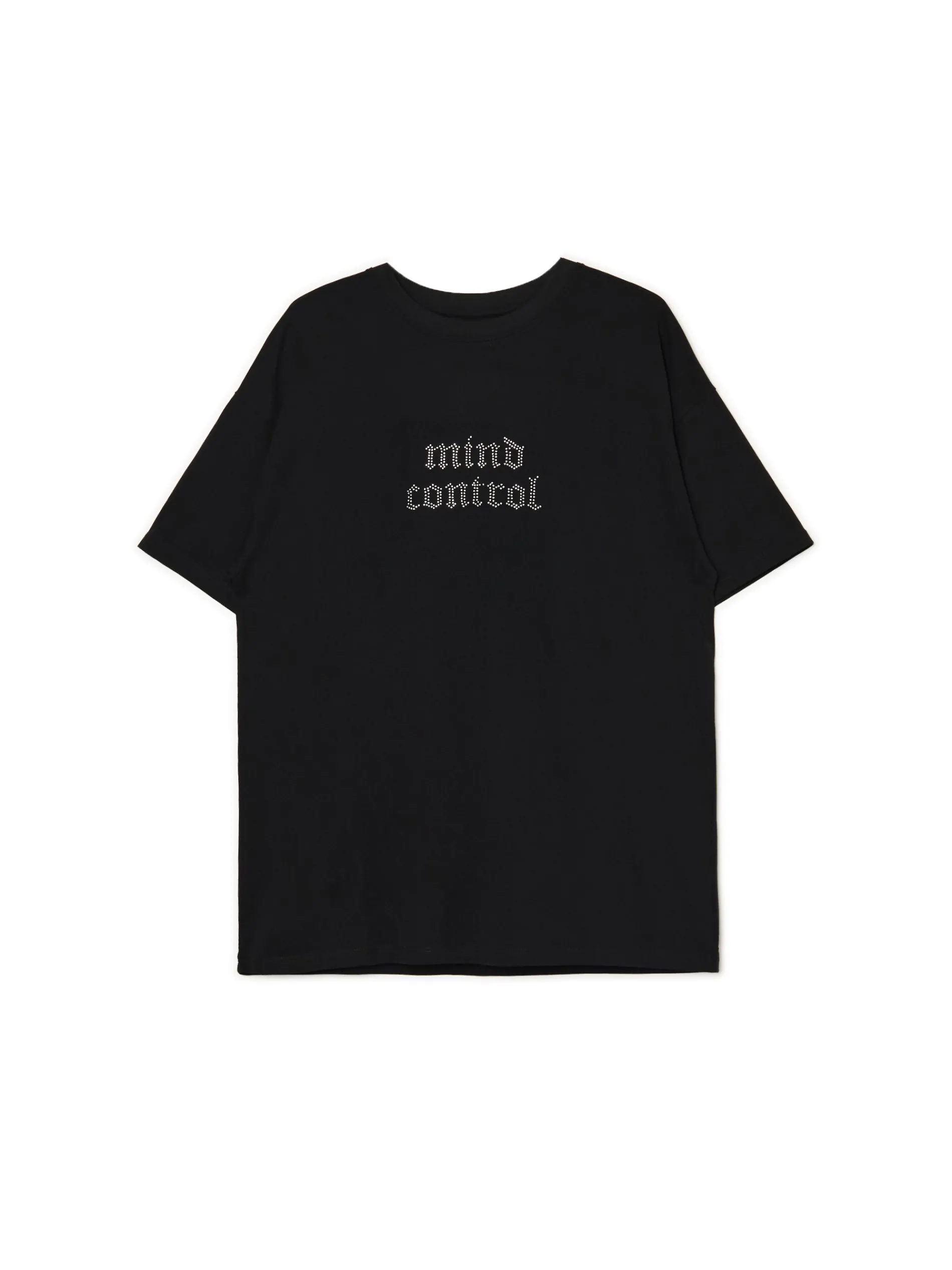 Bawełniana damska koszulka o kroju oversize z napisem z przodu i dużym nadrukiem na plecach. Sztosowy model na wieczorne wypady! 100% bawełny oversizowy krój krótkie, swobodne rękawy tekstowy nadruk z przodu na plecach stylizowany print i błyszczące kryształki Ten produkt należy do kolekcji UNISEX – zalecamy wybranie mniejszego rozmiaru niż zazwyczaj, jeśli chcesz uniknąć efektu oversize.