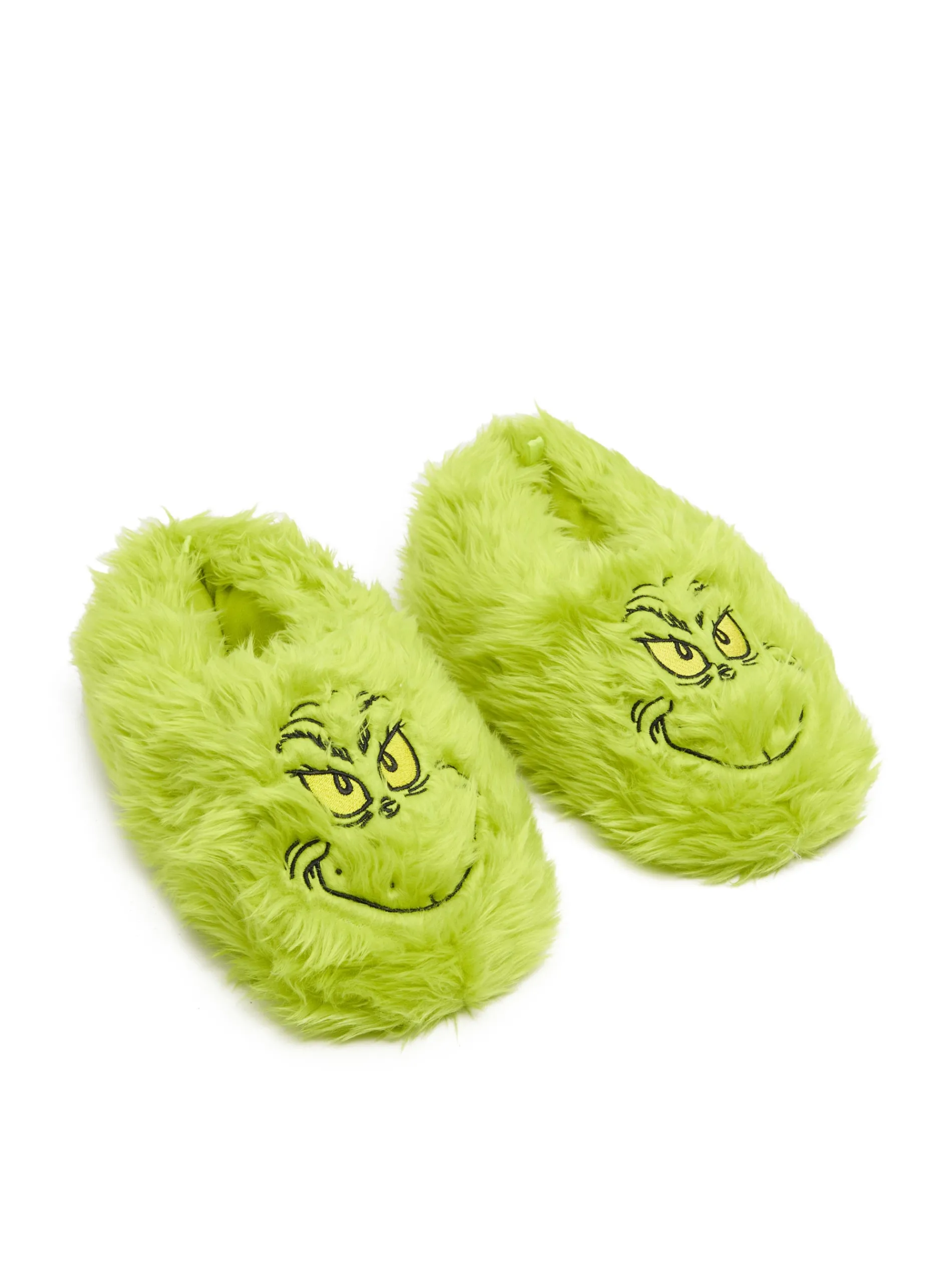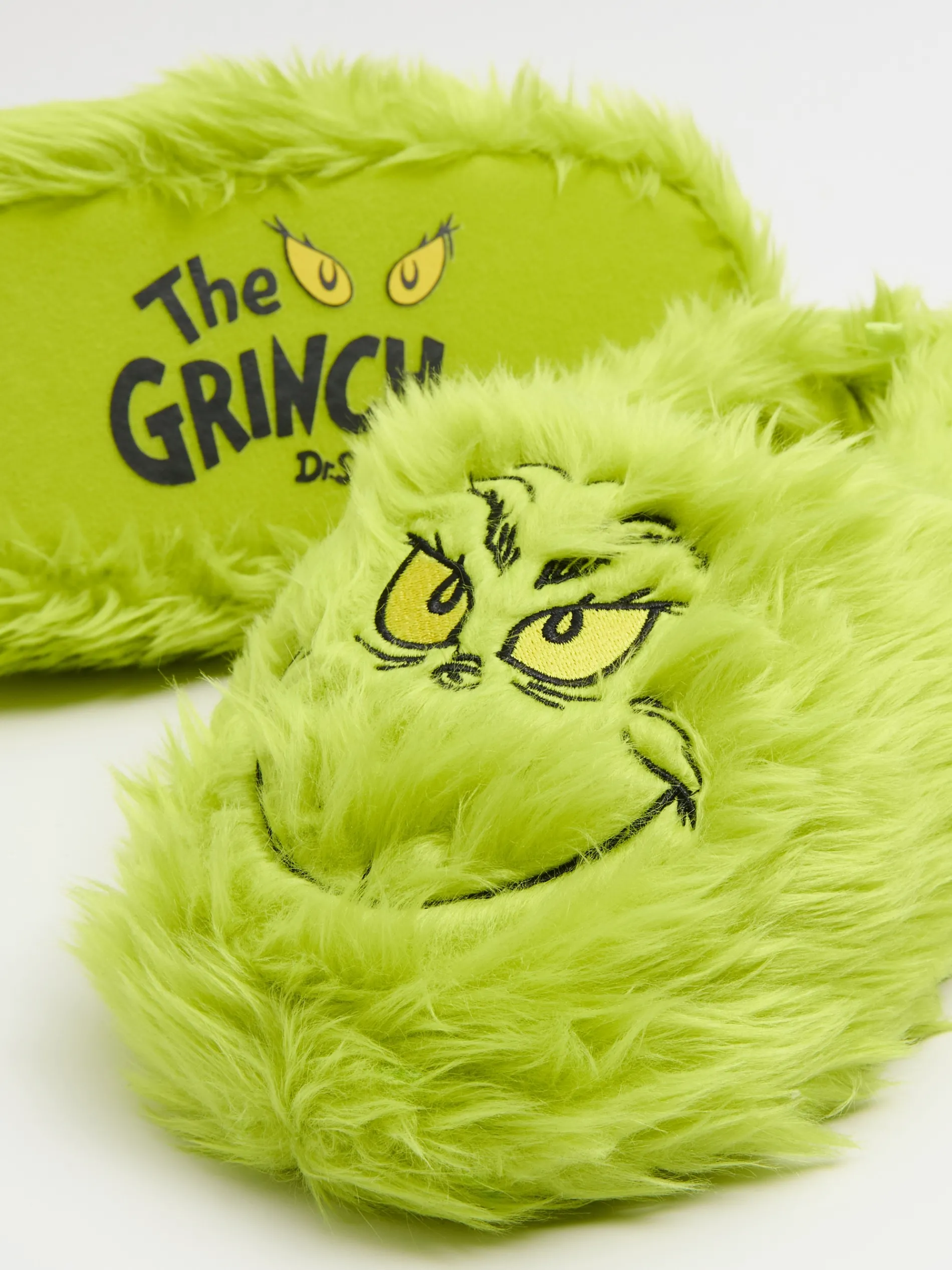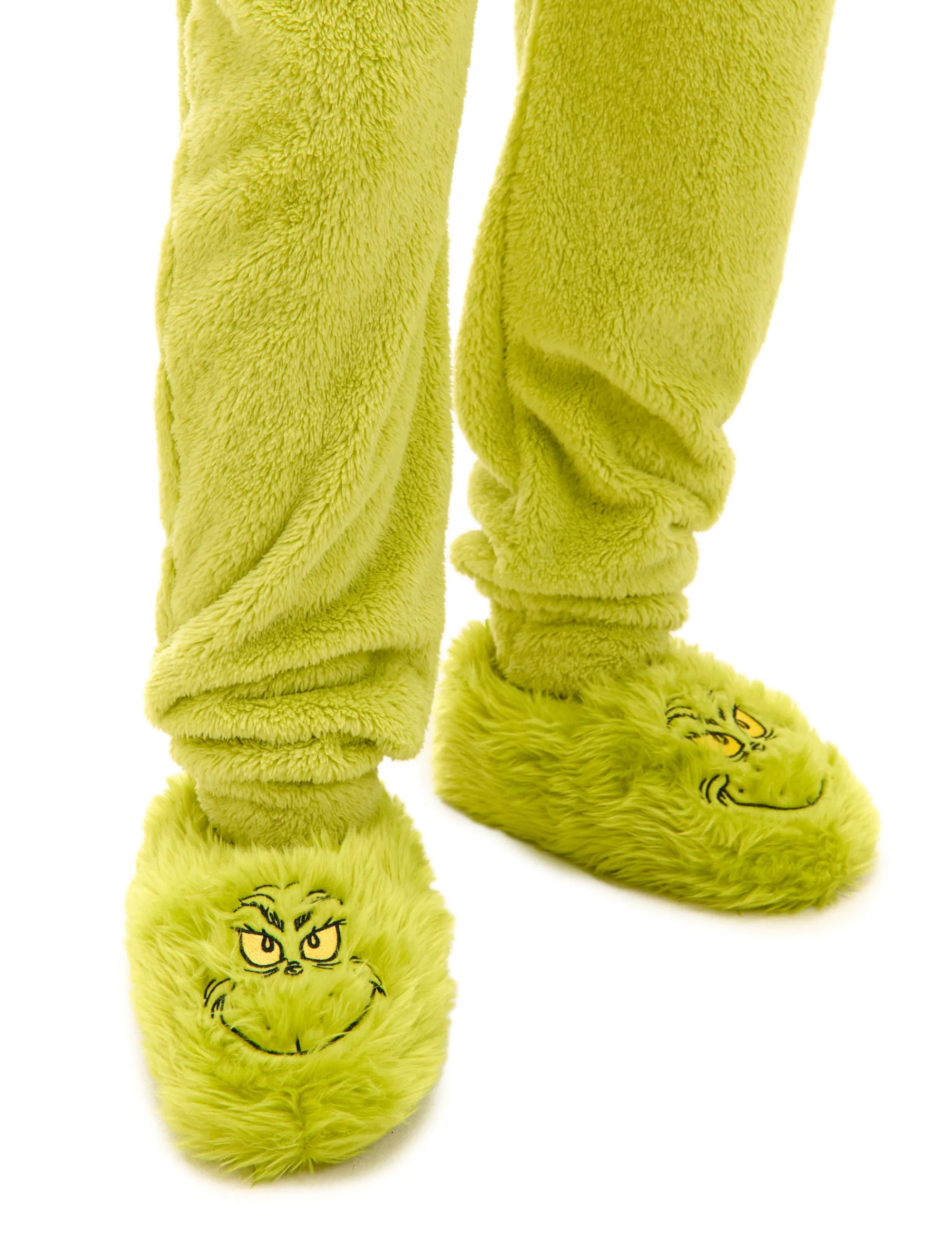 Cieplutkie, włochate i obdarzone niecnym uśmiechem: męskie kapcie domowe inspirowane postacią Grincha. Na podeszwie grinchowy napis. Może nie skradniesz w nich Świąt, ale na pewno zwrócisz na siebie uwagę! Grinch TM & © 2023 Dr. Seuss Enterprises, L.P. All Rights Reserved