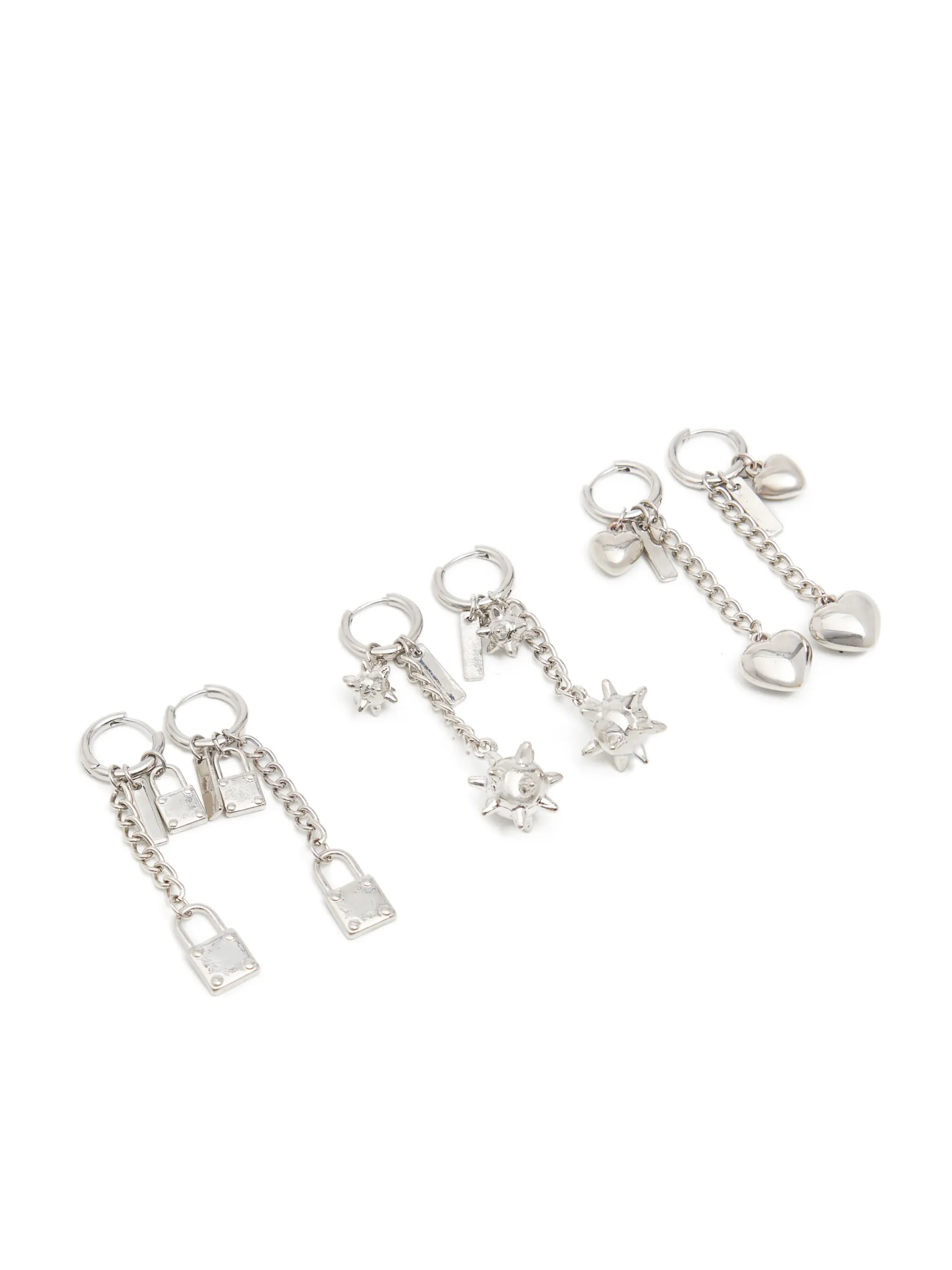 Zestaw 3 par damskich kolczyków, wykonanych ze srebrnego tworzywa. Każda para z innymi zawieszkami.