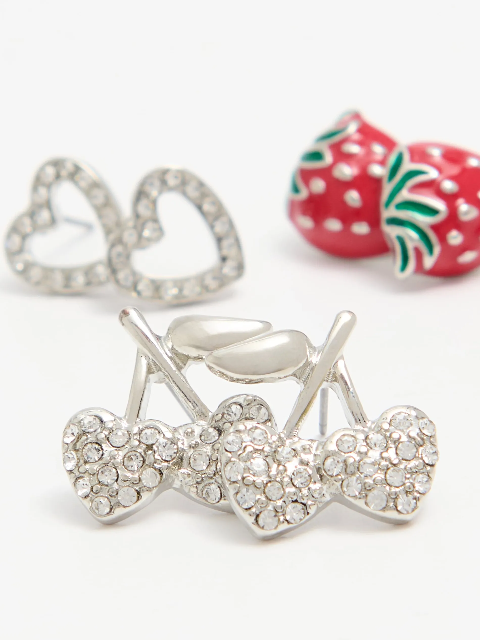Zestaw 3 par damskich kolczyków, wykonanych z tworzywa w kolorze srebrnym. W zestawie motyw serca i wiśni zdobionych cyrkoniami oraz truskawek w ich naturalnym, czerwonym kolorze. Dodatkowo wygodne zapięcie na sztyft.