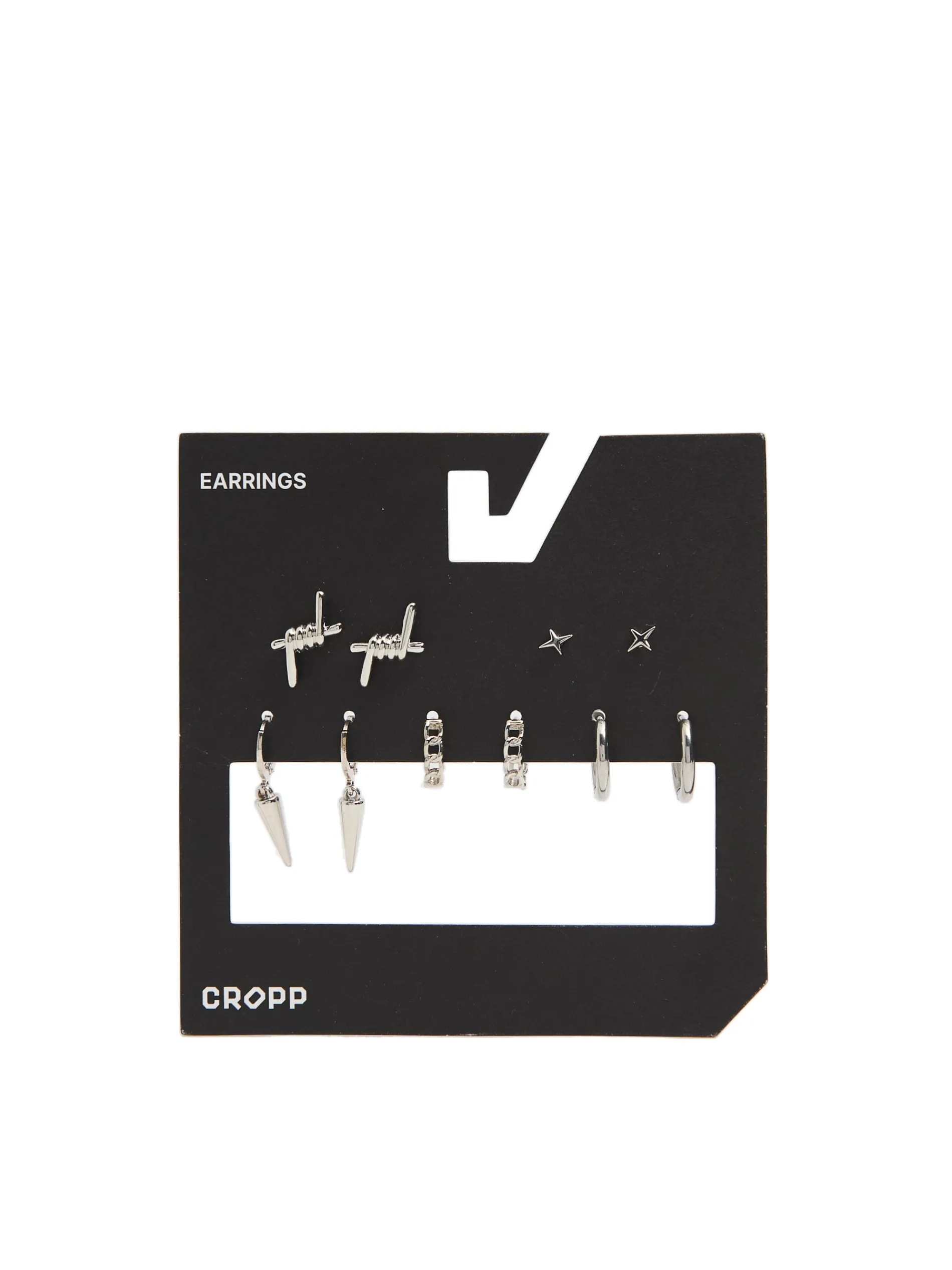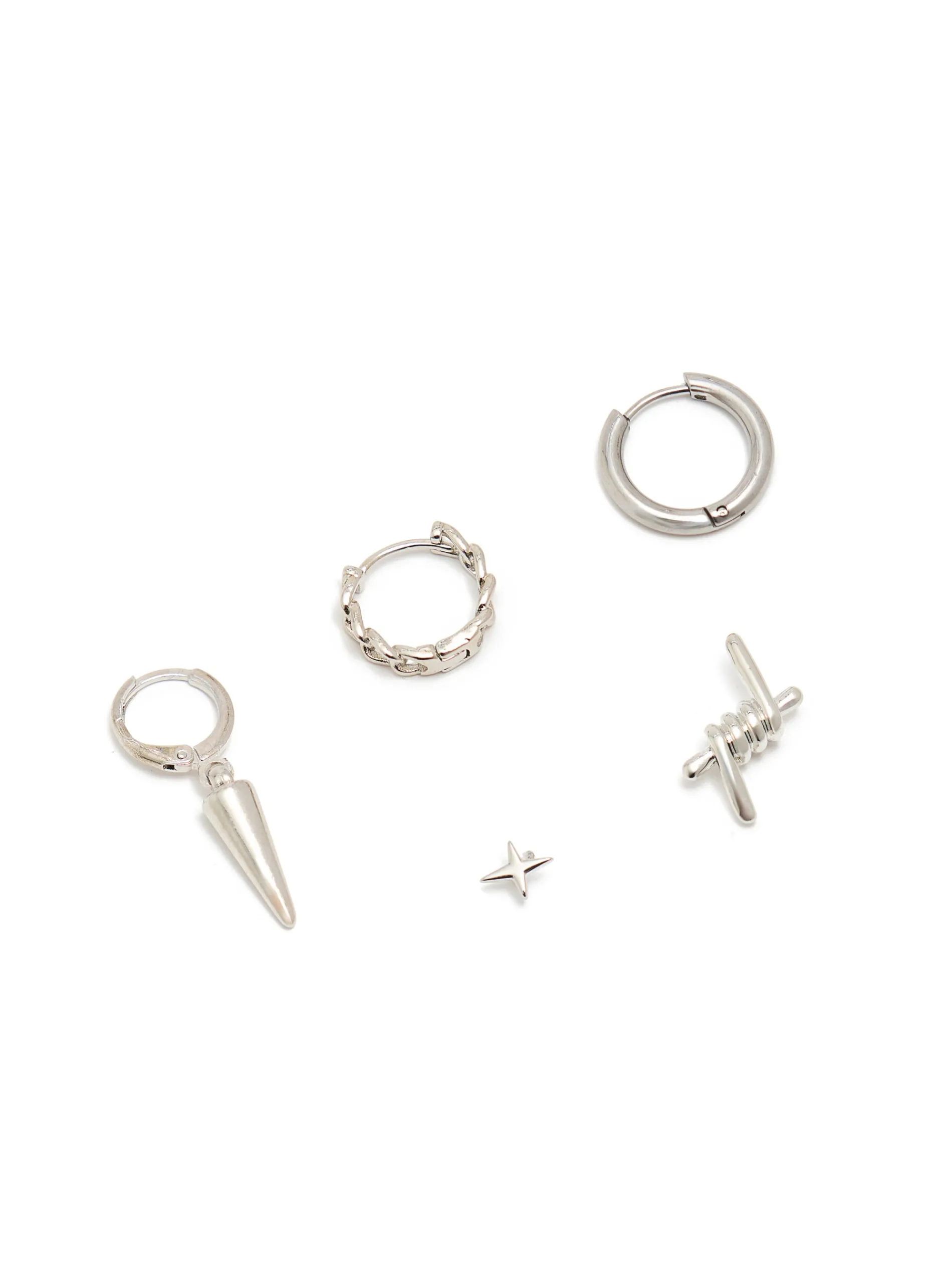 5 pack męskich kolczyków wykonanych z tworzywa w kolorze srebrnym. Na każdej parze unikatowy motyw. Możesz je miksować dowolnie!