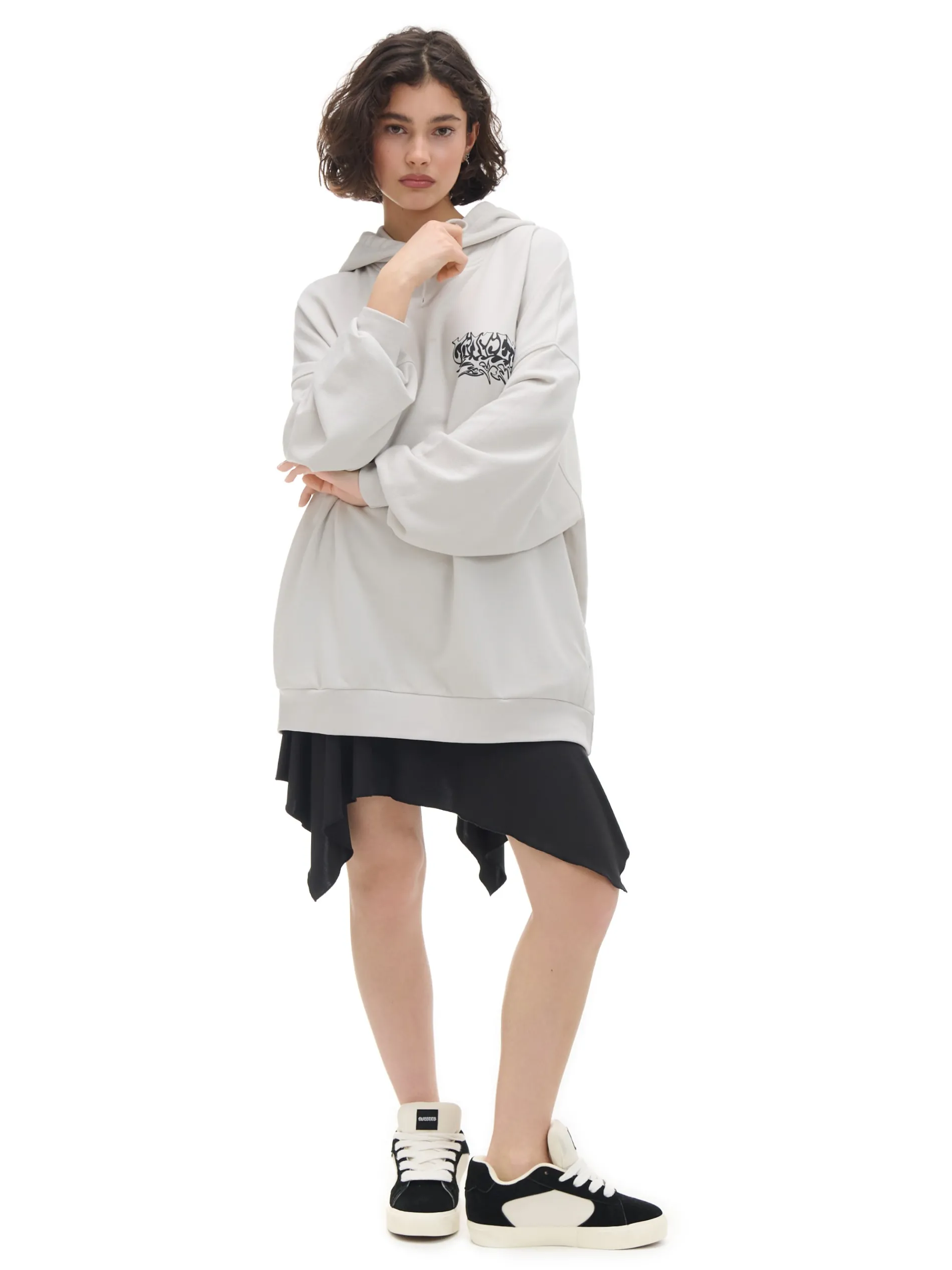 Damska bluza uszyta z dzianiny o wysokiej zawartości bawełny w kroju oversize. Jasnoszary kolor materiału i kontrastowy print będą fitowały z wieloma dodatkami! dzianinowy materiał z bawełną krój oversize długie rękawy z obniżoną linią ramion dół i rękawy wykończone ściągaczem dwie kieszenie z przodu szeroki kaptur z regulacją obwodu Wzrost modelki: 172 cm
