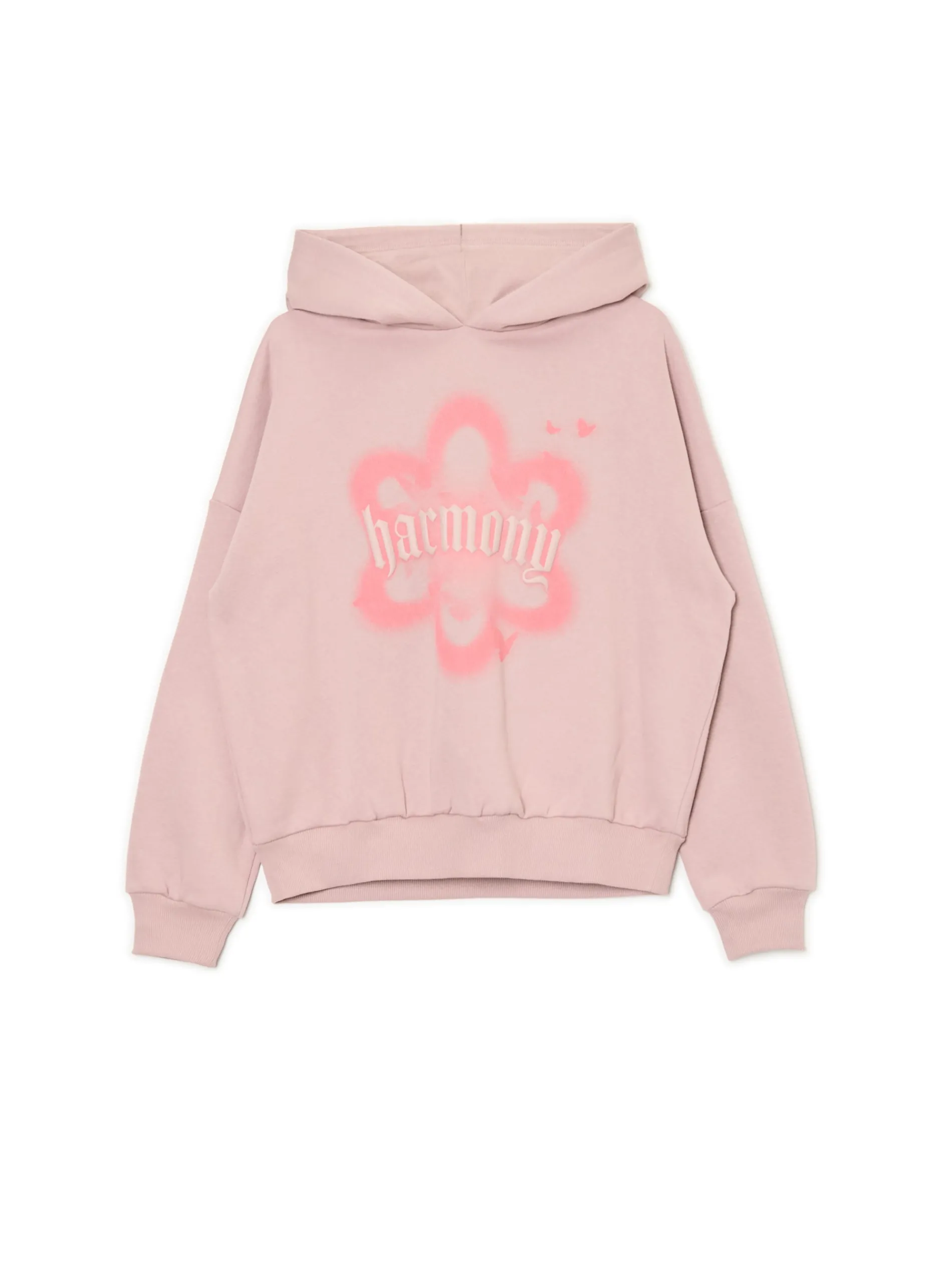 Damska bluza z kapturem uszyta z mieszanki dzianin z dodatkiem miękkiej i trwałej bawełny fleecy. Na przodzie delikatnie sprany kwiatowy nadruk z napisem. dzianinowy materiał z bawełną krótki krój dół i mankiety wykończone ściągaczami miękki kaptur duży nadruk z przodu