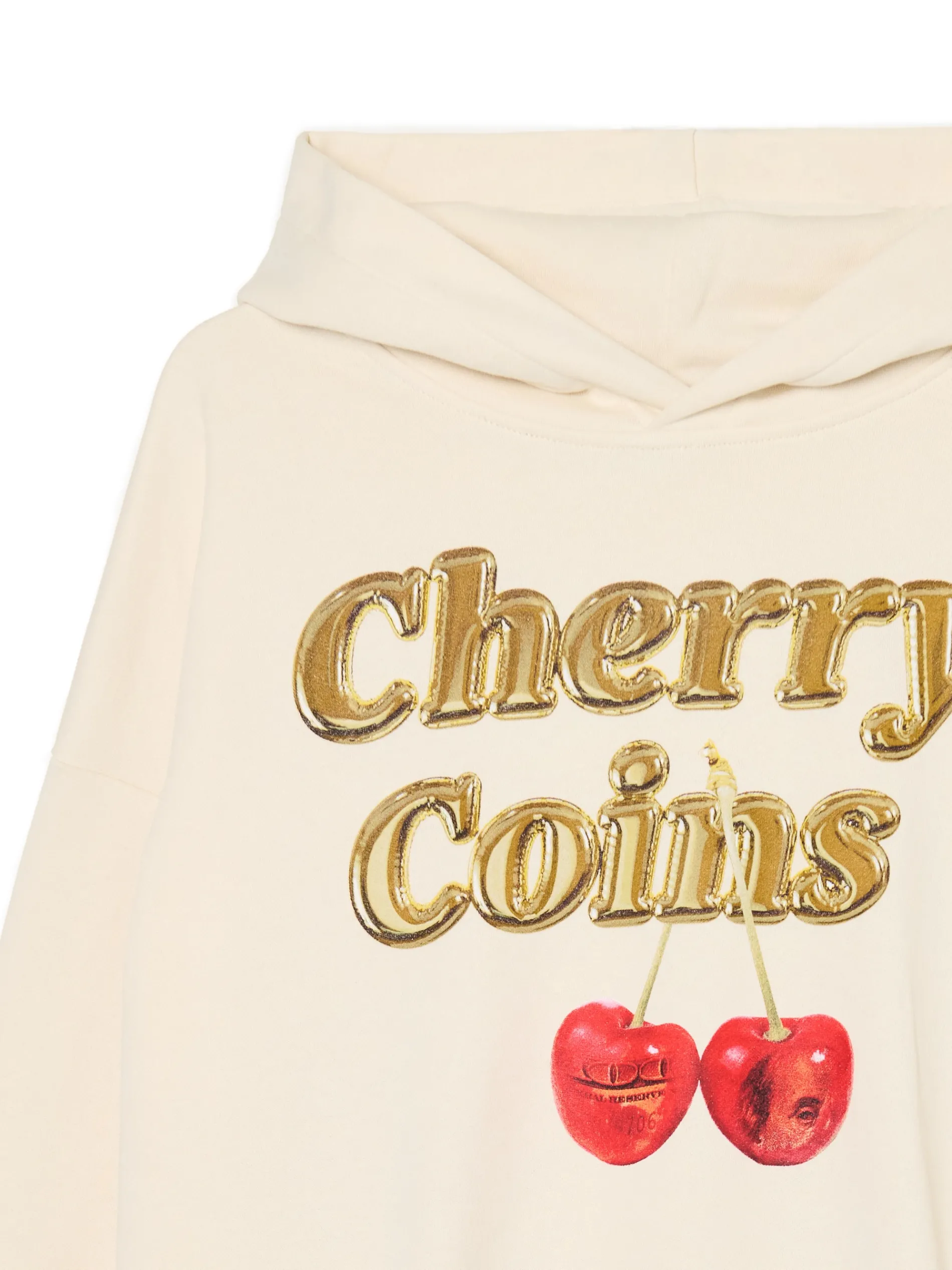 Kremowa męska bluza typu hoodie uszyta z mieszanki dzianin. Praktyczne kieszenie, duży kaptur i nadruk z owocowym motywem na przodzie. uszyta z miękkiej dzianiny z bawełną luźny krój z obniżoną linią ramion miękki kaptur dwie kieszenie boczne nadruk z motywem wiśni Wzrost modela: 185 cm