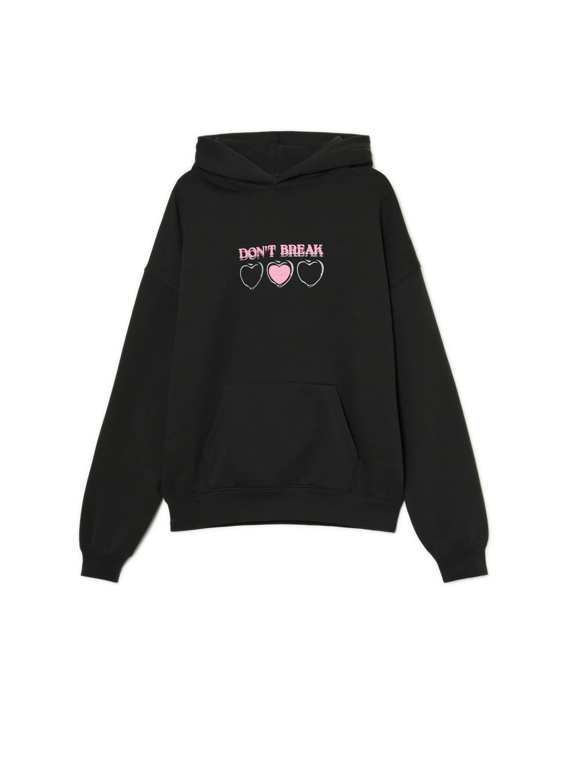 Ciepła, damska bluza typu hoodie, uszyta z mieszanki dzianin. Ten item otuli Cię, dzięki miękkiej bawełnie typu fleecy w składzie a praktyczna kieszeń kangurka ogrzeje Twoje ręce przed zimnem. dzianinowy materiał z bawełną regularny krój obszerny kaptur długie rękawy z obniżoną linią ramion dół i rękawy wykończone ściągaczem kieszeń kangurka na przodzie mały nadruk na piersi, duży nadruk na plecach
