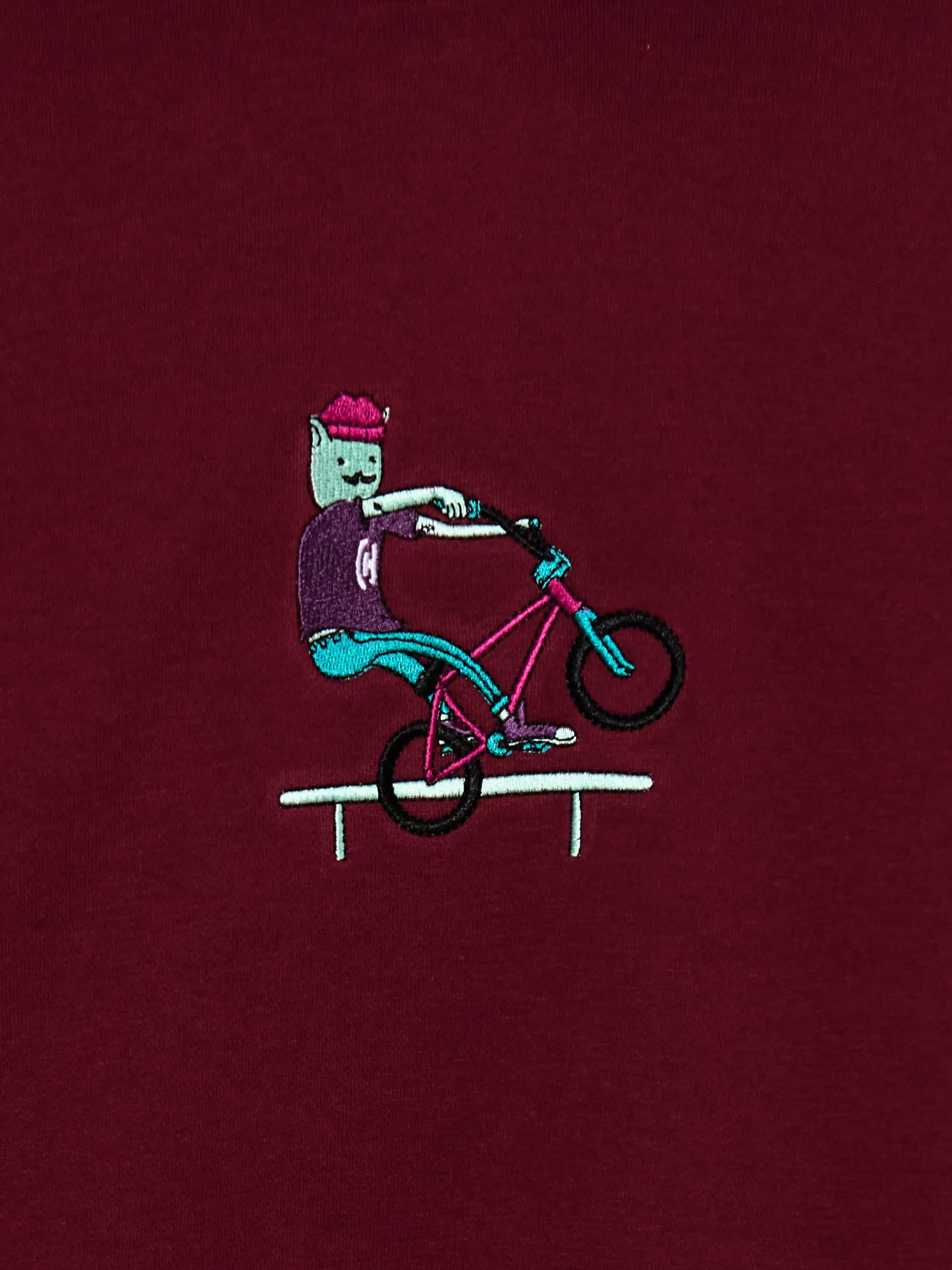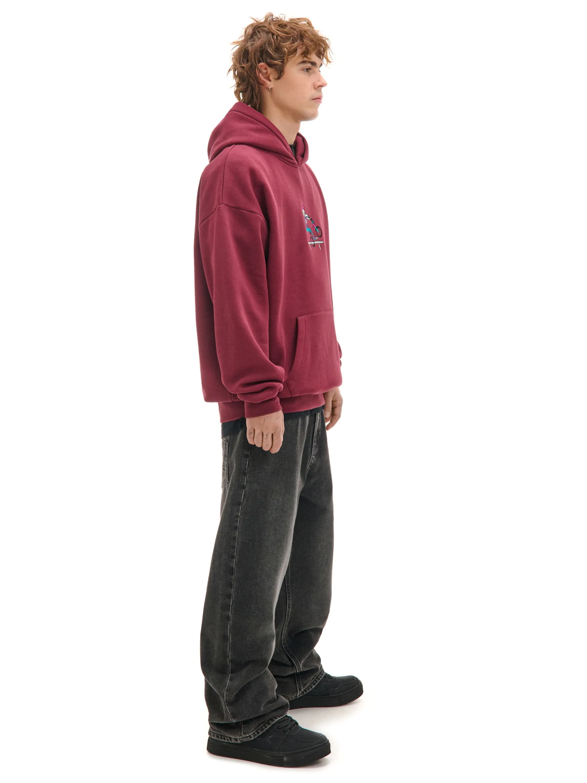 Na spacer, siłownię, do skate parku z kumplami – bluz nigdy dość, potrzebne są na każdą okazję! Może ten męski model typu hoodie w bordowym kolorze, uszyty z przyjemnej w dotyku dzianiny, przypadnie Ci do gustu. dzianinowy materiał z bawełną luźny krój z obniżoną linią ramion miękki kaptur długie, proste rękawy kieszeń kangurka na przodzie dół i rękawy wykończone prążkowanym ściągaczem na środku dekoracyjny haft