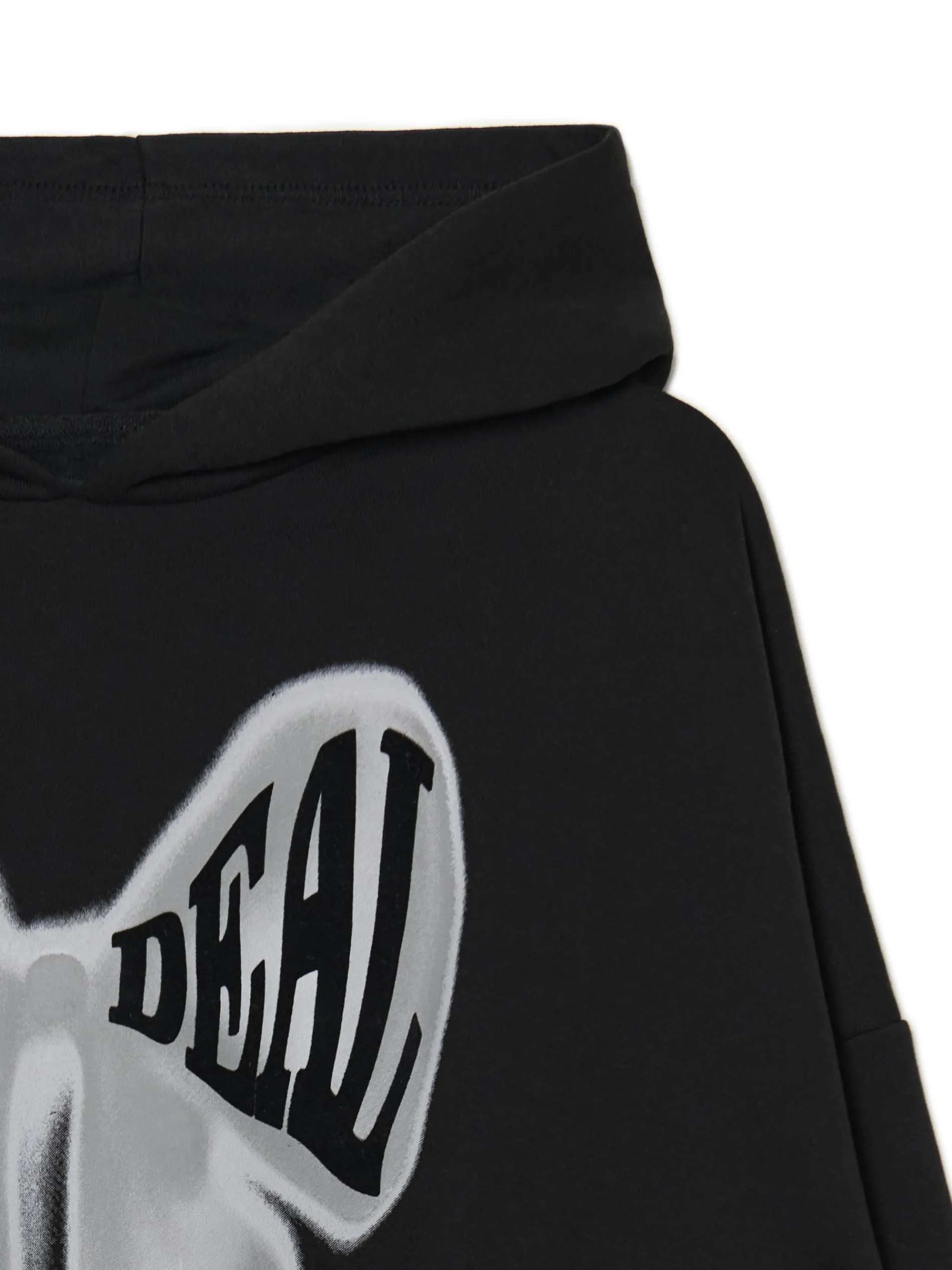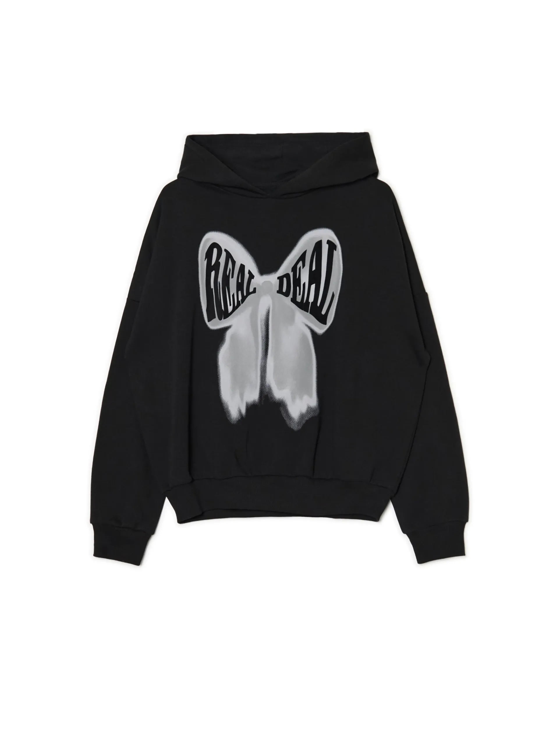 Damska bluza z kapturem uszyta z mieszanki dzianin z dodatkiem miękkiej i trwałej bawełny fleecy. Na przodzie delikatnie sprany nadruk z motywem kokardy. dzianinowy materiał z bawełną krótki krój dół i mankiety wykończone ściągaczami miękki kaptur duży nadruk z przodu Wzrost modelki: 177 cm