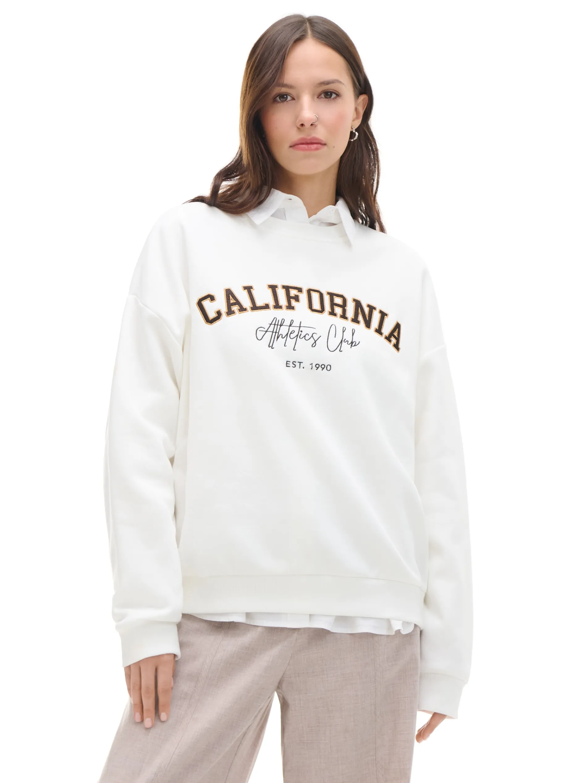 Damska bluza typu college uszyta z dzianiny z dodatkiem miękkiej bawełny fleecy. Na przodzie ozdobne naszywki w formie tekstowej. bluza typu college, uszyta z dzianiny o wysokiej zawartości bawełny dekolt, dół i rękawy z dzianinowym ściągaczem ozdobne naszywki z przodu