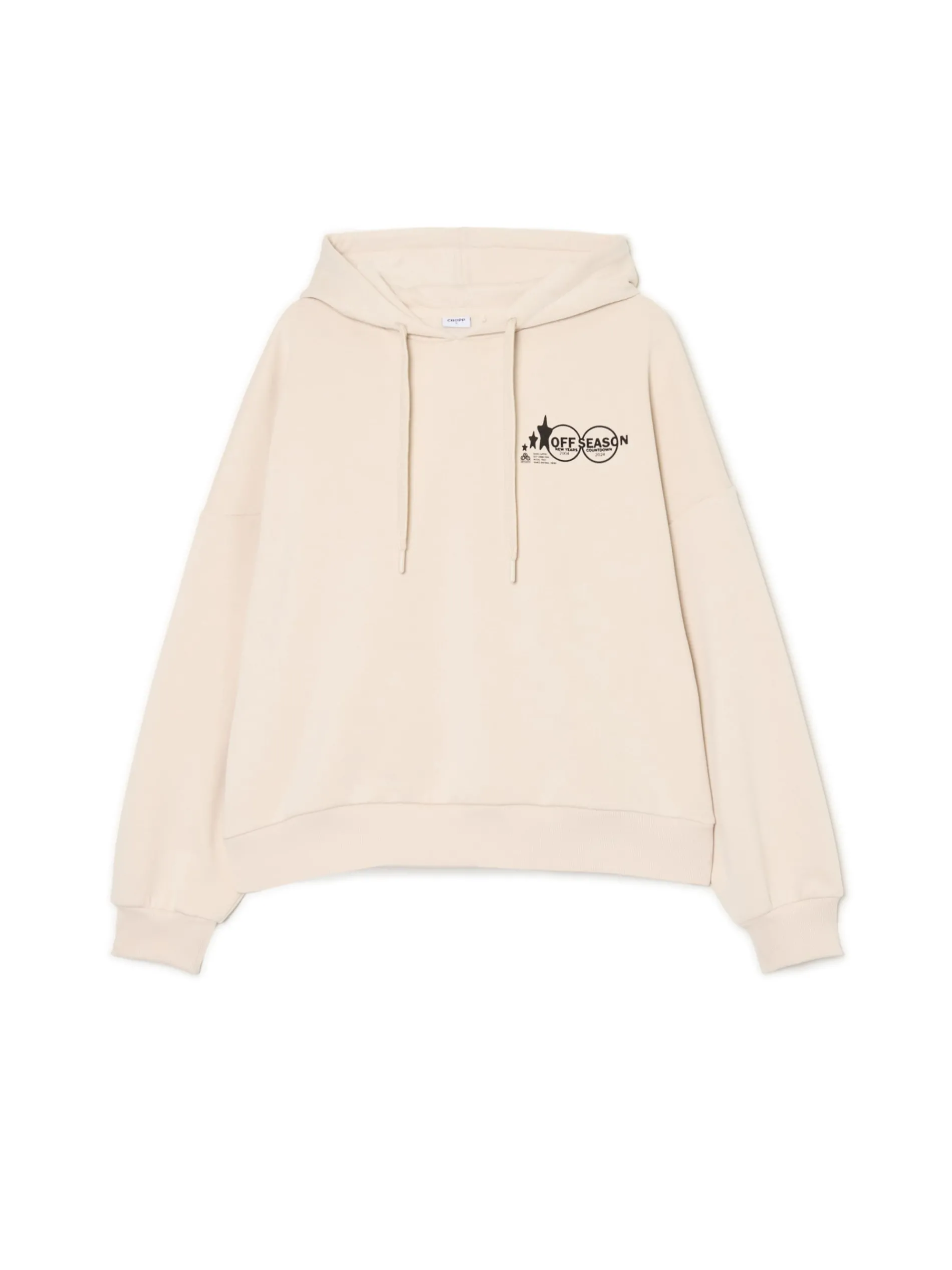 Damska luźna bluza hoodie uszyta z mieszanki dzianin z dodatkiem miękkiej bawełny fleecy. Wykończenie ściągaczami zapobiega unoszeniu się materiału. Item wygodny zarówno w czasie zimowych spacerów z Bestie, jak i chillowania na kanapie. dzianinowy materiał z bawełną regularny krój miękki kaptur z troczkami długie, swobodne rękawy dół i rękawy wykończone prążkowanym ściągaczem mały nadruk na piersi, duży nadruk na plecach
