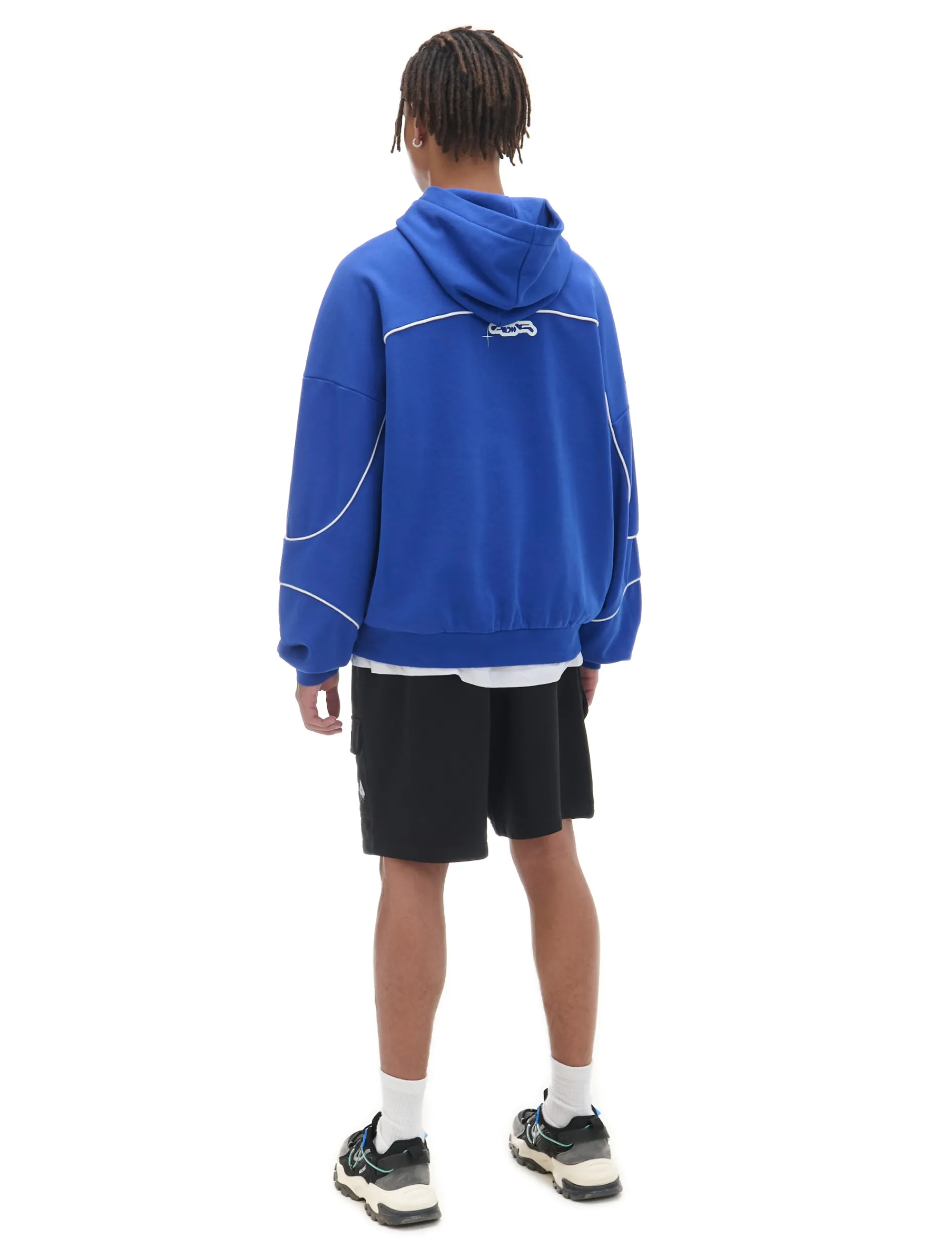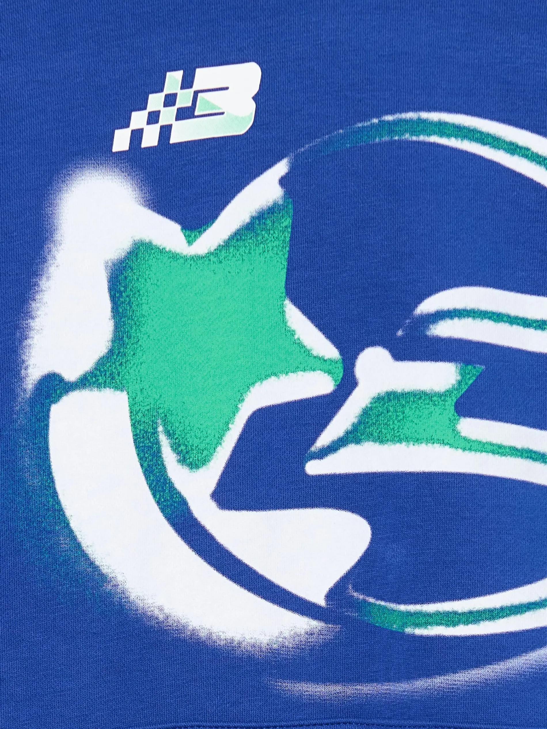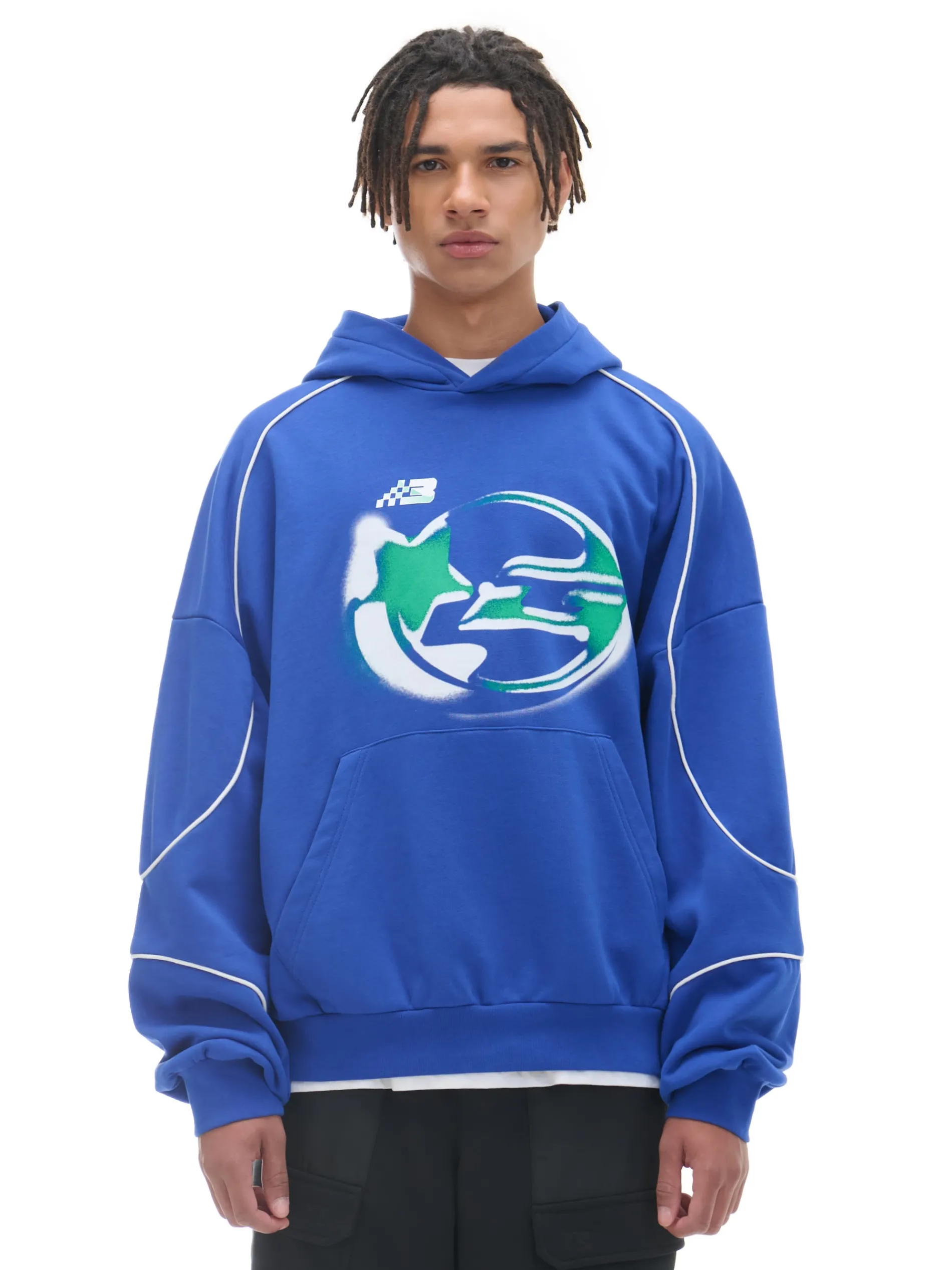Męska niebieska bluza z kapturem, uszyta z dzianiny zawierającej bawełnę. obszerny krój boxy luźny kaptur rękawy i dół zakończone ściągaczem z przodu kieszeń kangurka opuszczona linia ramion nadruk z przodu i na plecach