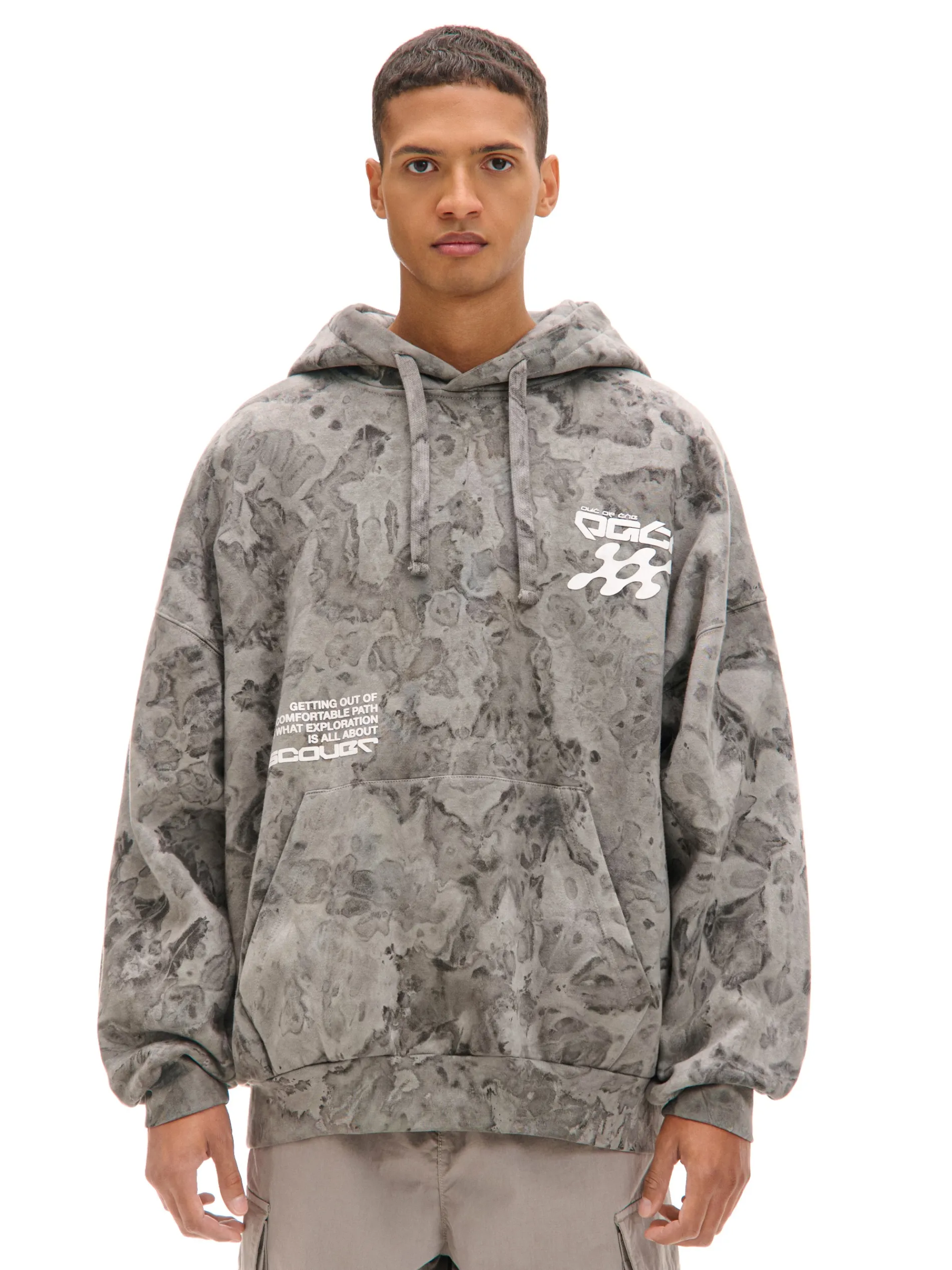 Męska bluza typu hoodie o kroju oversize, uszyta z miękkiej i trwałej mieszanki dzianin. Item zawiera kieszeń typu kangurka oraz nadruk na całej powierzchni z kontrastowymi napisami z przodu. Sztosowa bluza w streetowym stylu! dzianinowy materiał z bawełną krój oversize miękki kaptur z troczkami długie rękawy z obniżoną linią ramion dół i mankiety wykończone ściągaczami kieszeń kangurka z przodu nowoczesny nadruk all over efekt marble dye, czyli marmurkowy wzór na całości na przodzie tekstowe nadruki