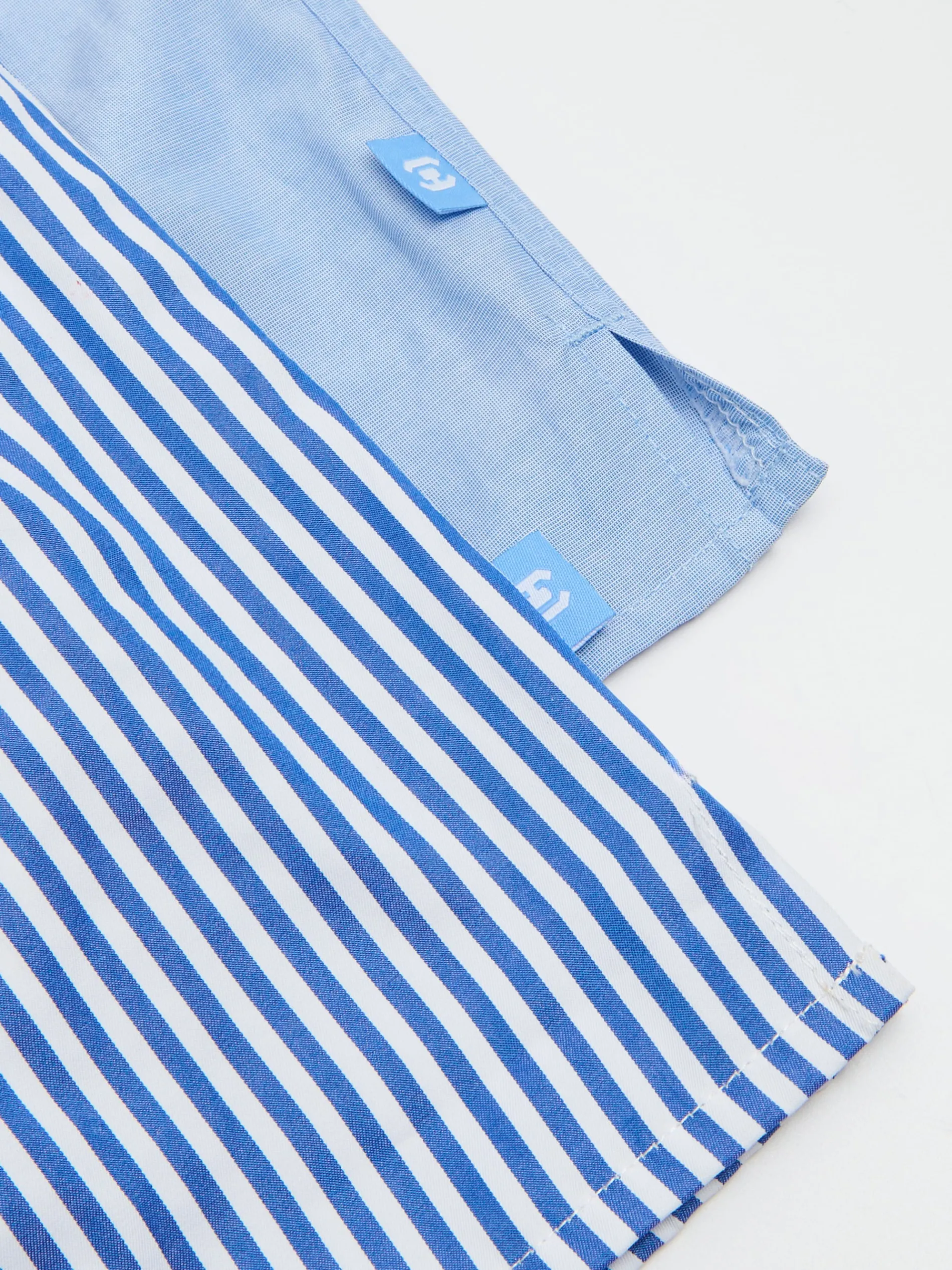Zestaw dwóch par męskich bokserek uszytych z bawełnianej tkaniny. Swobodny, luźny krój zapewnia komfort noszenia. Dostępne również w innym wariancie kolorystycznym. 100% bawełny regularny stan elastyczna gumka w pasie wzór w paski na całości gładki wzór na drugim modelu naszywka Cropp