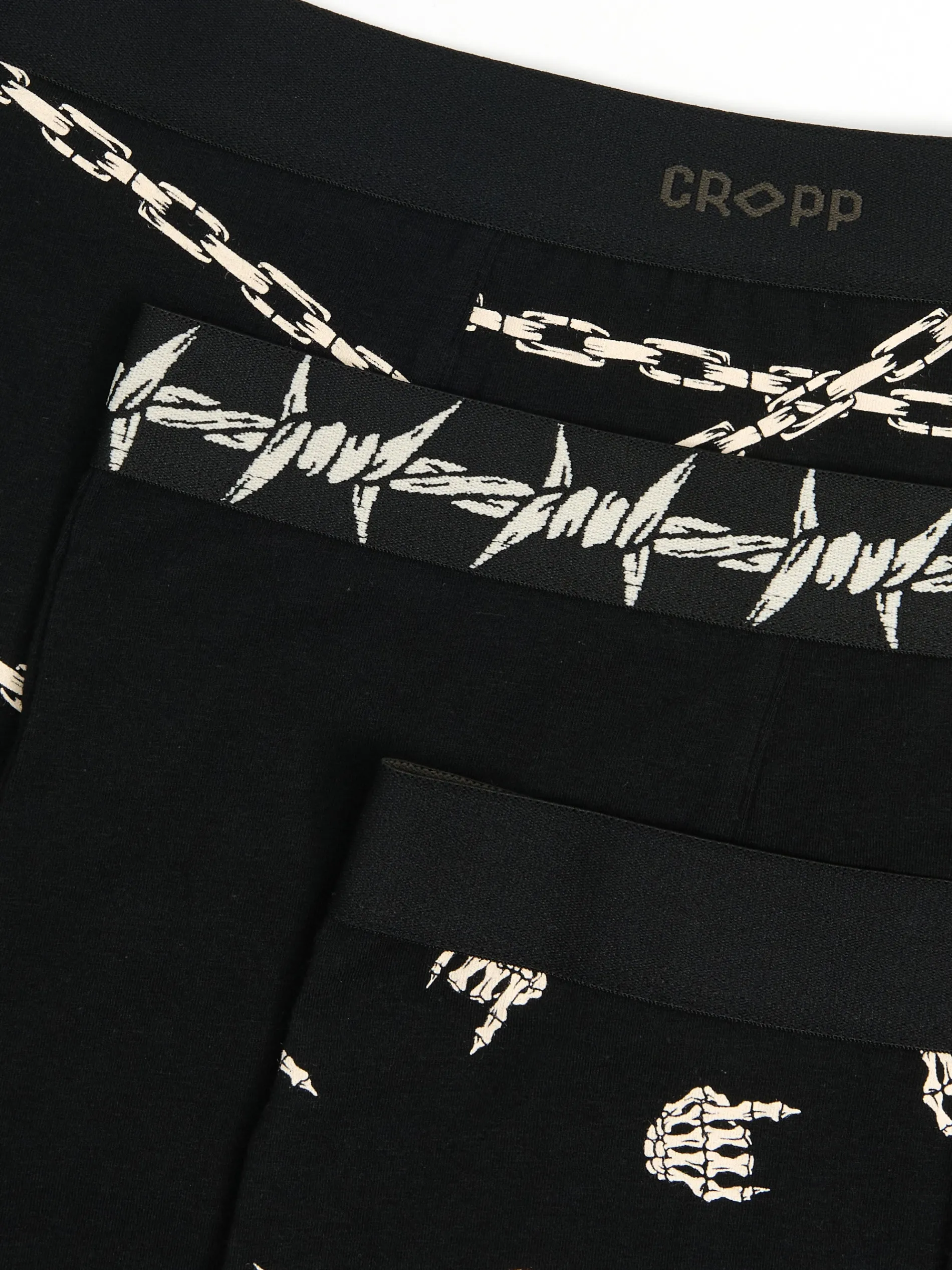 Zestaw trzech par majtek typu bokserki o regularnym kroju z kontrastowym nadrukiem w punkowym stylu na każdą okazję. bawełna z dodatkiem elastycznych włókien regularny stan elastyczna gumka w pasie kontrastowy nadruk all over