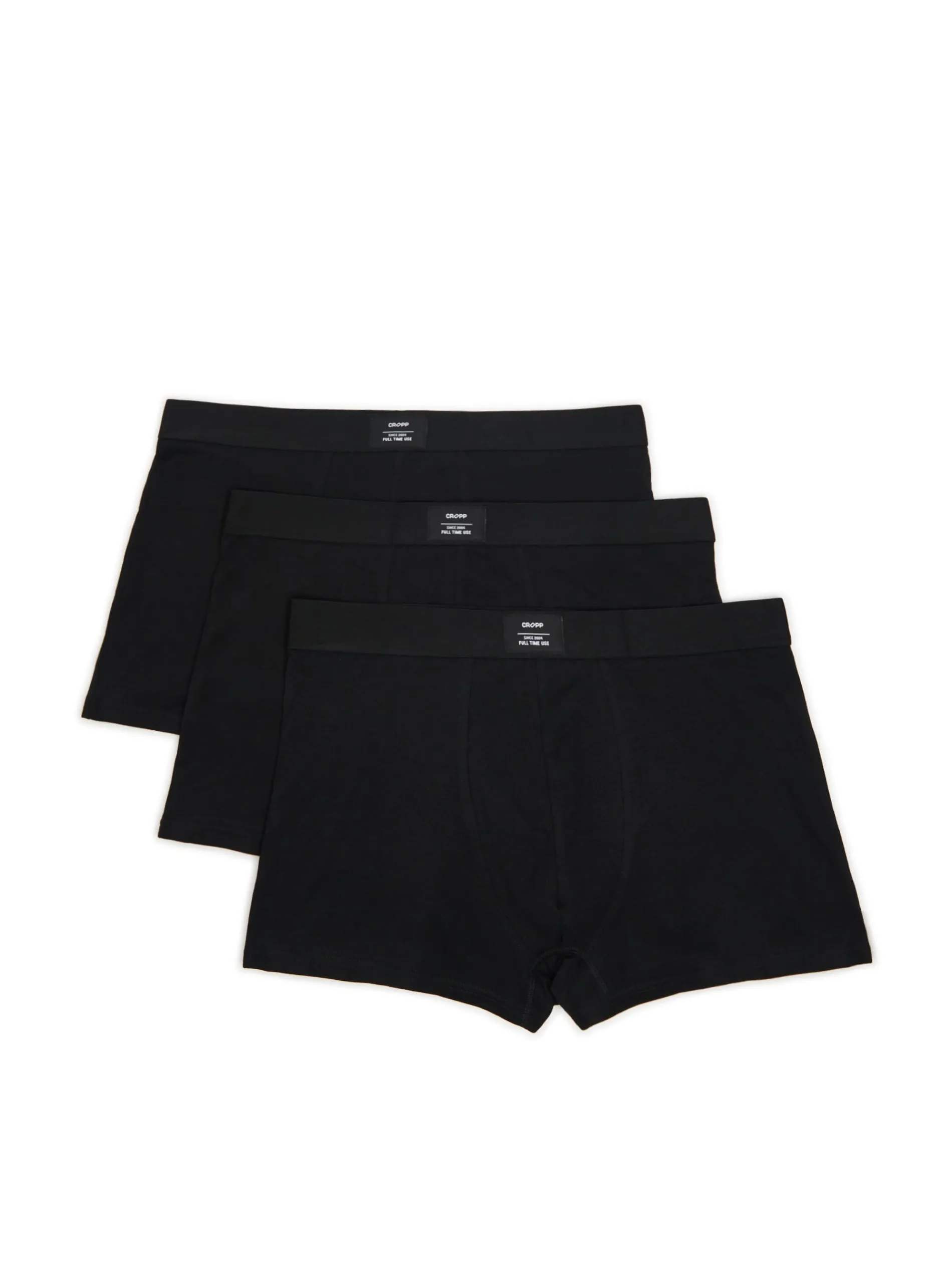 Trójpak męskich czarnych bokserek, uszytych z dzianiny o bardzo wysokiej zawartości bawełny. W pasie elastyczna gumka i naszywka z napisami z przodu.