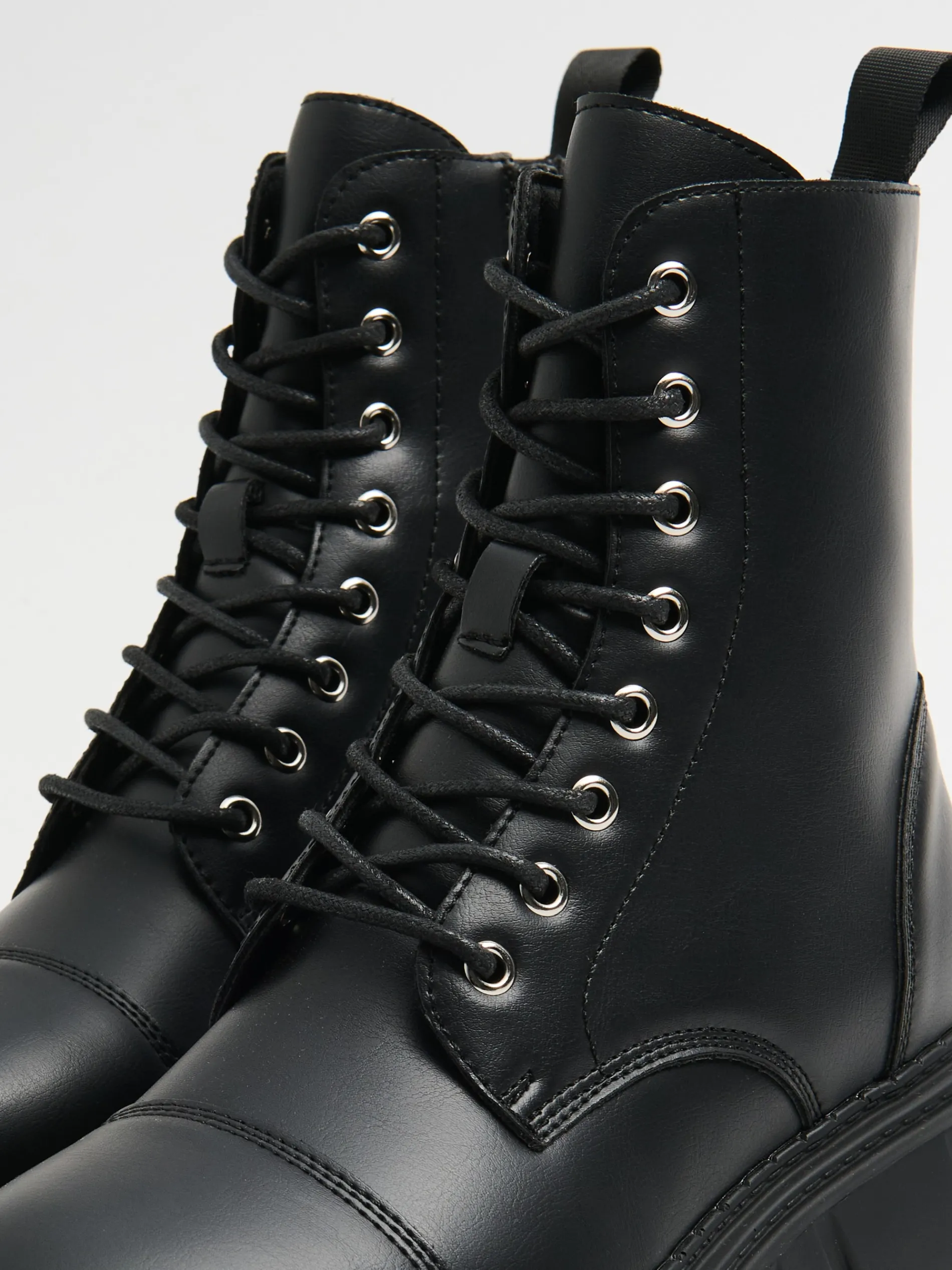 Damskie botki z wysoką cholewką, wykonane z materiału imitującego skórę. Wyposażone w solidne podeszwy, idealne na sezon jesienno-zimowy. botki za kostkę cholewka z imitacji skóry traperowa, masywna podeszwa wiązane na czarne sznurowadła metalowe detale wygodny uchwyt do wkładania i zdejmowania butów