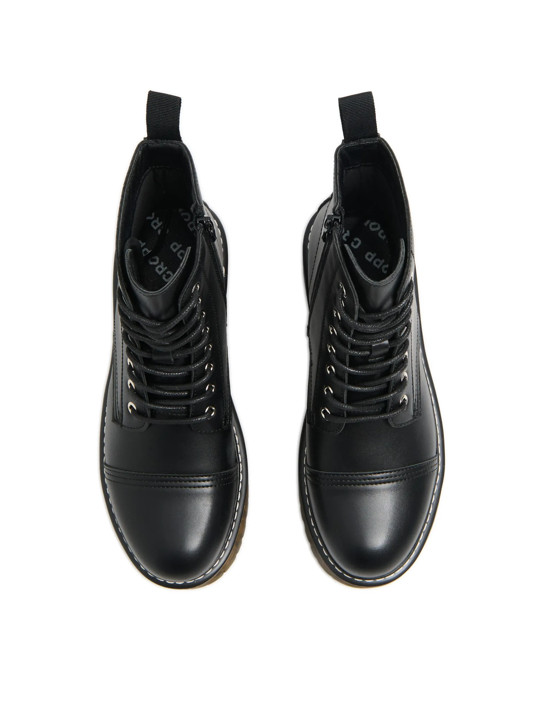 Damskie botki na sezon jesienno-zimowy wykonane z materiału imitującego skórę. Czarne klasyki, które pasują do każdego rodzaju stylizacji. botki za kostkę cholewka z imitacji skóry zapięcie na zamek z boku traperowa podeszwa wykonana z gumy termoplastycznej wiązane na czarne sznurowadła kontrastowe przeszycia metalowe detale wygodny uchwyt do wkładania i zdejmowania butów