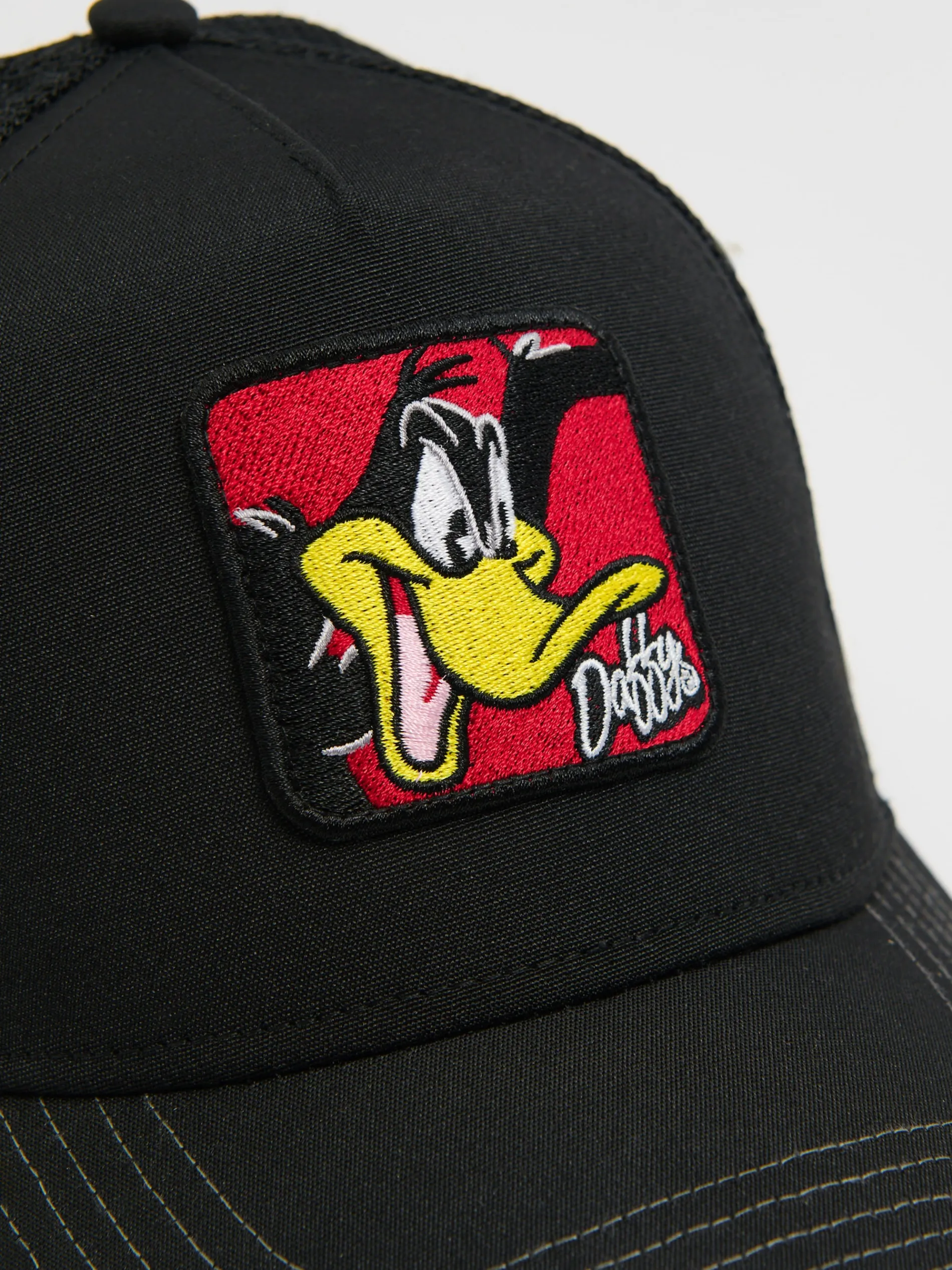 Męska czapka z daszkiem typu truckerka w kolorze czarnym z ozdobną naszywką z jedną z postaci Looney Tunes, Kaczora Daffy. Z tyłu materiał z siateczki mesh, wspomoże Cię szczególnie w upalne dni. Check it! wykonana z łączonych materiałów tył czapki wykonany z siateczki typu mesh możliwość regulacji szerokości obwodu, dzięki zapięciu squatchee, czyli ochronny guzik na szczycie czapki z przodu haft z motywem Looney Tunes naszywka z napisem Cropp LOONEY TUNES and all related characters and elements © & ™ Warner Bros. Entertainment Inc. WB SHIELD: © & ™ WBEI. (s24)