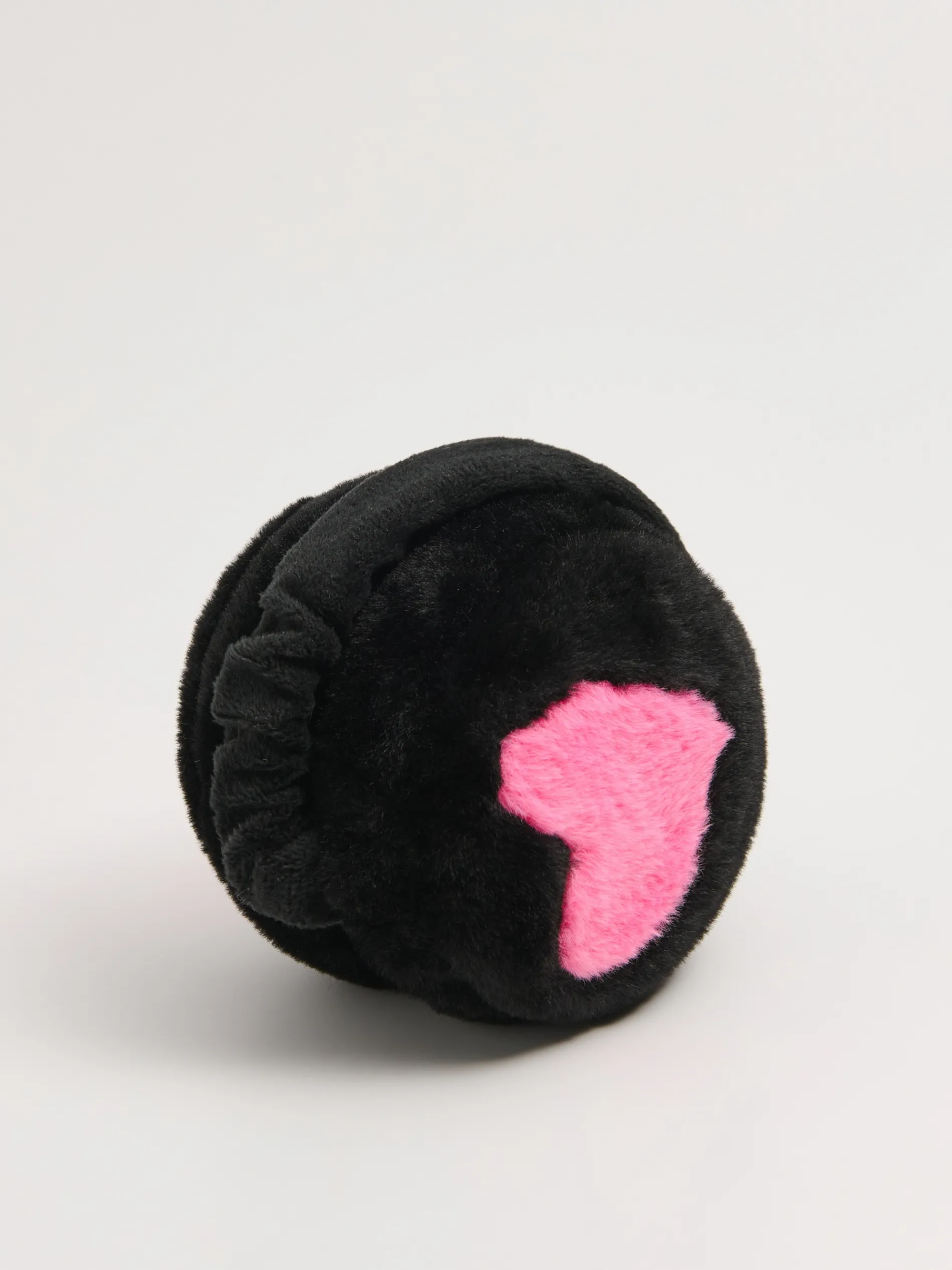 Damskie nauszniki, obszyte przyjemnym w dotyku sztucznym futrem. Item po złożeniu zajmuje mało miejsca w torebce. Możesz mieć je zawsze pod ręką! uszyte z puszystej, miękkiej w dotyku dzianiny możliwość regulacji pałąka ozdobne naszywki z tego samego materiału w kształcie serc